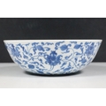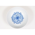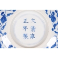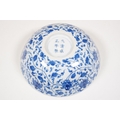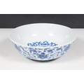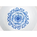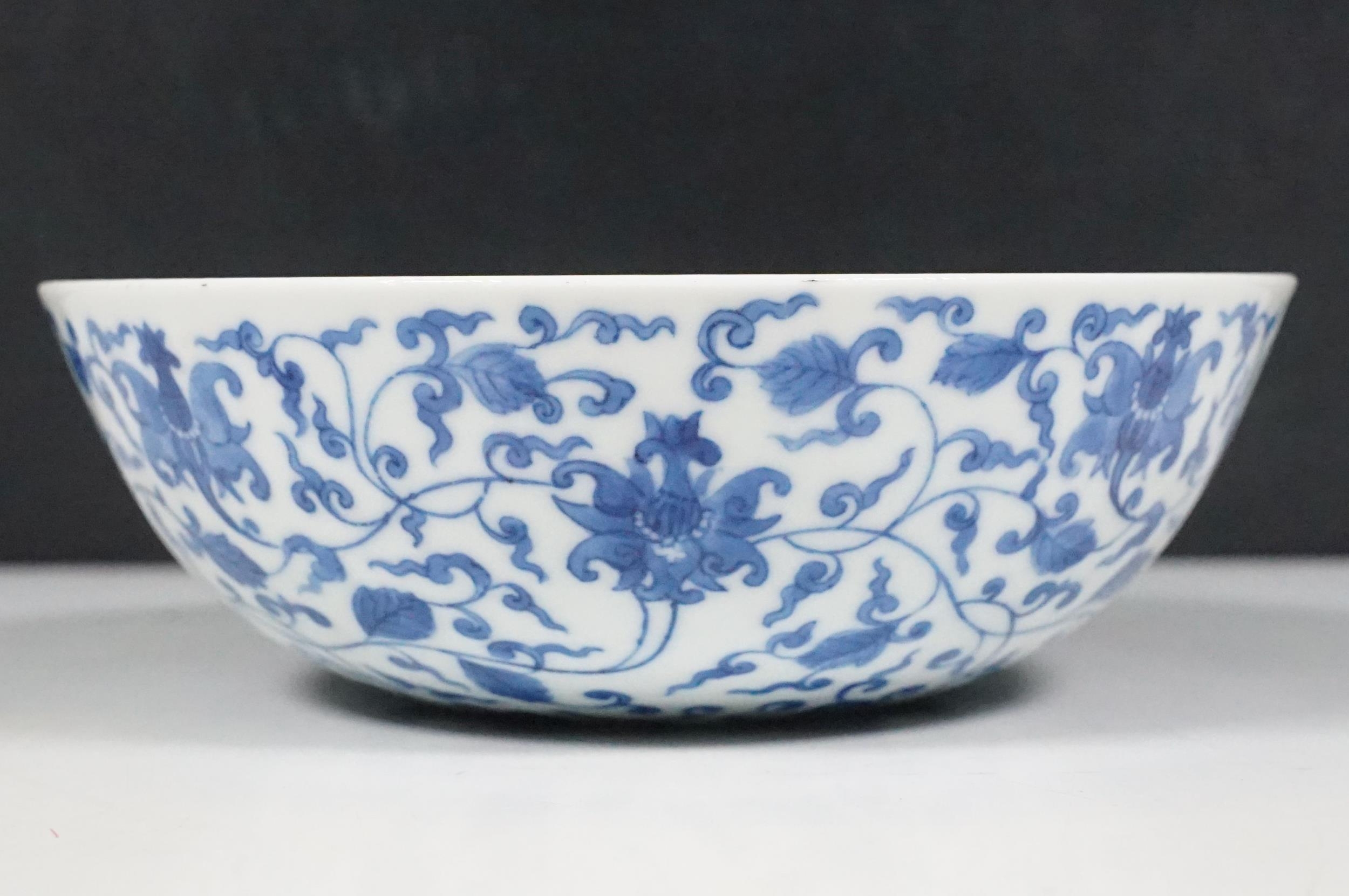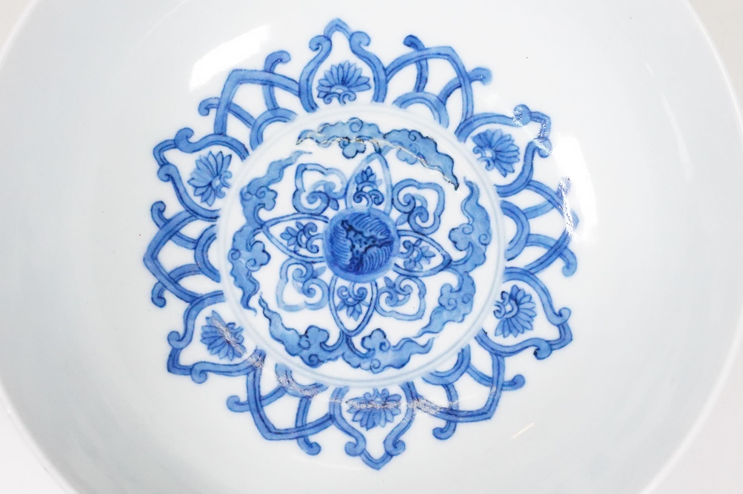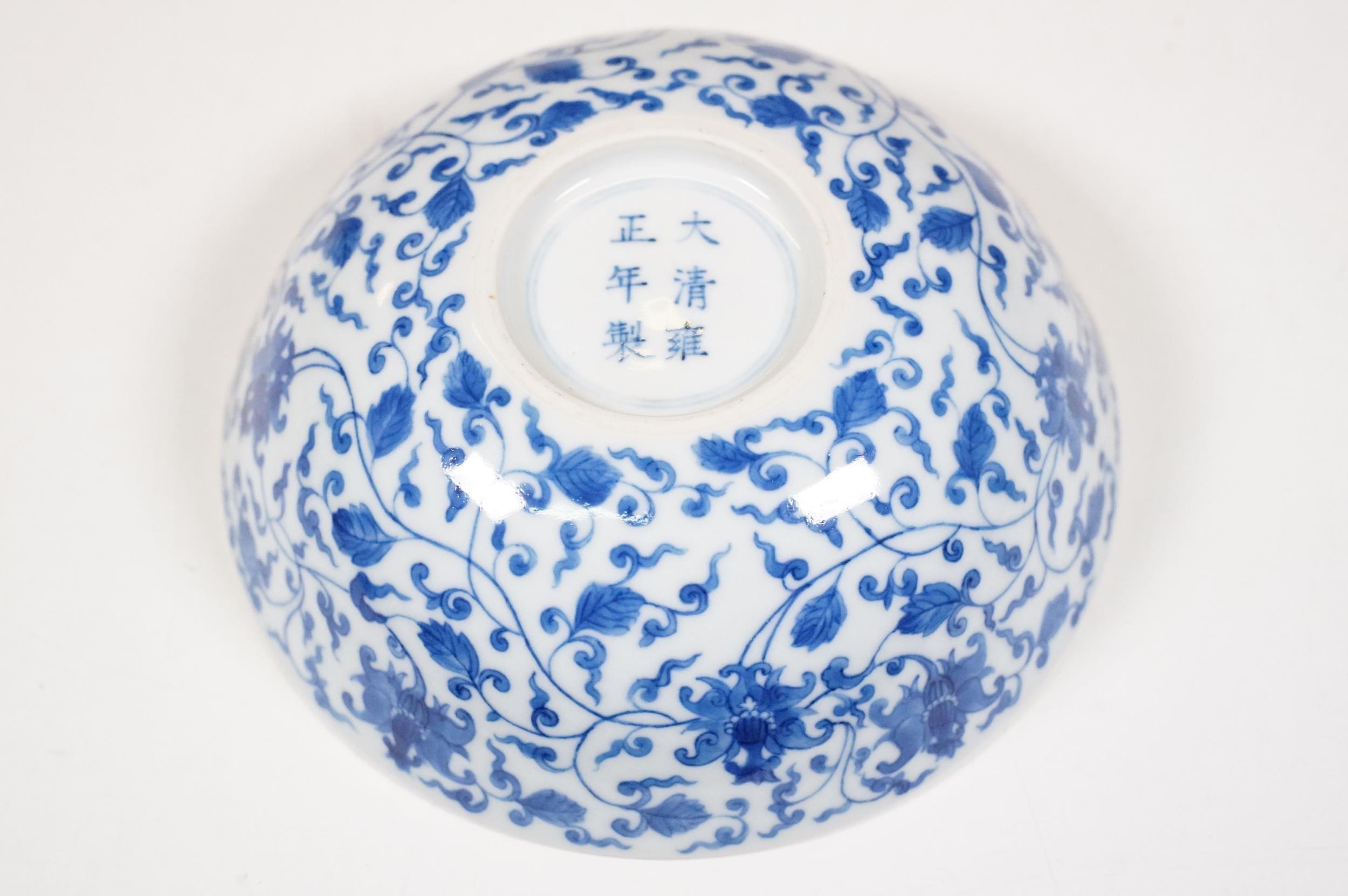 18th century Chinese blue and white bowl with floral outer detailing and inner pattern design, Yongzheng character mark to base, 15.5cm diameter