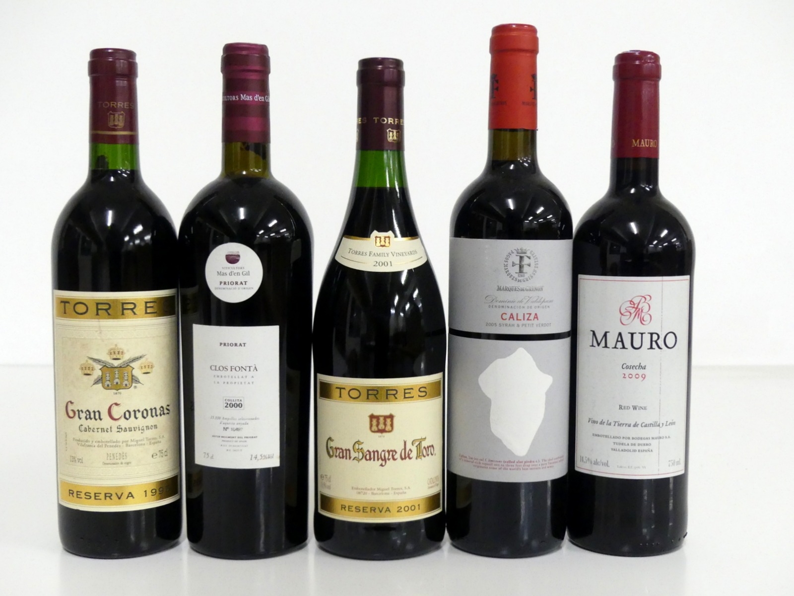 1 bt Torres Gran Coronas Cabernet Sauvignon Reserva 1995 Penedés i.n 1 bt Clos Fonta 2000 Priorat ts 1 bt Torres Gran Sangre de Toro Reserva 2001 ts 1 bt Marques de Griñon Caliza 2005 Domino de Valdepusa i.n 1 bt Mauro Vino de la Tierra de Castilla y Leon 2009 i.n Above 5 bottles