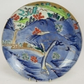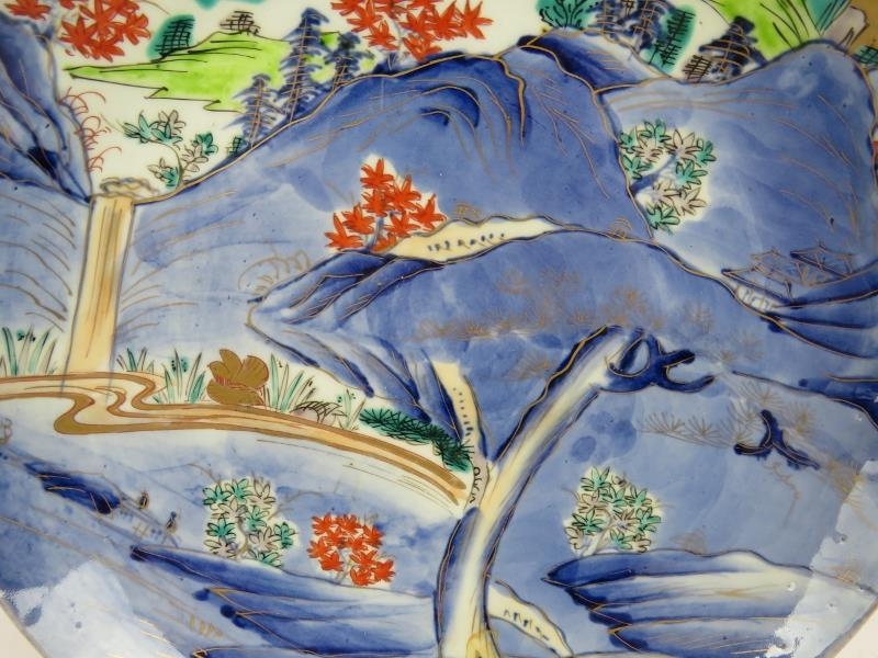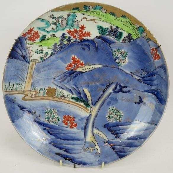 A Japanese Meiji period porcelain charger with hand decorated landscape scene and gilt details. Diameter 31cm.