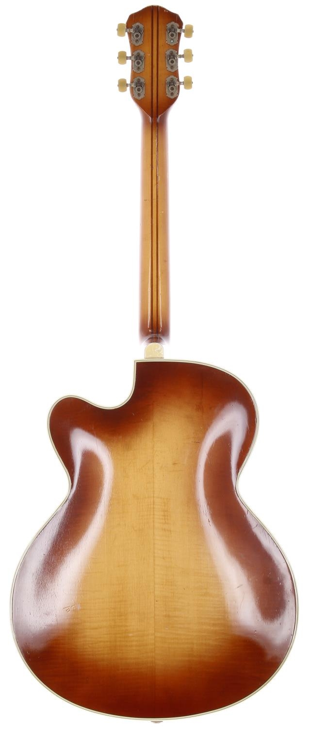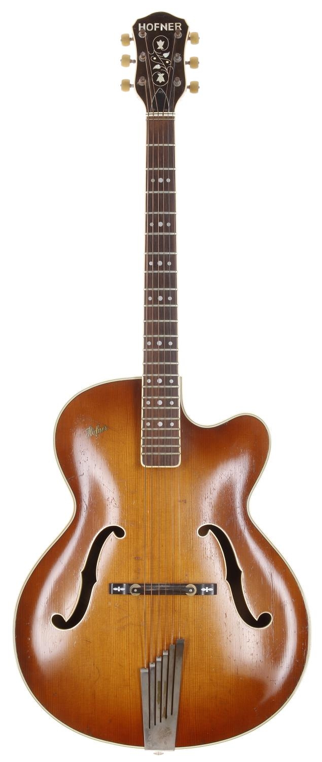 1960 Hofner President archtop guitar, made in Germany; Body: brunette finish maple back and sides and spruce top, scratches and dings throughout but generally acceptable for age; Neck: generally good, minor finish dings; Fretboard: rosewood; Frets: light wear; Electrics: working, later fitted K&K under-saddle pickup; Case: period hard case; Weight: 2.07kg; Overall condition: good for age