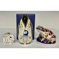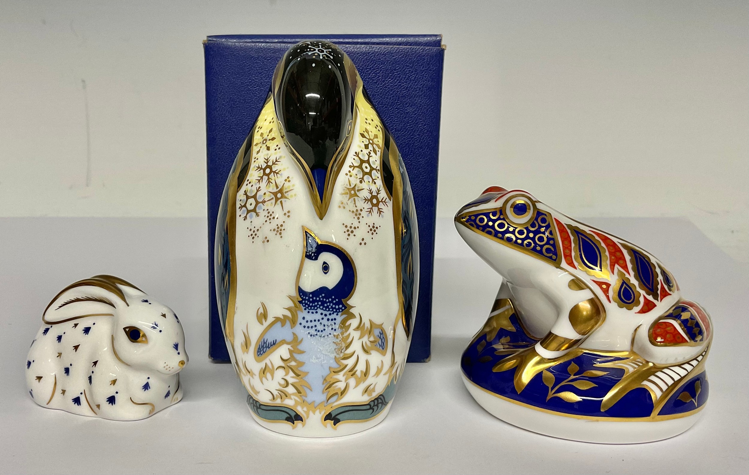 A Royal Crown Derby paperweight, Penguin and Chick, silver stopper, 13cm, boxed; others, Frog, gold stopper, 8cm high, printed mark in red; Baby Rabbit, gold stopper, 7cm long, printed mark in red (3)