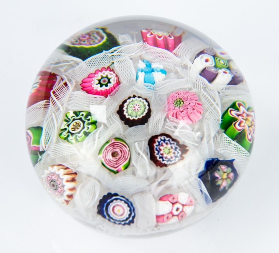CLICHY SPACED MILLEFIORI GLASS PAPERWEIGHT ON A WHITE LATTICINIO LACE GROUND, 2 ¼” (5.7cm) high, 2 ¾” (7cm) diameter C/R- two bad scratches to the top, not central, numerous smaller scratches and nicks, mostly noted to the sides