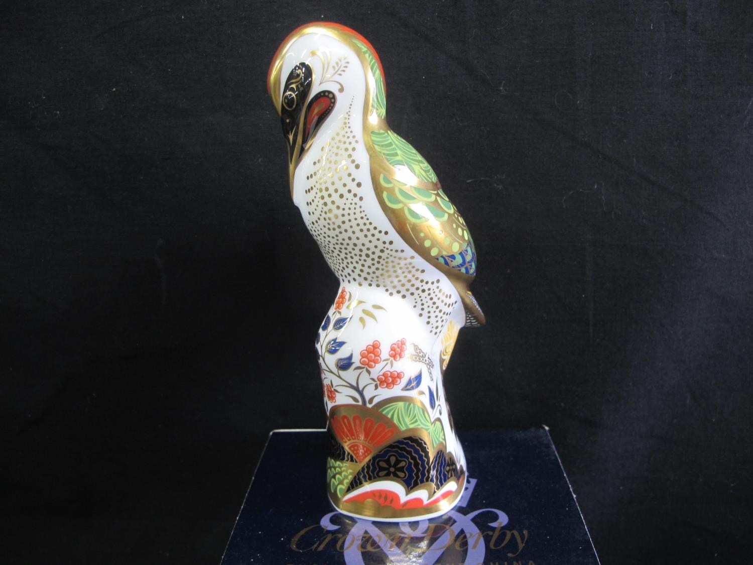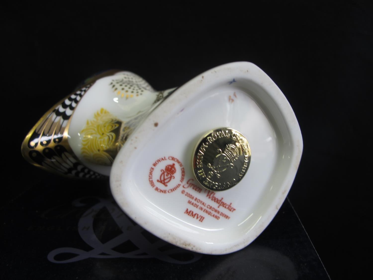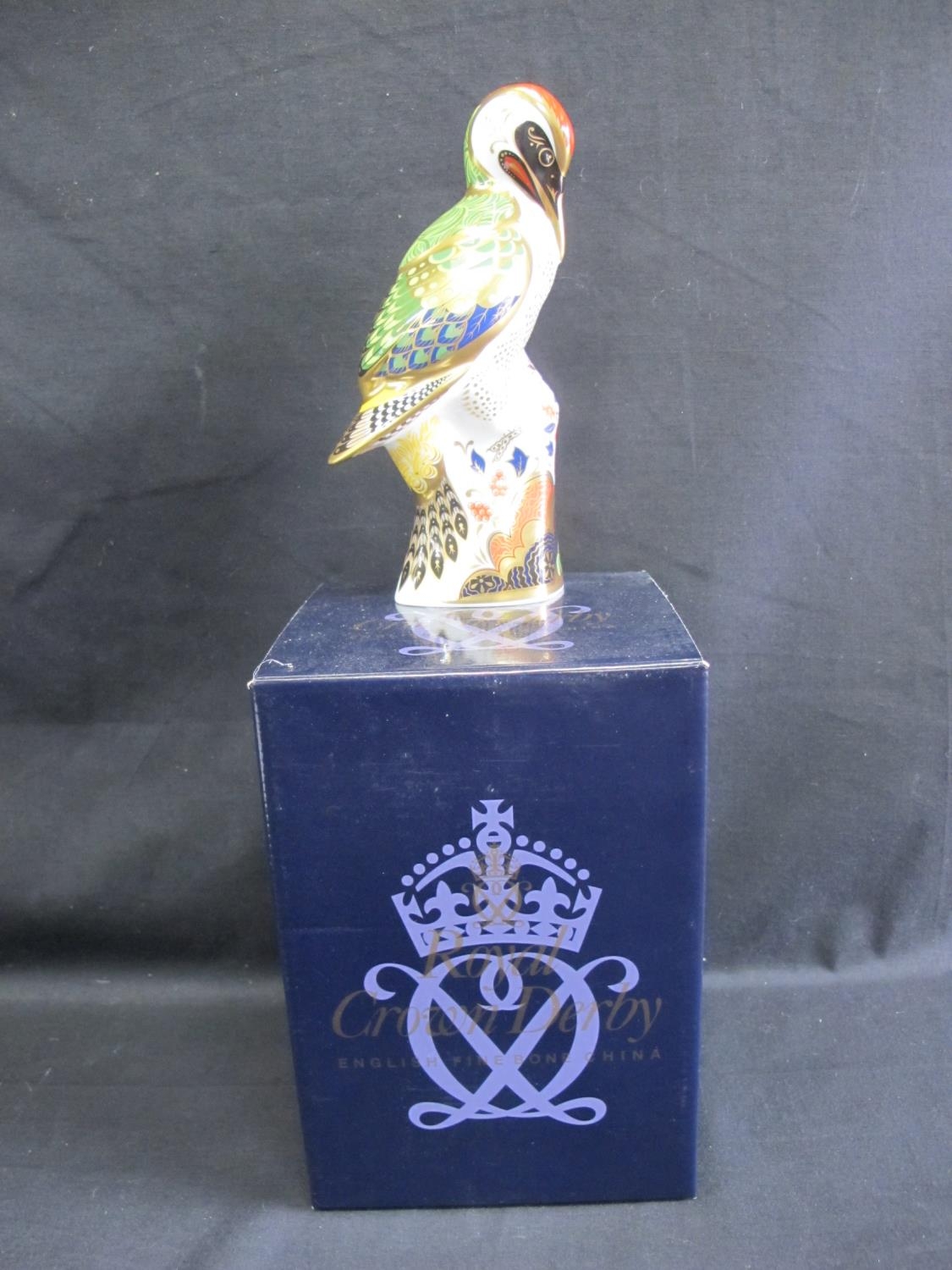 Royal Crown Derby paperweight of a Green Woodpecker with gold stopper, complete with box - 17cm tall