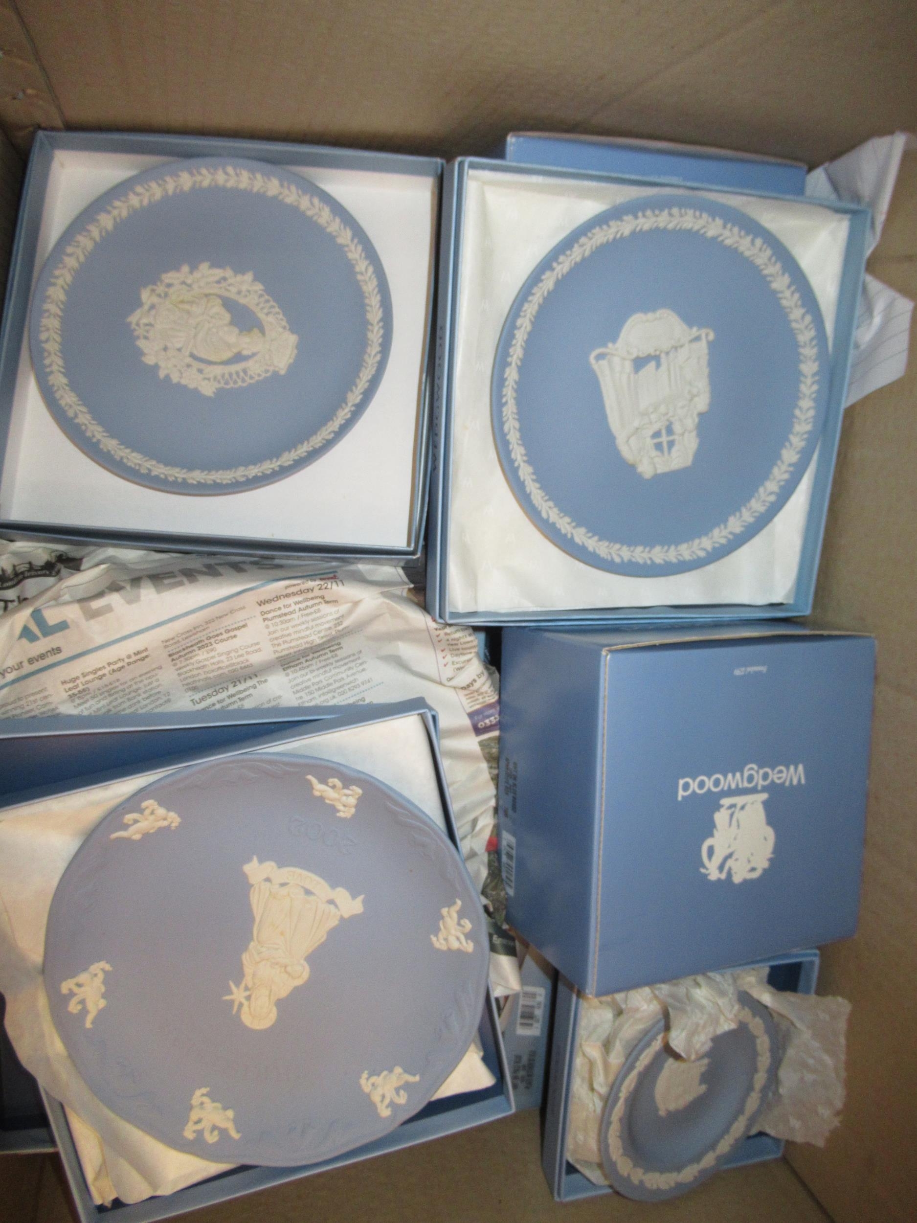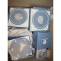 Box containing a collection of various modern Wedgwood blue and white Jasperware, mainly in original boxes