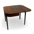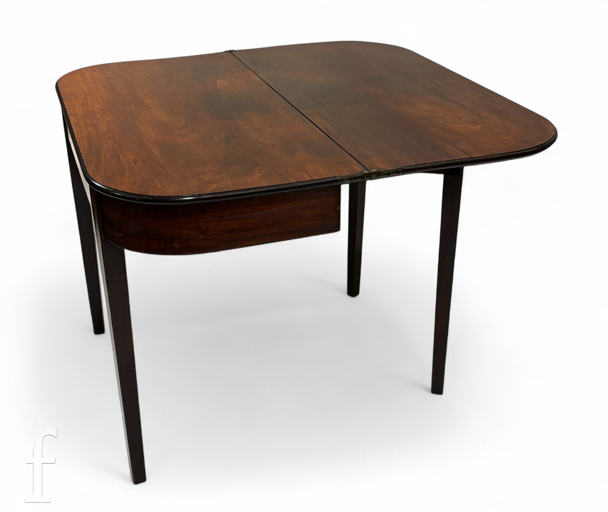 A George III mahogany fold-over tea table over square tapered legs, with diamond shaped inlaid paterae to the apron and chequered strung border, height 74cm, width 94cm and depth 48cm (96cm when open), slight damage.