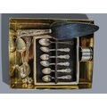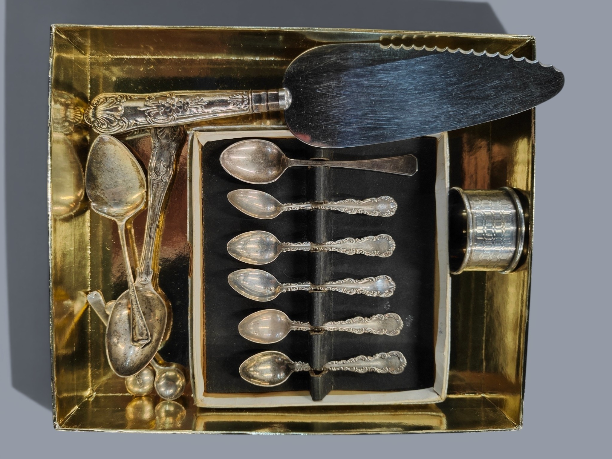 SILVER SPOONS, NAPKIN RINGS AND SILVER HANDLE CAKE KNIFE
