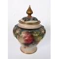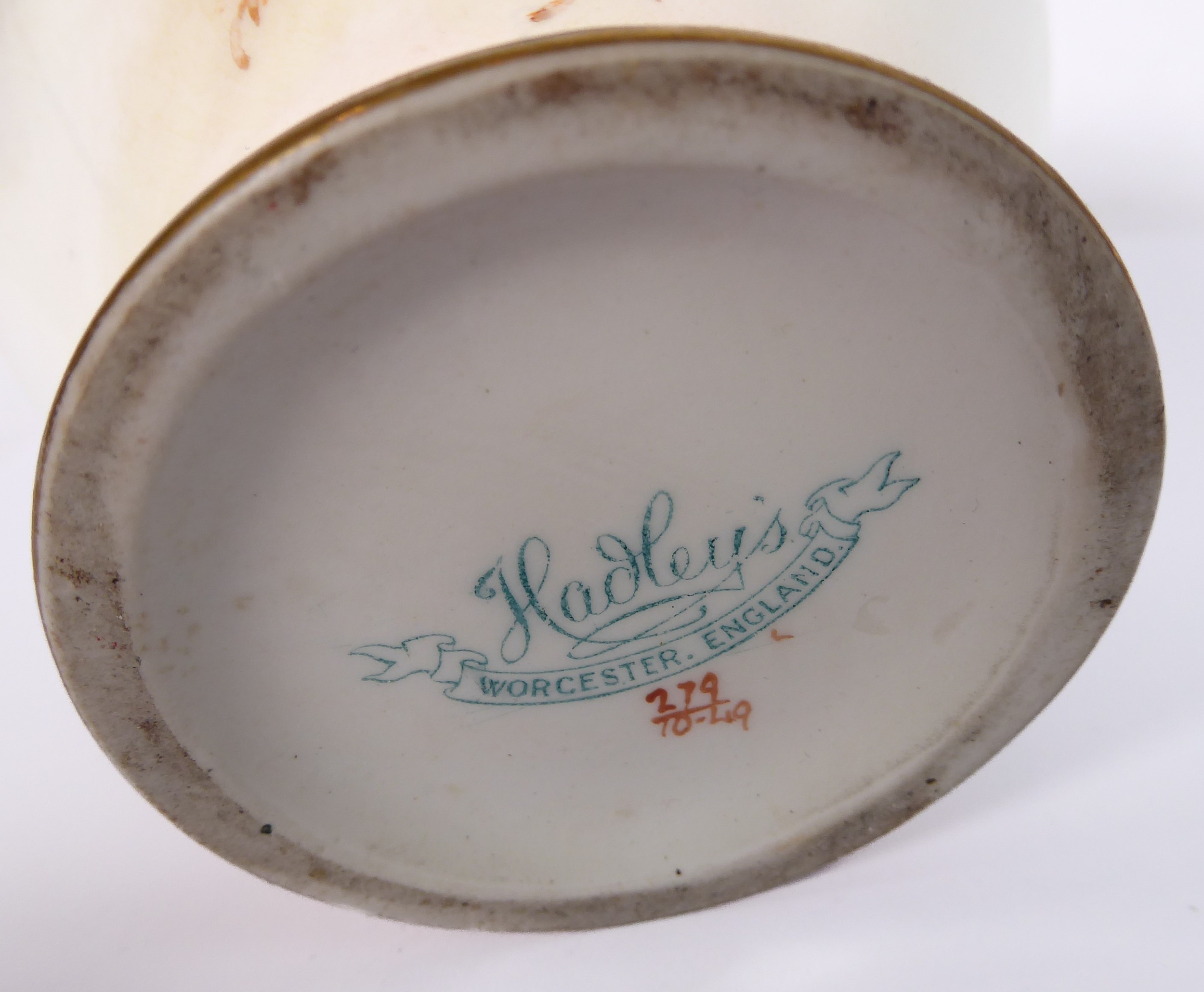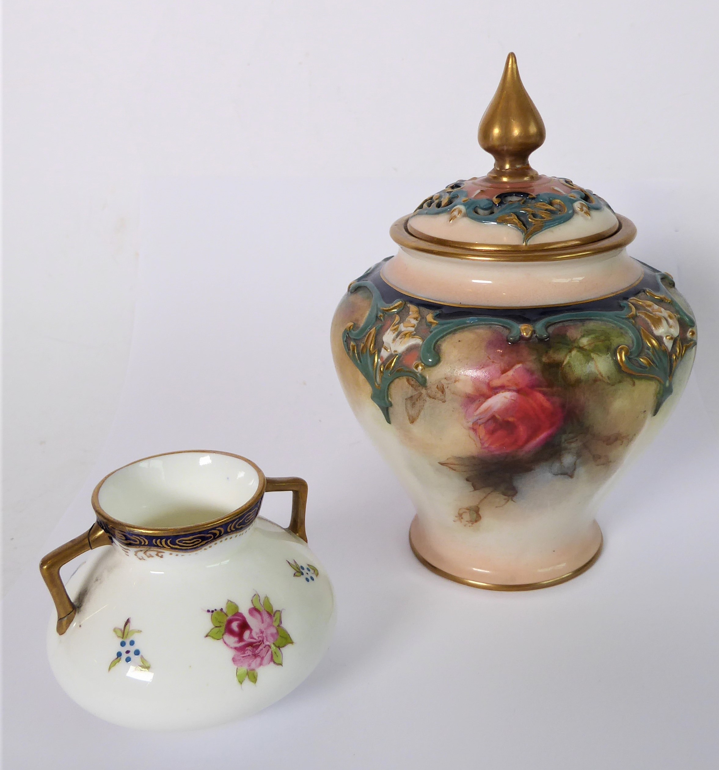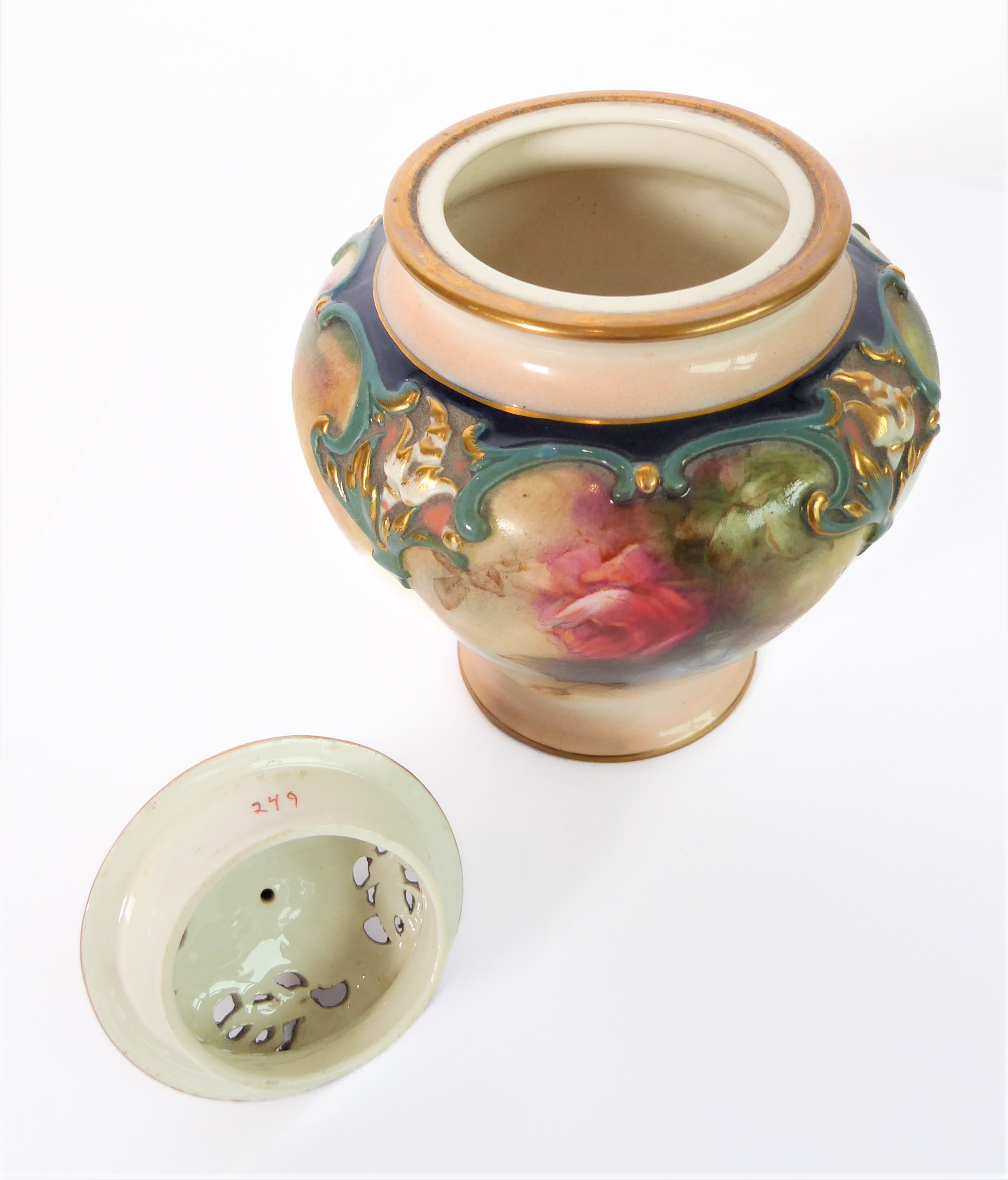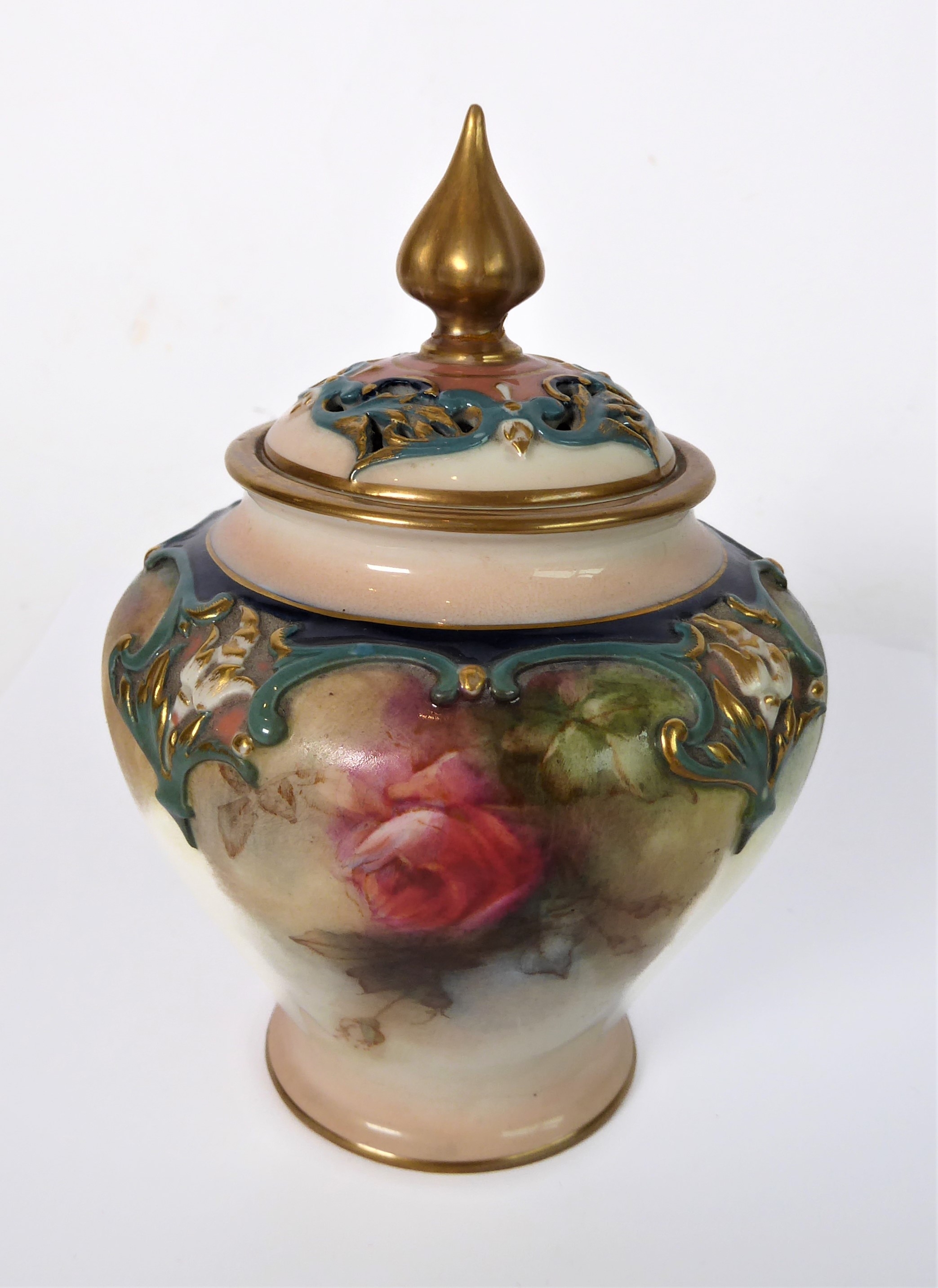 1. an early 20th century Hadley's (Worcester, England) porcelain potpourri of tapering form, decorated with roses, the pierced cover with a gilded pointed finial, (12 cm high).