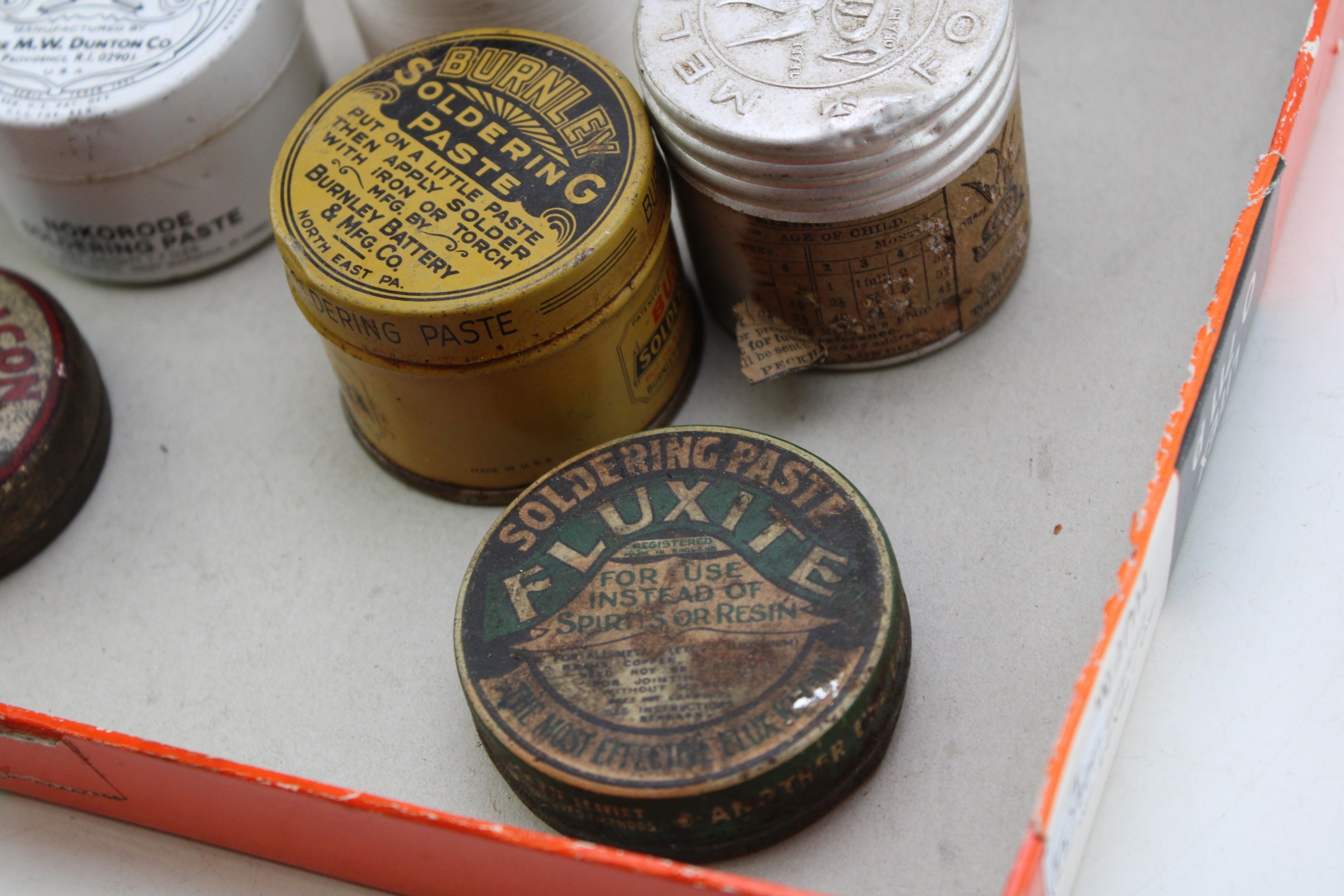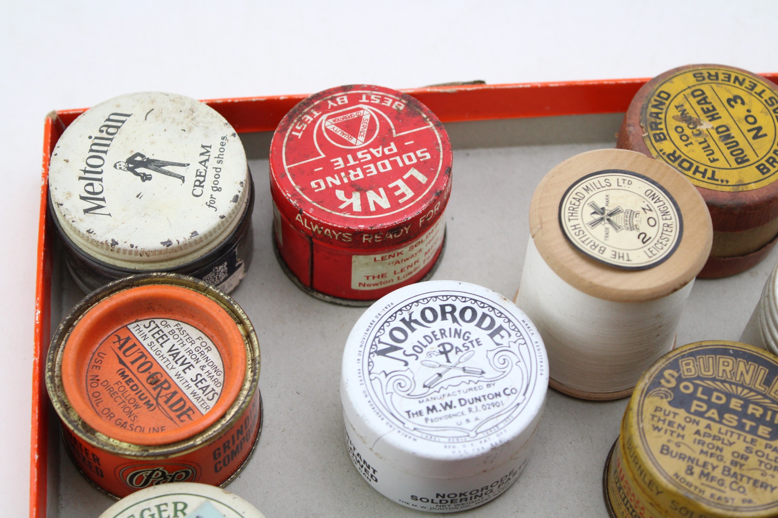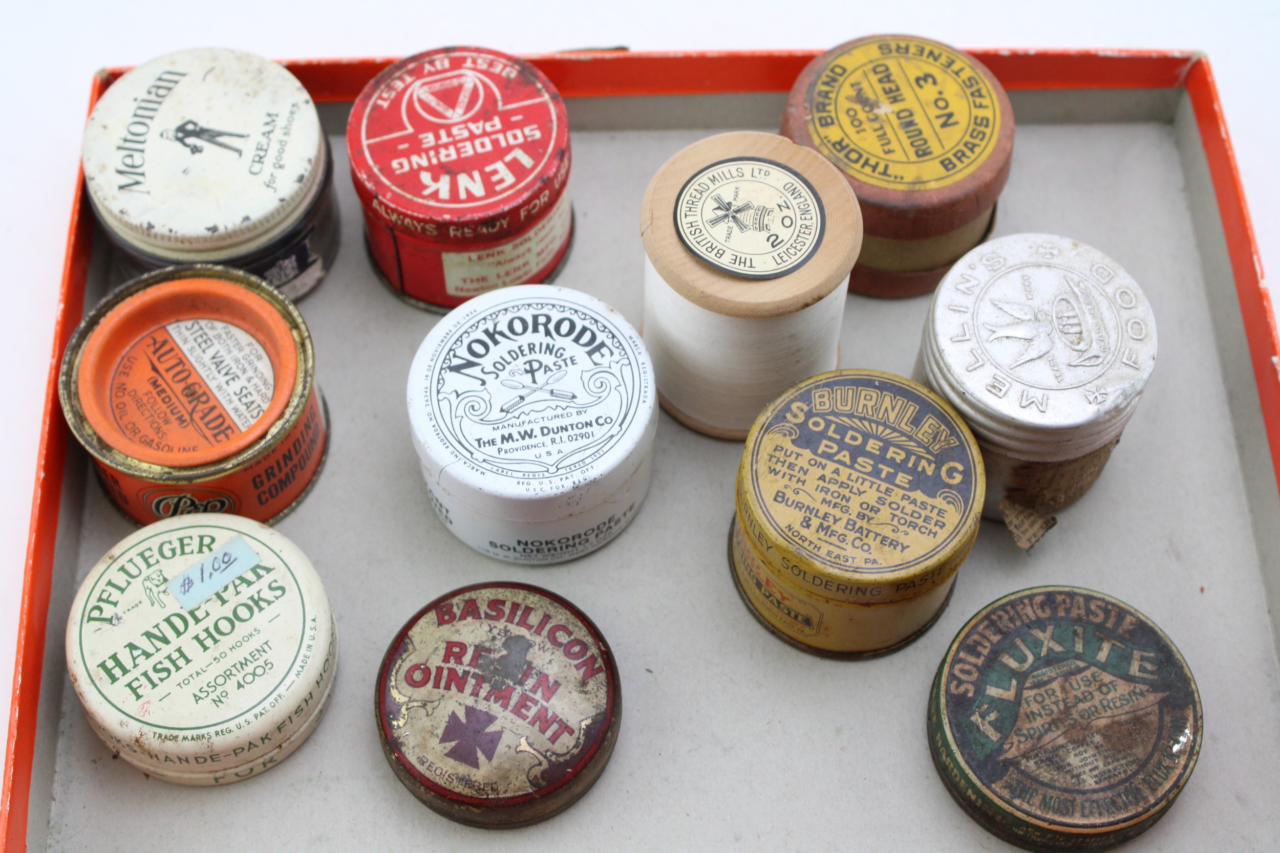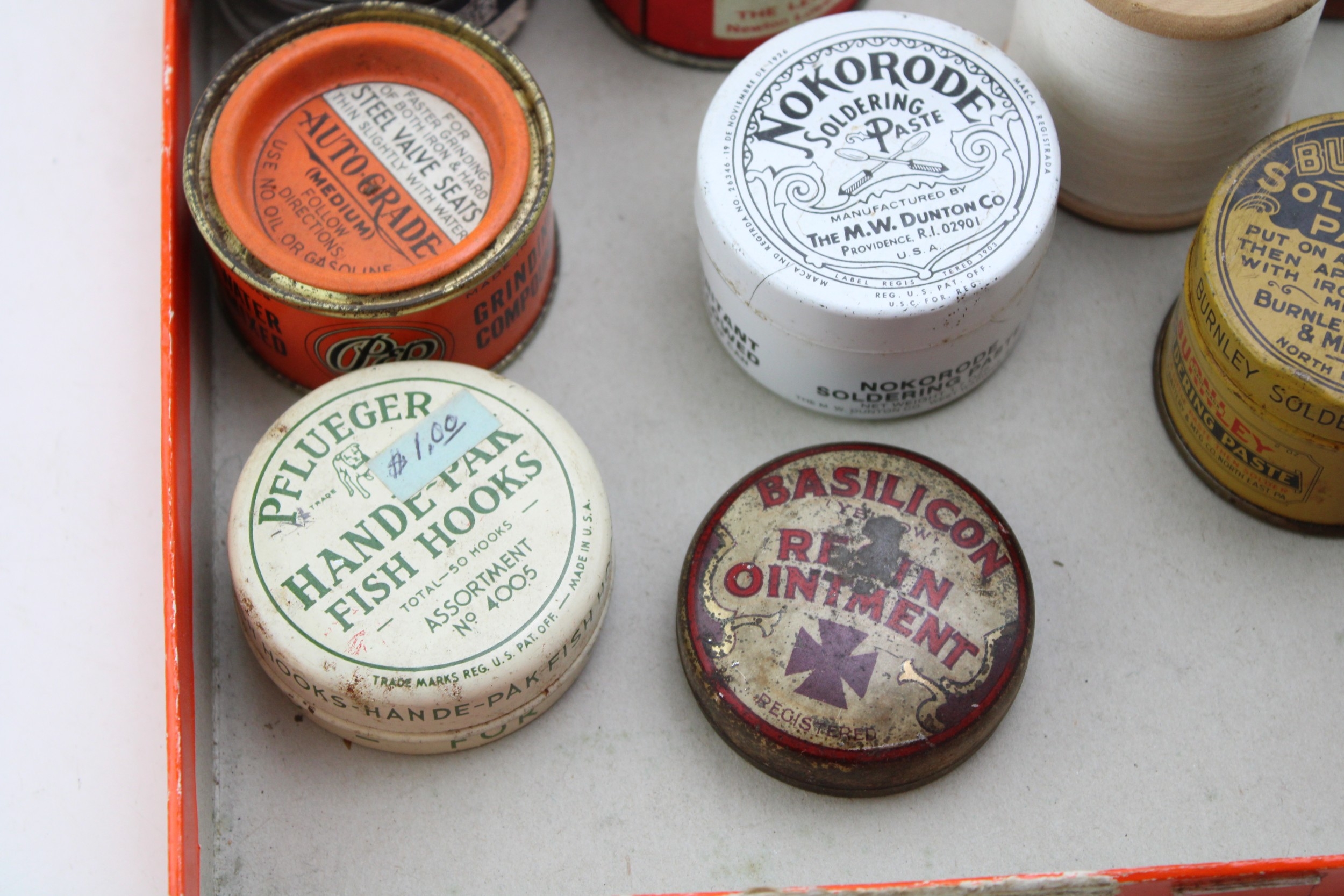 A collection of early 20th century advertising tins and jars to include, Pflueger Hande-Par Fish Hooks, Pep Grinding Compound, Nokorode Soldering Paste together with other similar examples, (Qty).