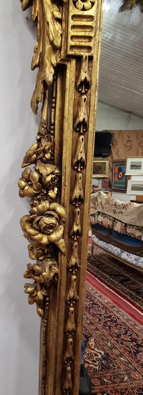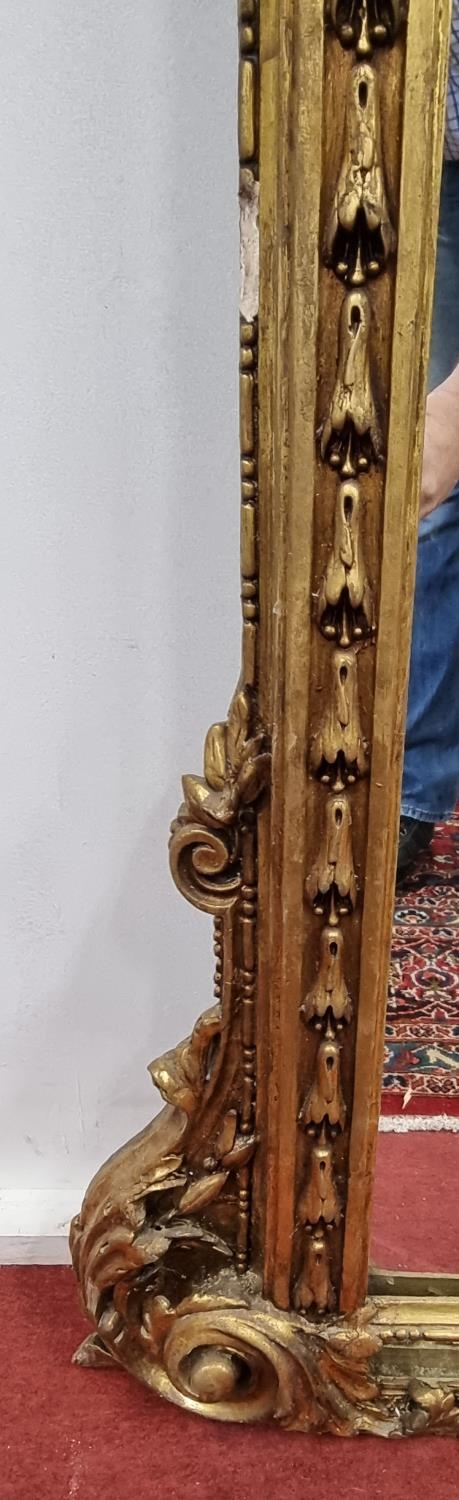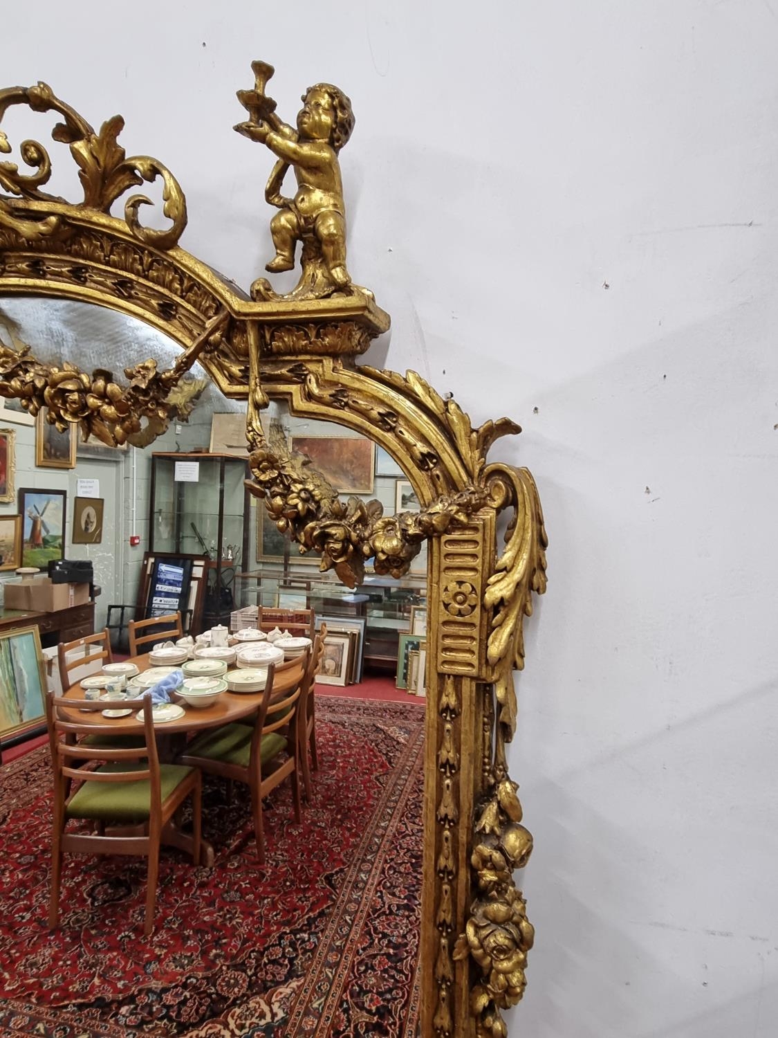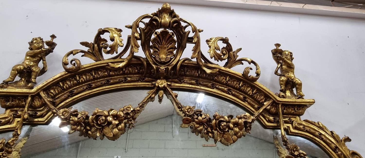 A fabulous Timber and plaster Gilt overmantel Mirror with a highly molded outline, highly molded pediment cartouche top flanked by a pair of Cherubs. Height 220 x W 170 cm approx.