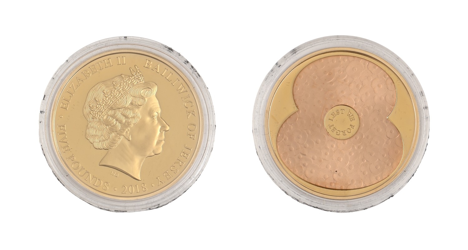Gold coin. Jersey, proof commemorative Five Pounds 2018, obv. selective red gold (39.94g)