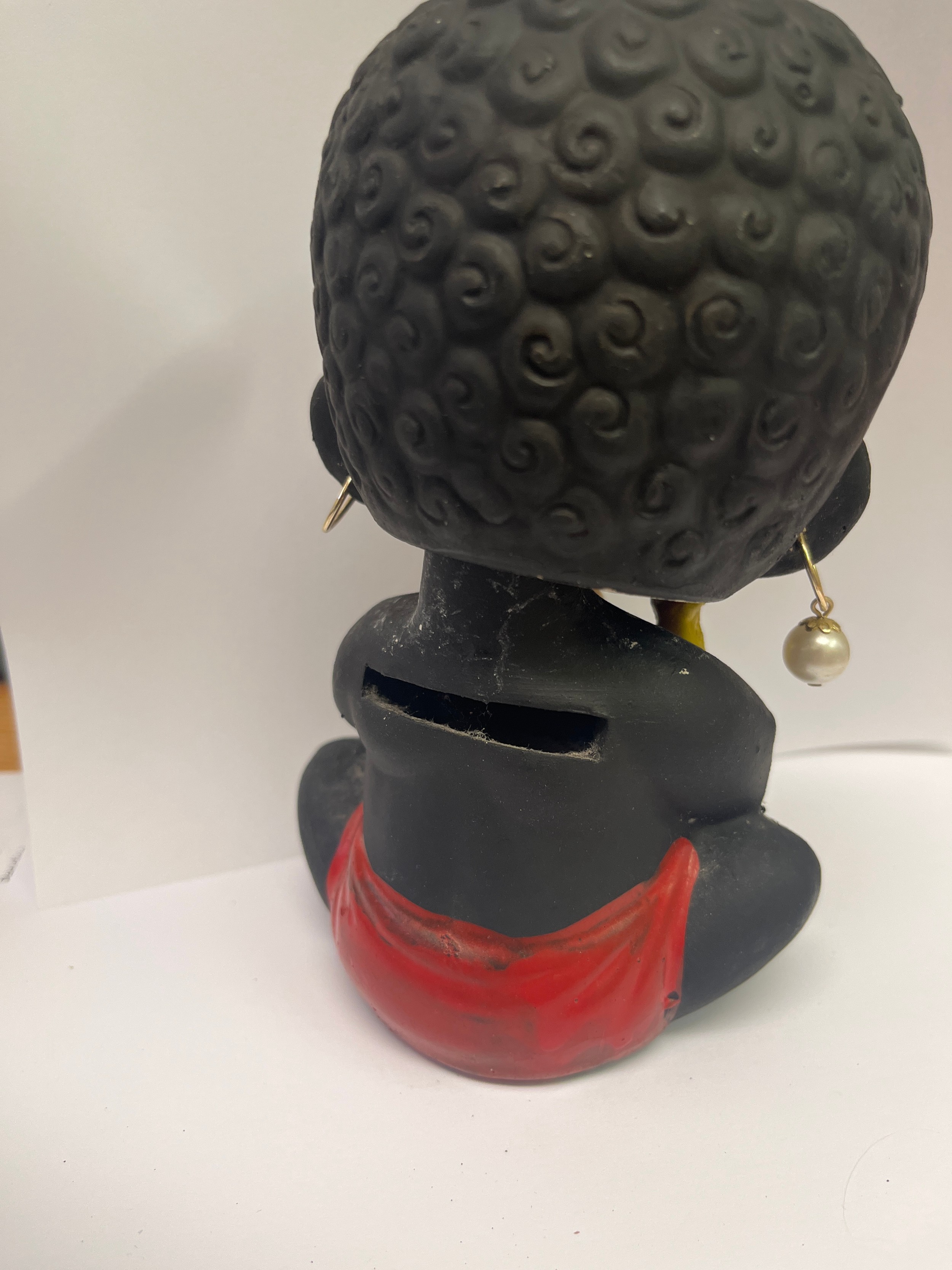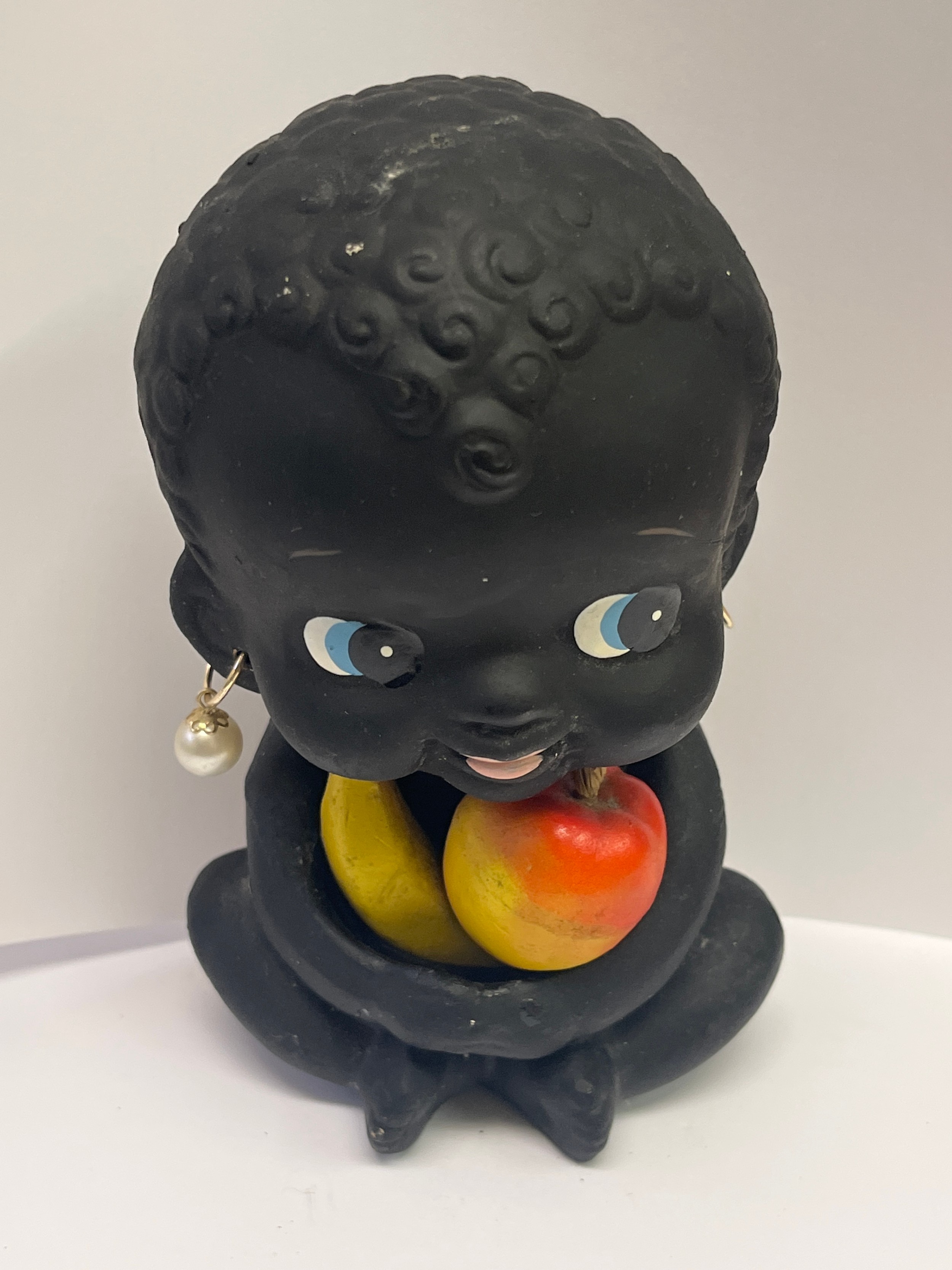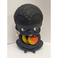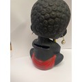 A VINTAGE BLACK NODDING HEAD DOLL MONEY BOX HOLDING FRUIT