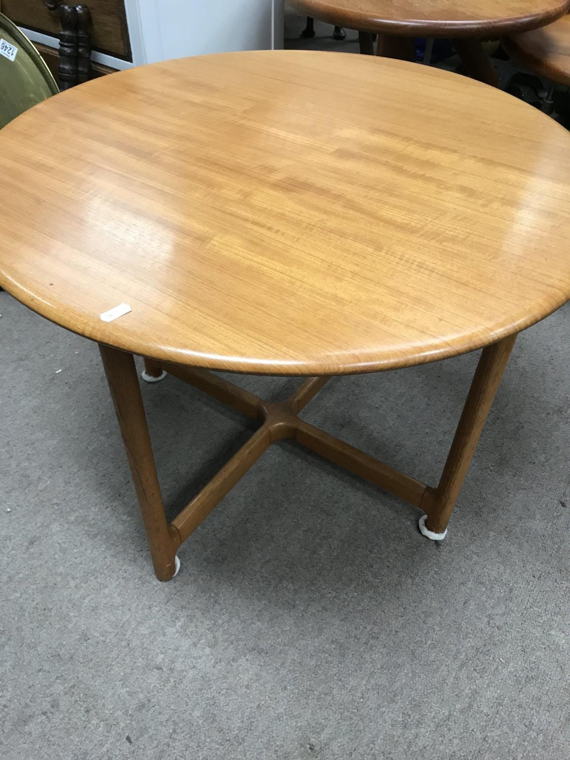 A Norwegian circular occasion table the tapering legs United by x frame stretchers