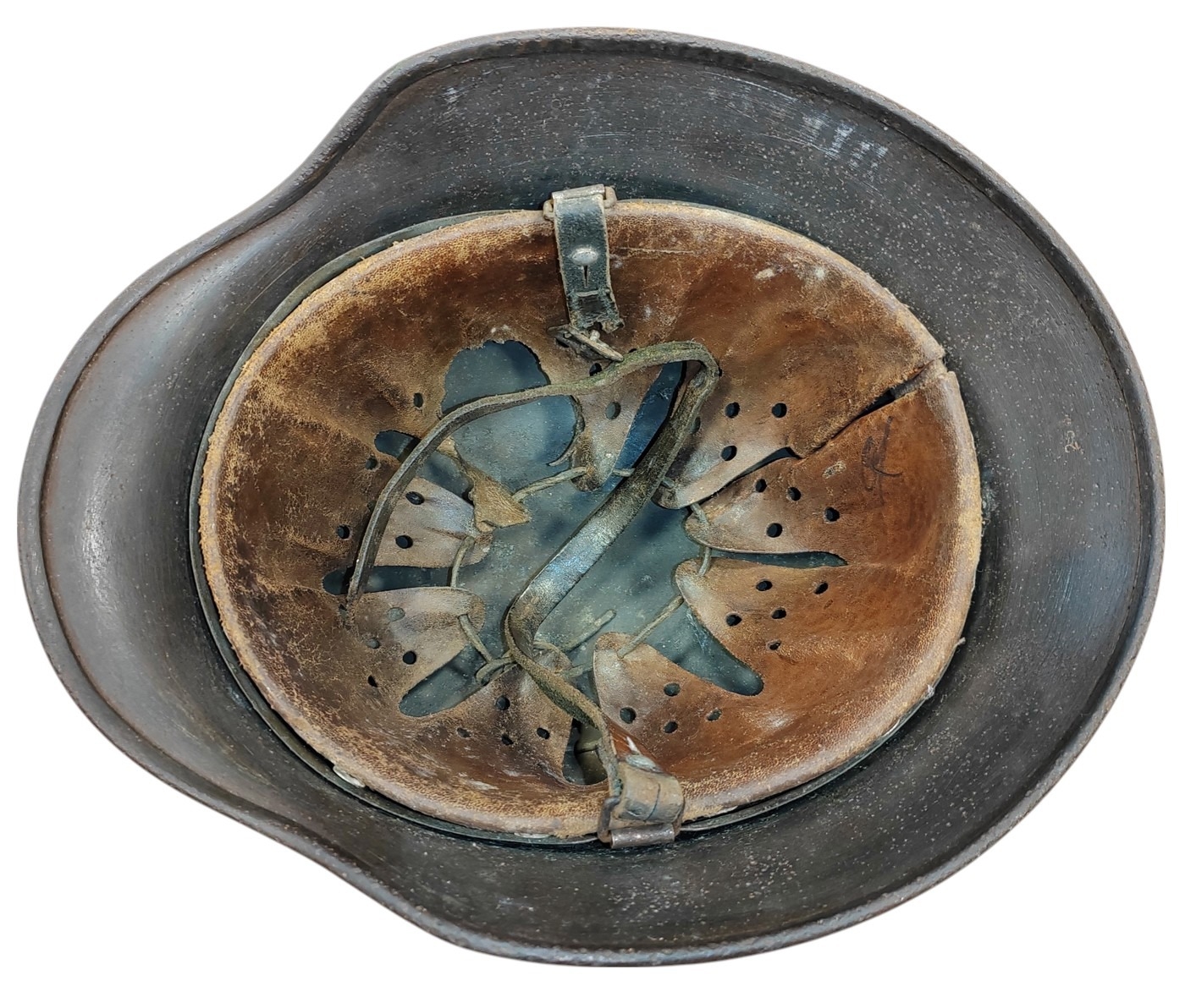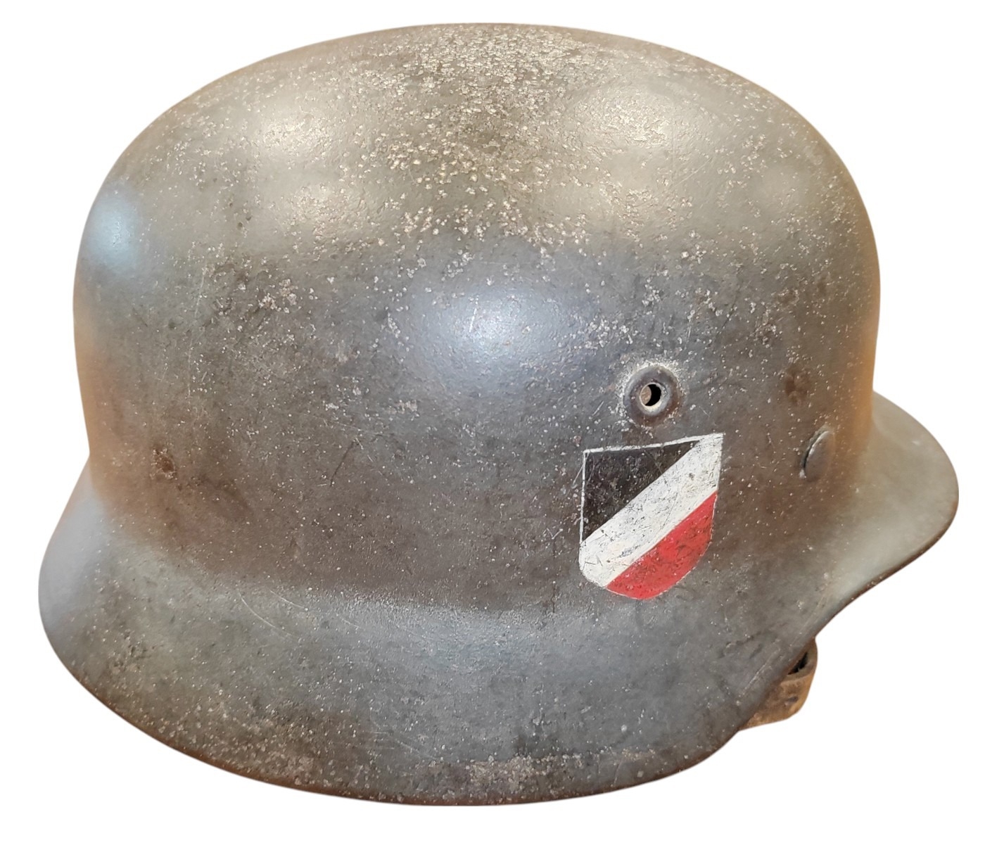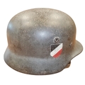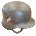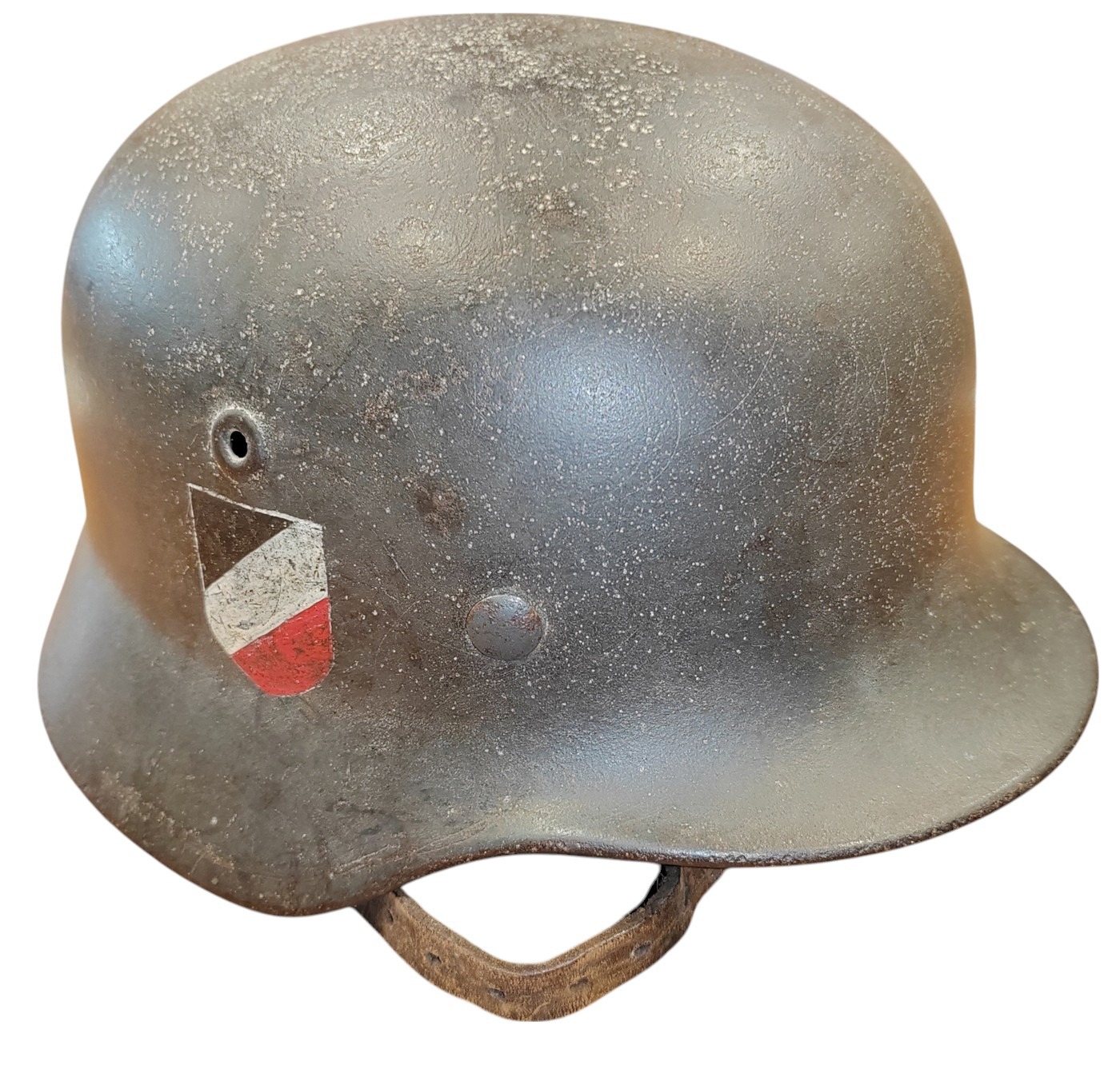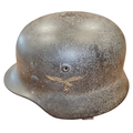 WW2 German Army M-35 Pattern double decal steel combat helmet, complete with lining and strap, original tri-colour decal and German army decal, both decals about 90% present, under rear skirt marked 258, inner leather discoloured/worn with some tears, pitting to helmet otherwise fine example. (½B)