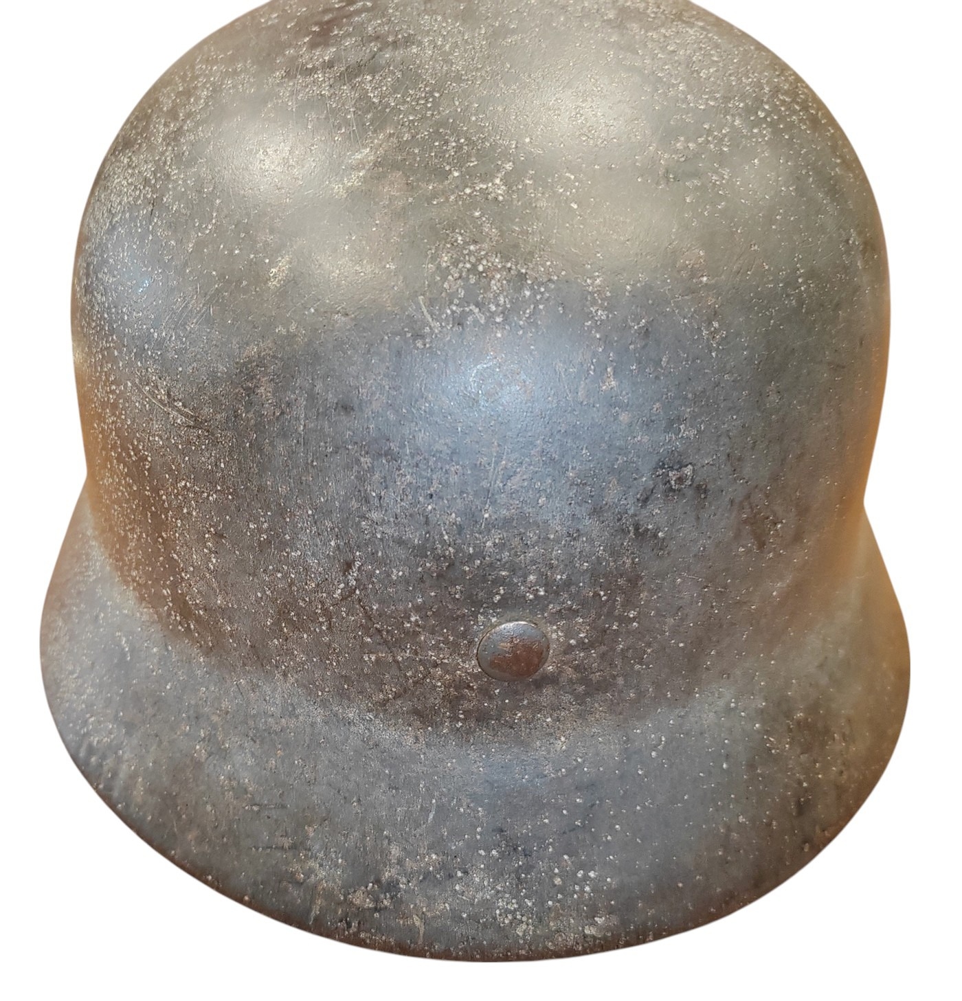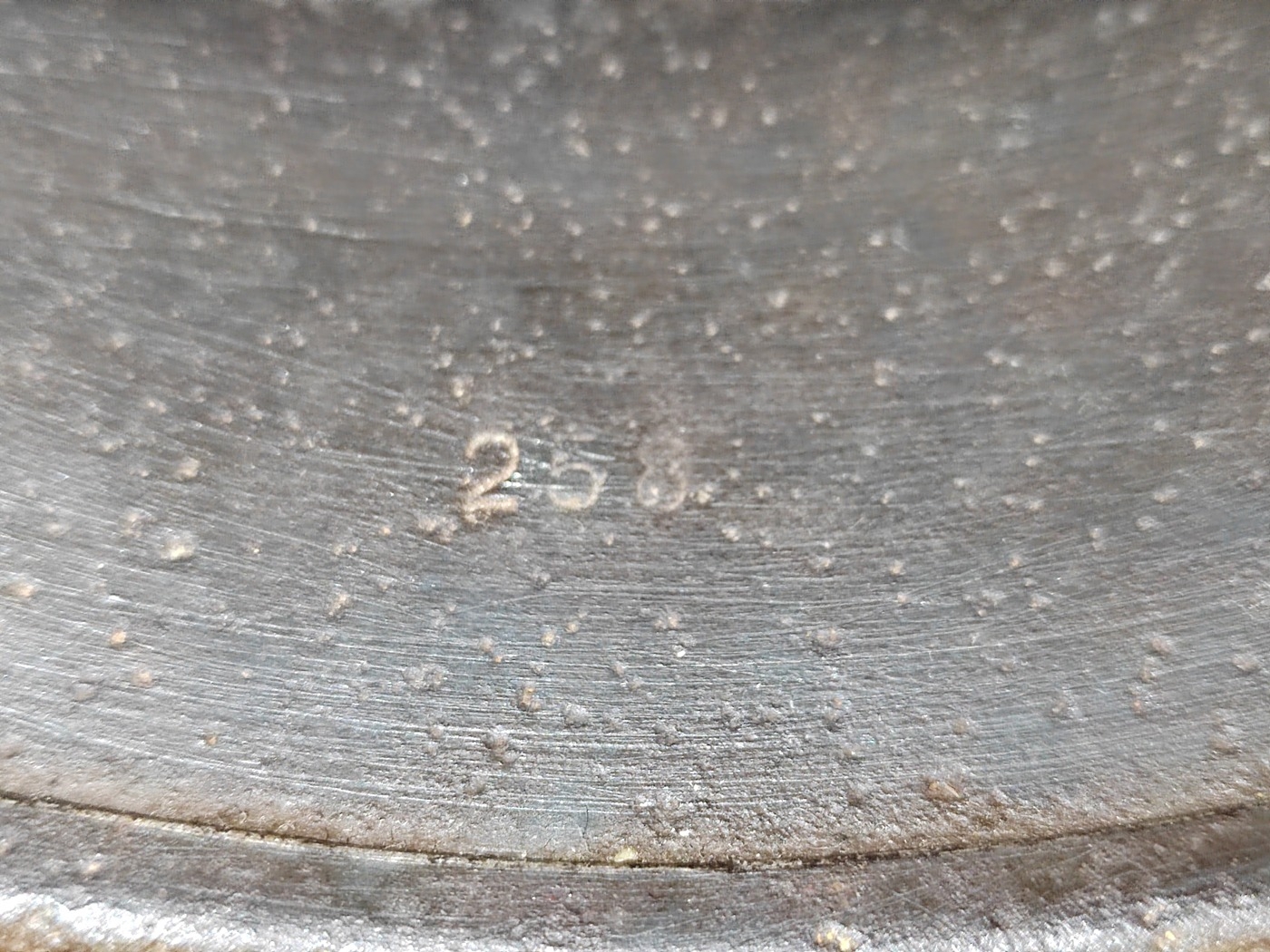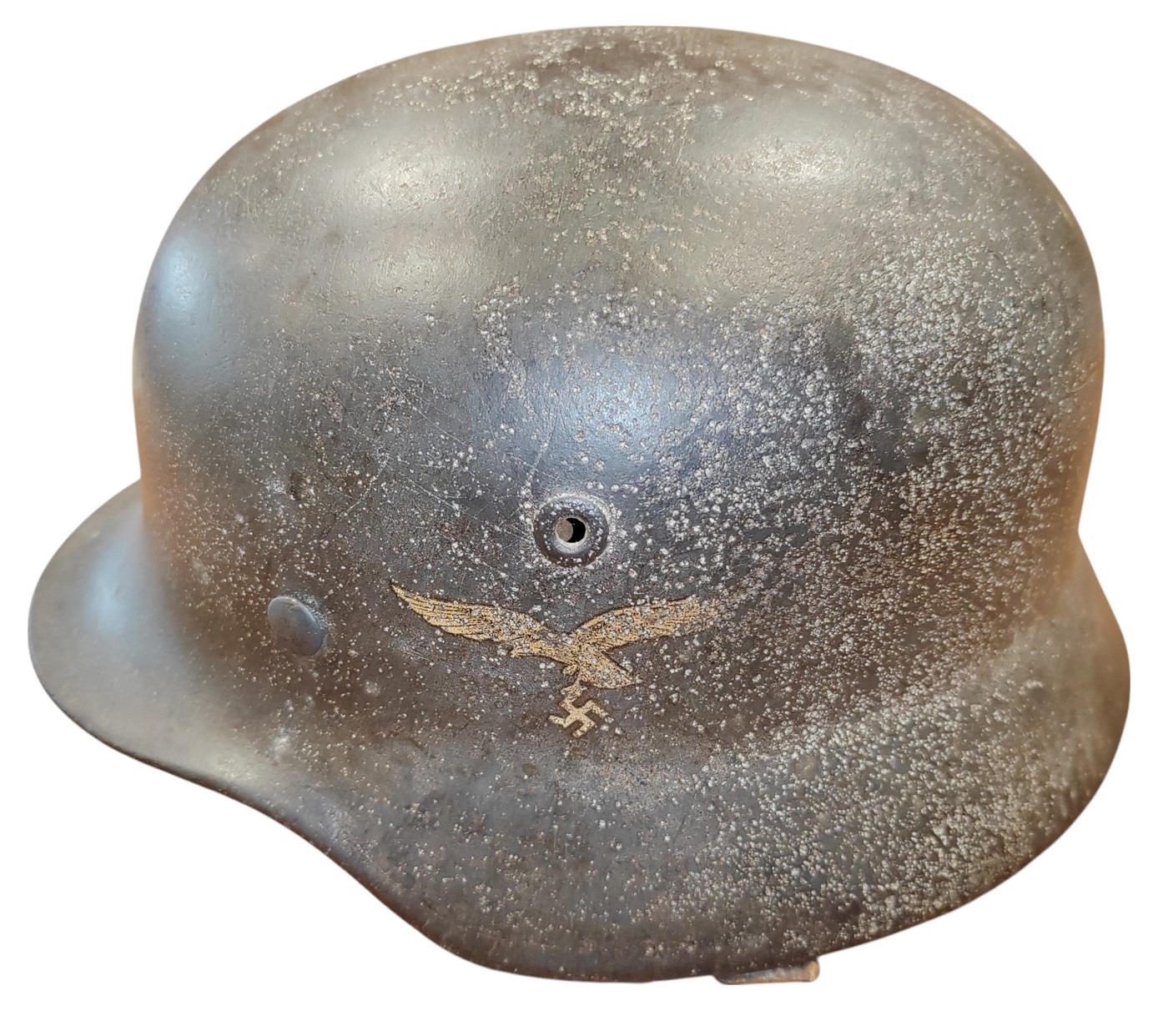 WW2 German Army M-35 Pattern double decal steel combat helmet, complete with lining and strap, original tri-colour decal and German army decal, both decals about 90% present, under rear skirt marked 258, inner leather discoloured/worn with some tears, pitting to helmet otherwise fine example. (½B)