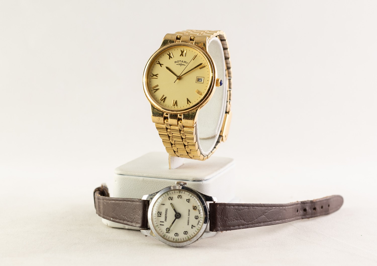 GENT'S QUARTZ WRISTWATCH with circular roman dial, centre seconds hand and date aperture, gold plated circular case and integral link strap, stone set crown and a LADY'S INGERSOL SWISS MADE WRISTWATCH with metal case, leather strap (2), (c/r Gent's watch good but not going; lady's watch worn and not working)