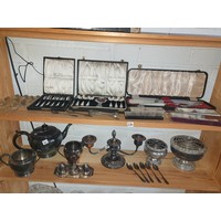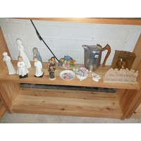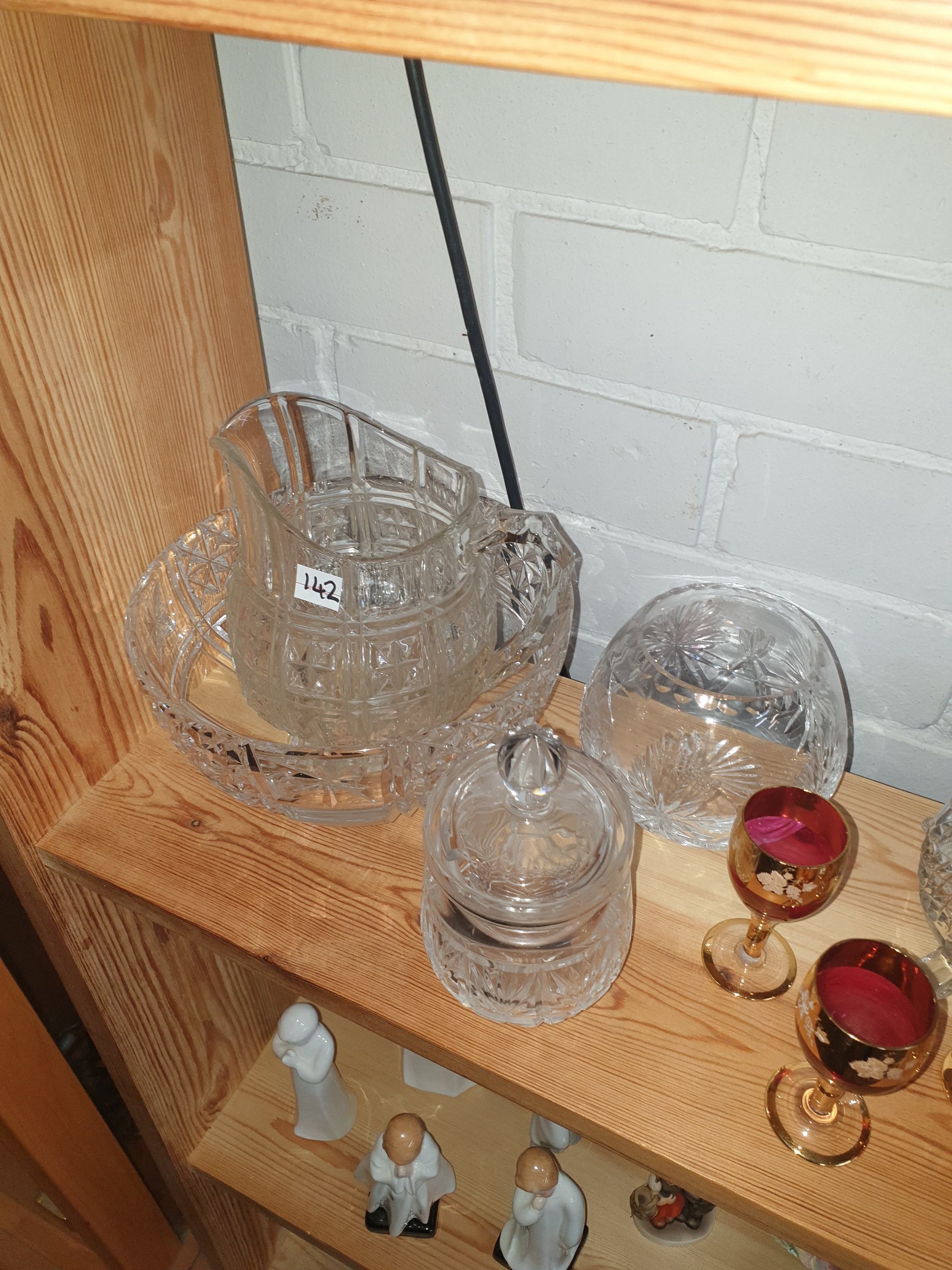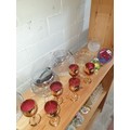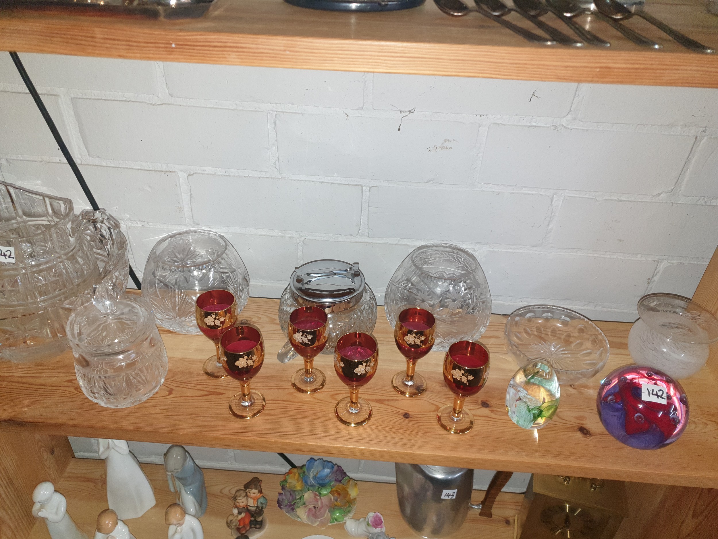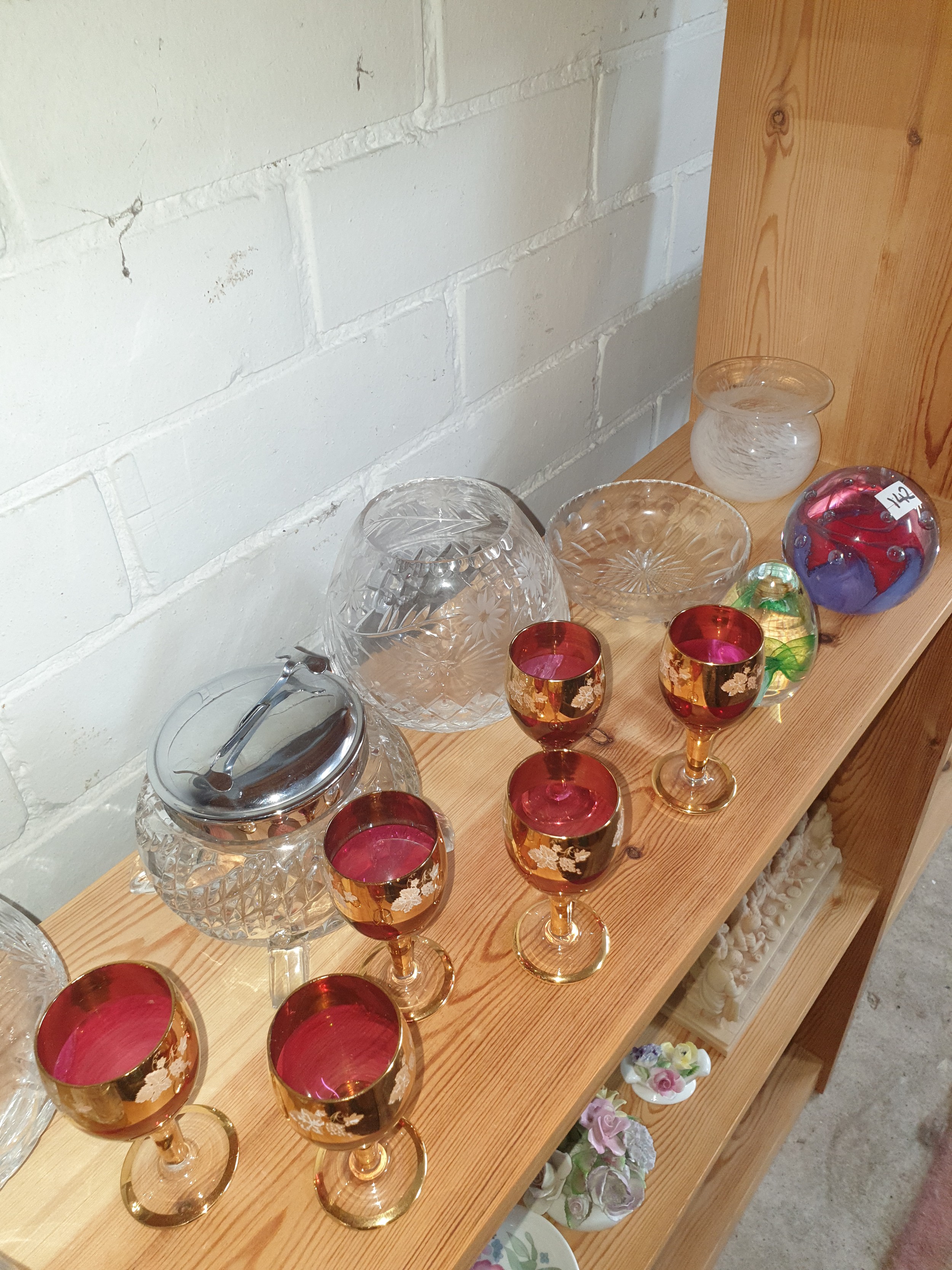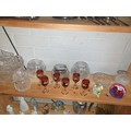 Shelf Of Glass And Crystal Bowl, jug Dishes, Small Red Glasses, Paperweights etc