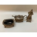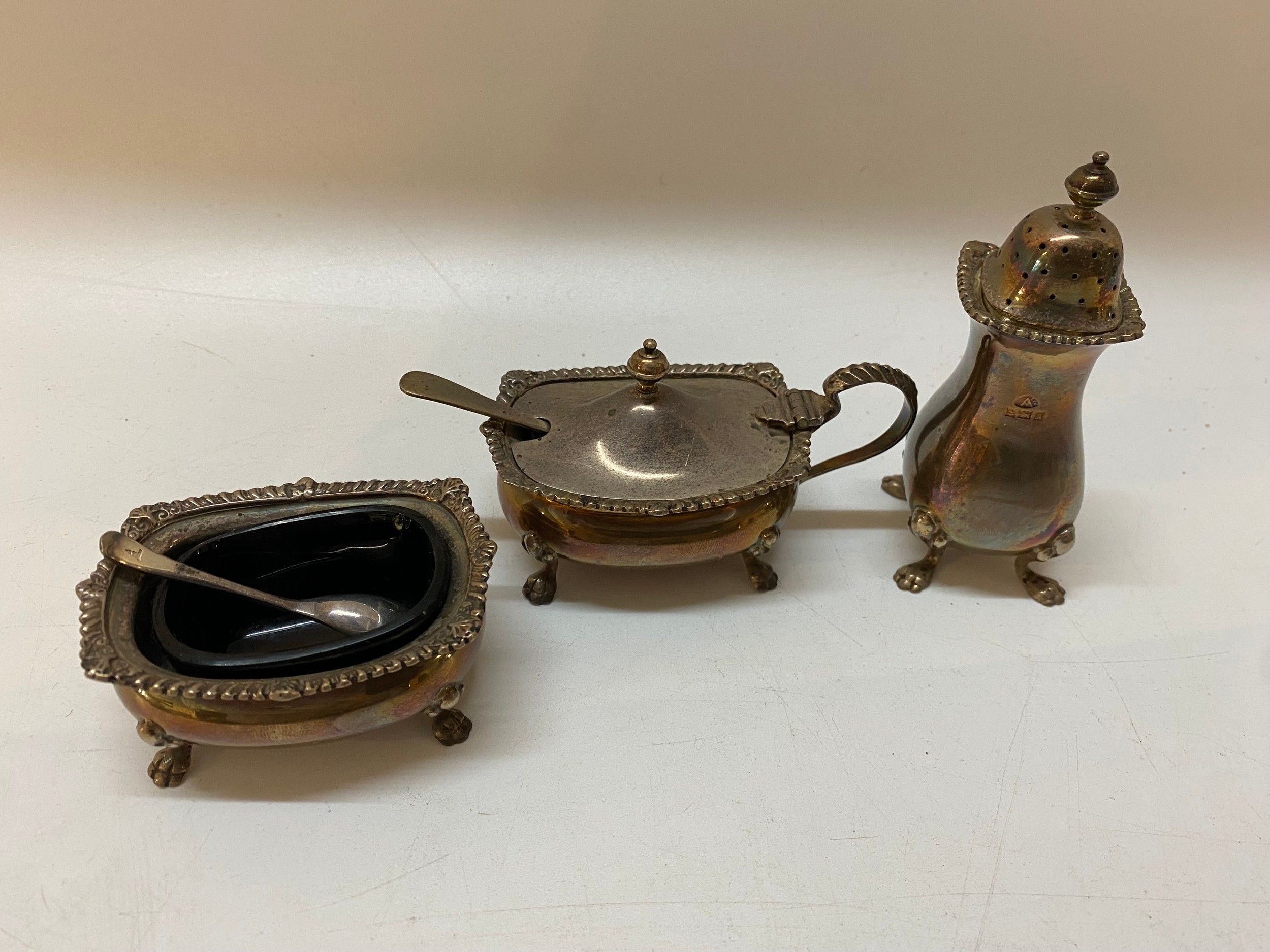 A silver three piece cruet set - Birmingham 1950, makers marks for Adie Brothers, a silver cruet spoon and a silver plated cruet spoon