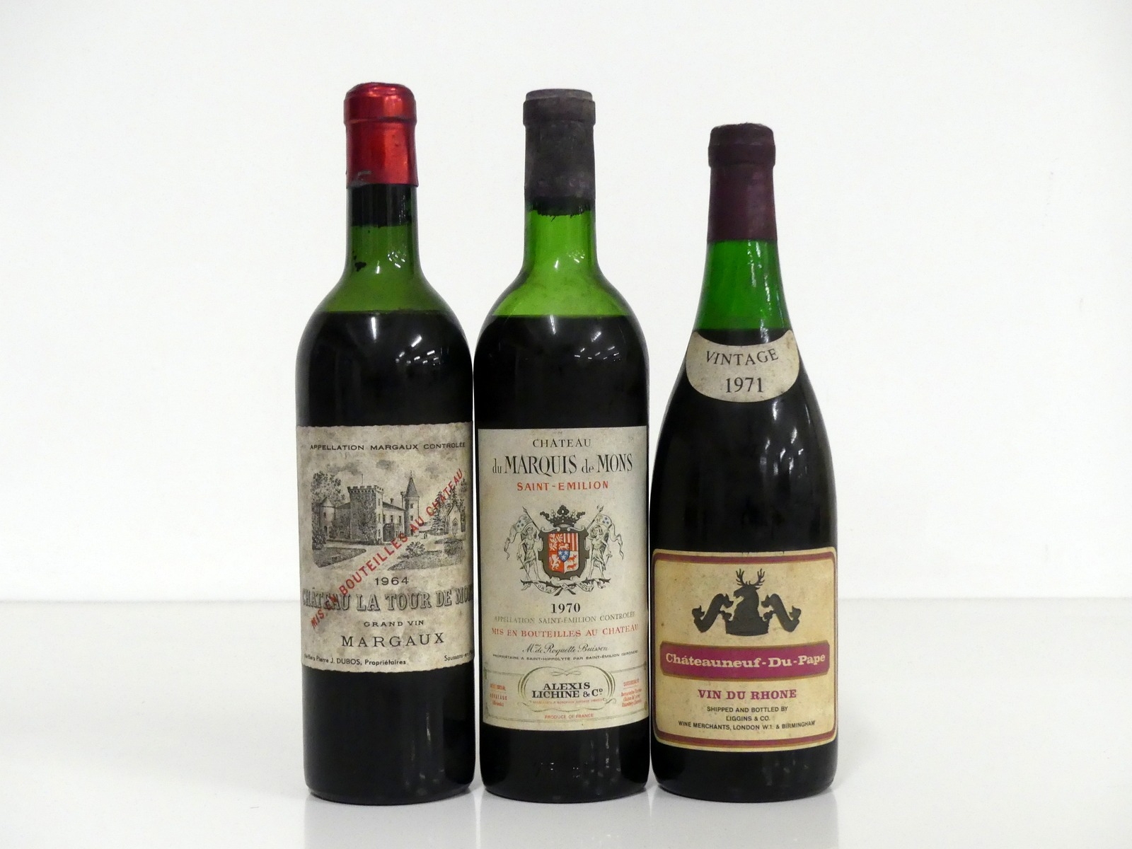 1 bt Ch. La Tour de Mons 1964 Margaux Cru Bourgeois Superieur, lms, vsl bs, aged label, crusted foil 1 bt Ch. du Marquis de Mons 1970 St-Émilion lms, vsl bs 1 bt Châteauneuf-du-Pape 1971 shipped & bottled by Liggins & Co ms, vsl bs, vsl crusted foil Above 3 bottles