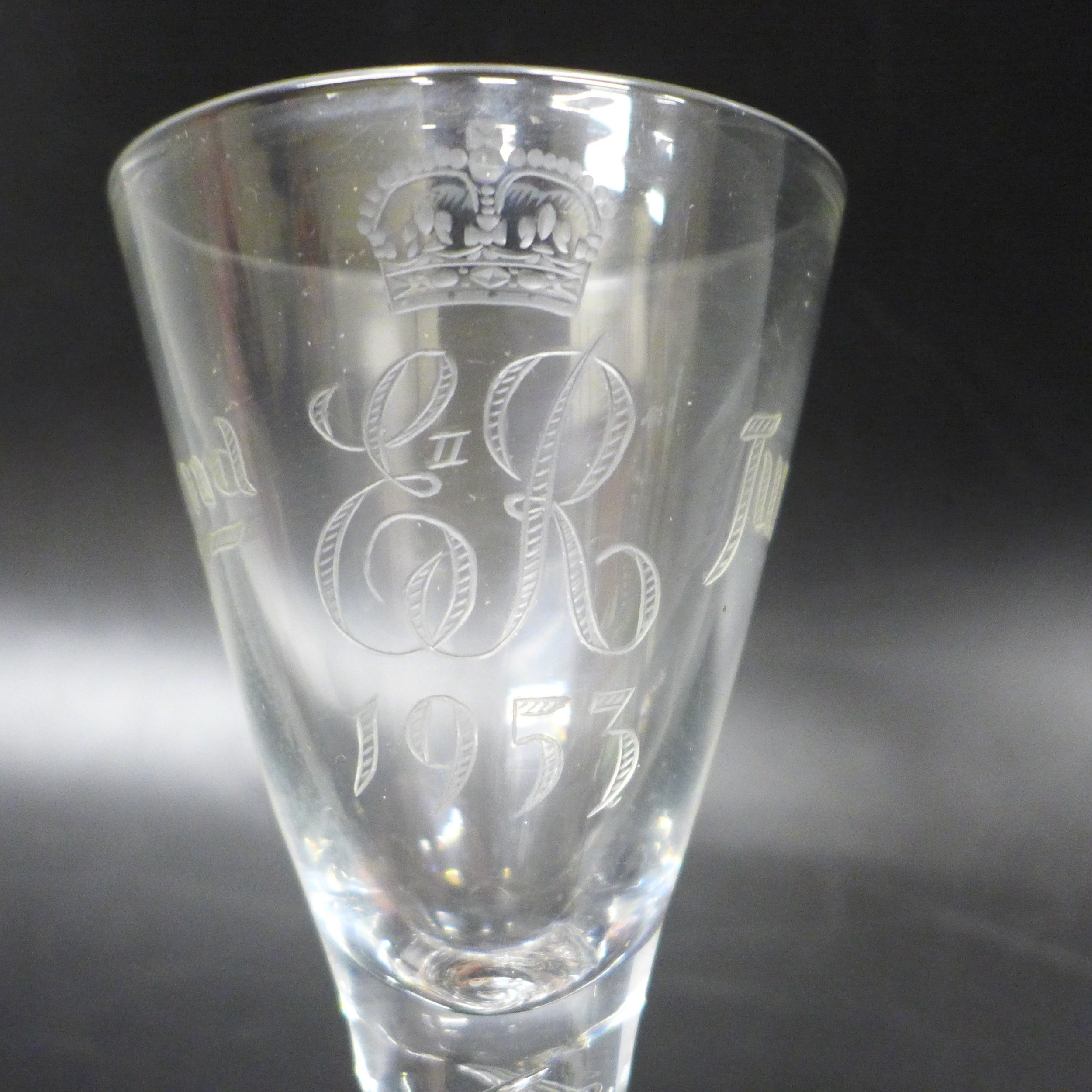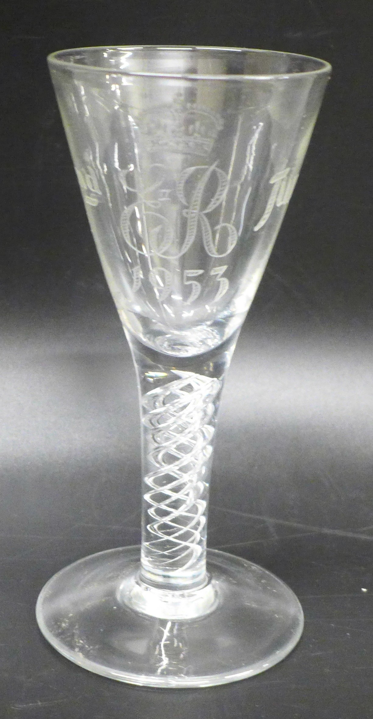 An air twist stemmed glass commemorating Queen Elizabeth II's Coronation, 1953, 18cm