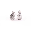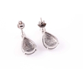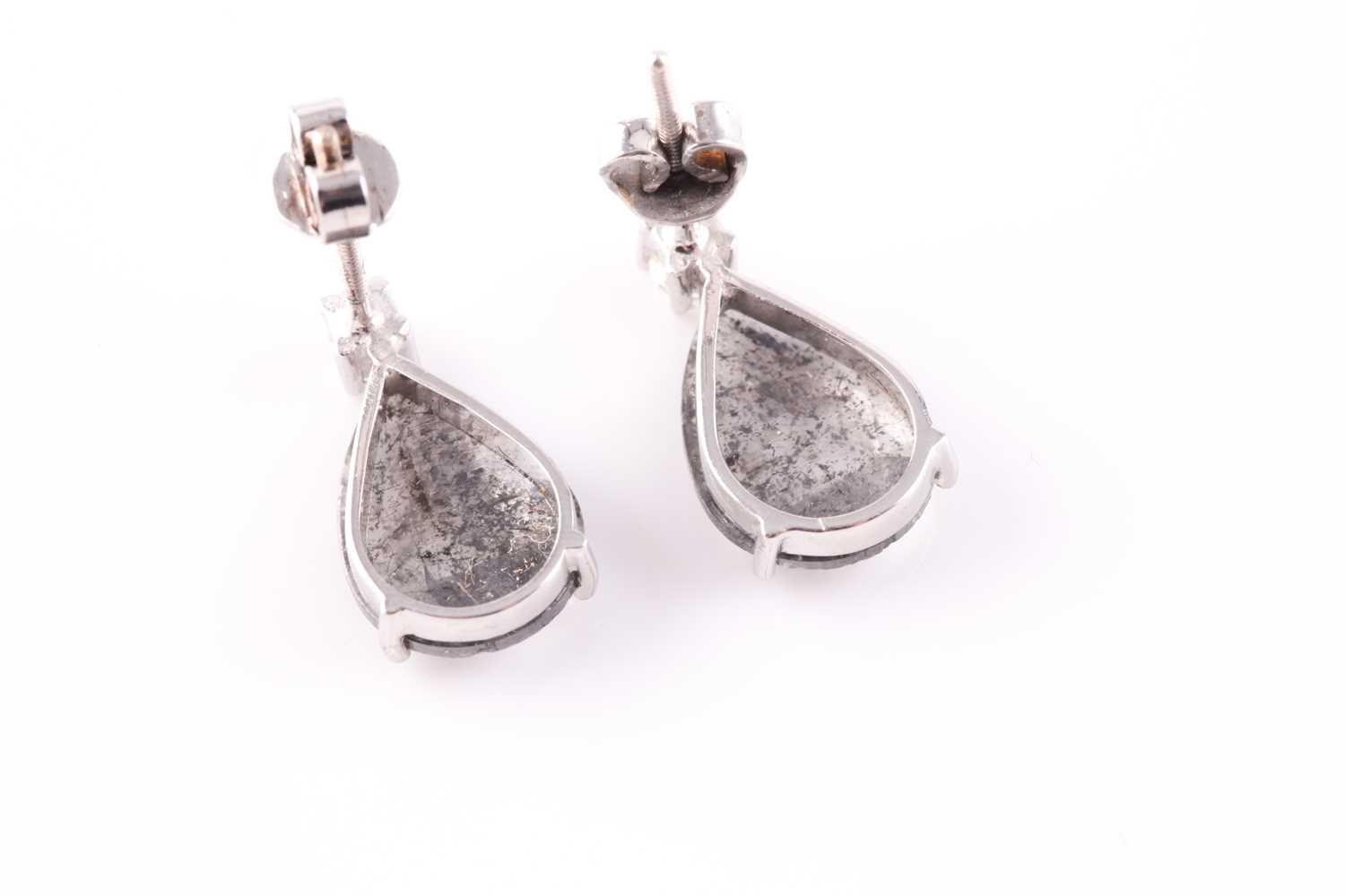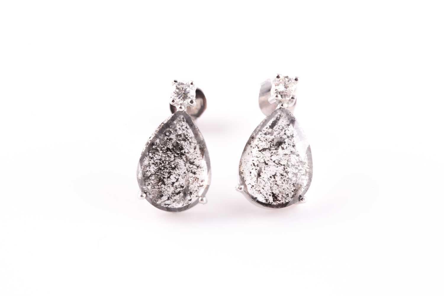 A pair of diamond earrings, each set with a mixed pear-cut polki diamond, with salt and pepper inclusions, measuring approximately 12 x 9 x 1.8 mm, beneath a round brilliant-cut diamond of approximately 0.10 carats, set in white metal, with screwback butterflies, earrings 1.6 cm long, 3 grams.