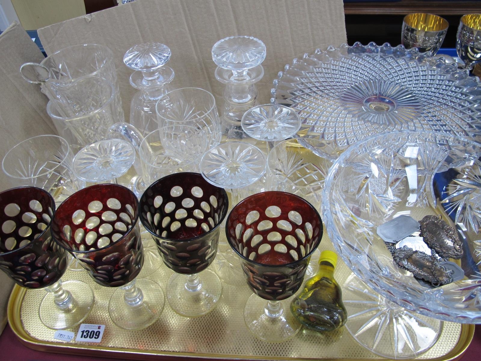 Cut Glass Decanters and Other Glassware, tazza, comport, ruby overlaid wines, EPNS and Old Hall stainless steel spirit labels, pickled cobra in bottle :- One Tray
