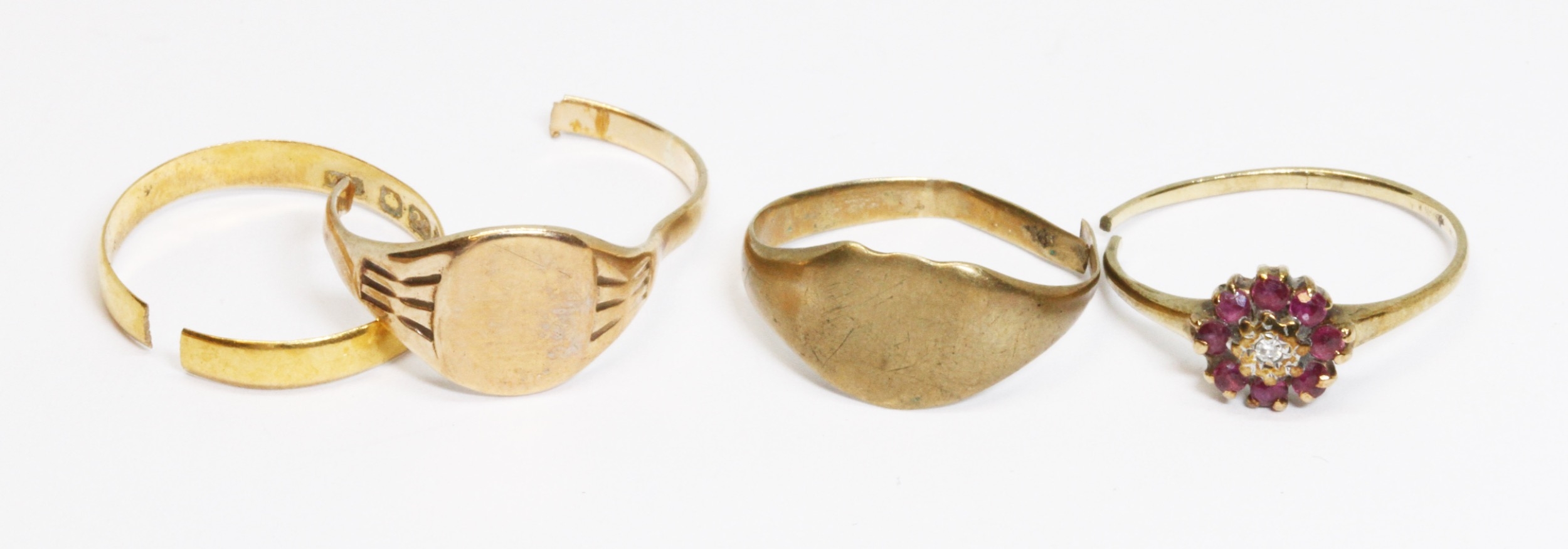 A group of four broken gold rings comprising one 22ct, weight 1.3g, a hallmarked 9ct gold signet ring, weight 2.1g, another signet ring and a cluster ring, both unmarked, weight 3.2g.