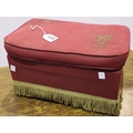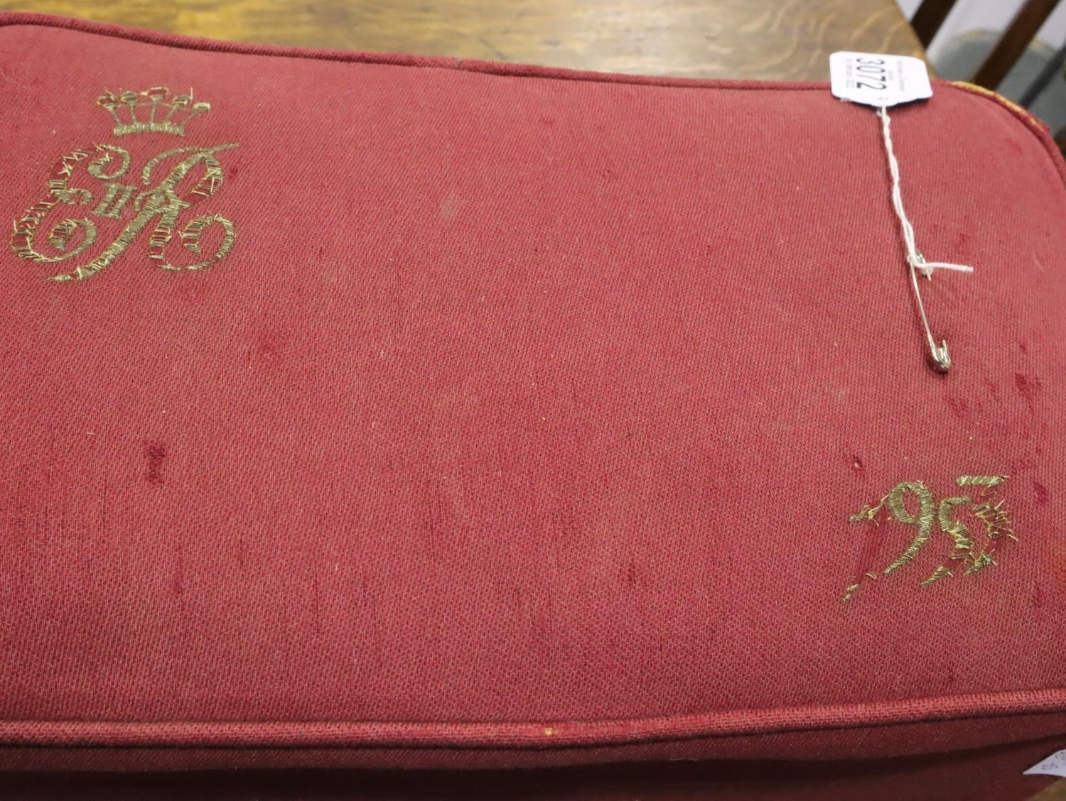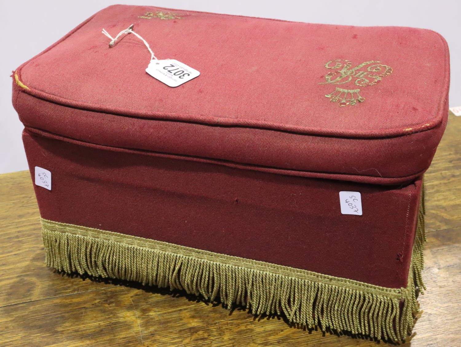 Elizabeth II Coronation foot stool, box framework covered in original fabric with embroidered Royal initials and dated 1953, 42 x 27 x 24 cm H. Not available for in-house P&P, contact Paul O'Hea at Mailboxes on 01925 659133