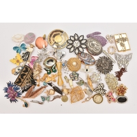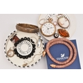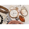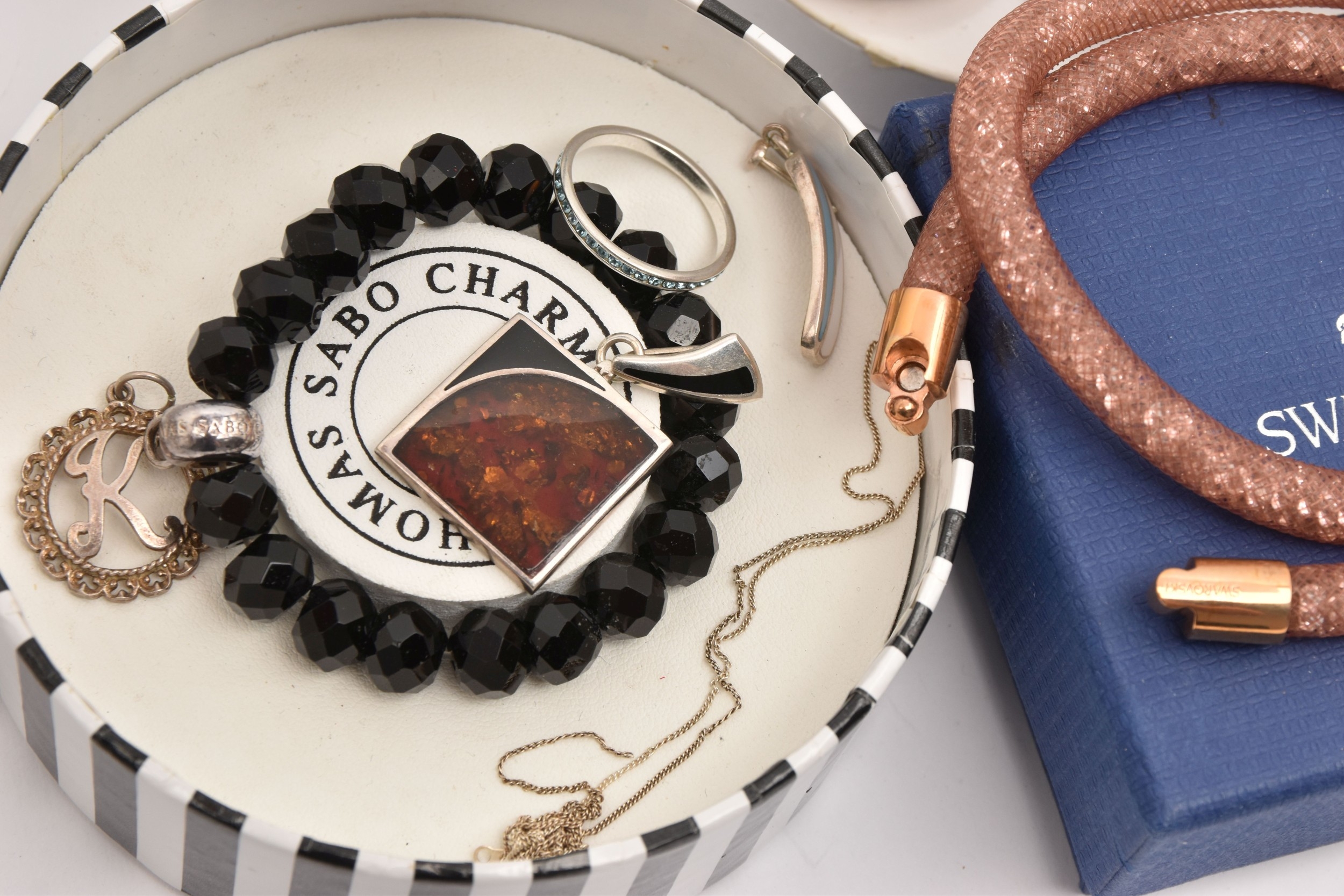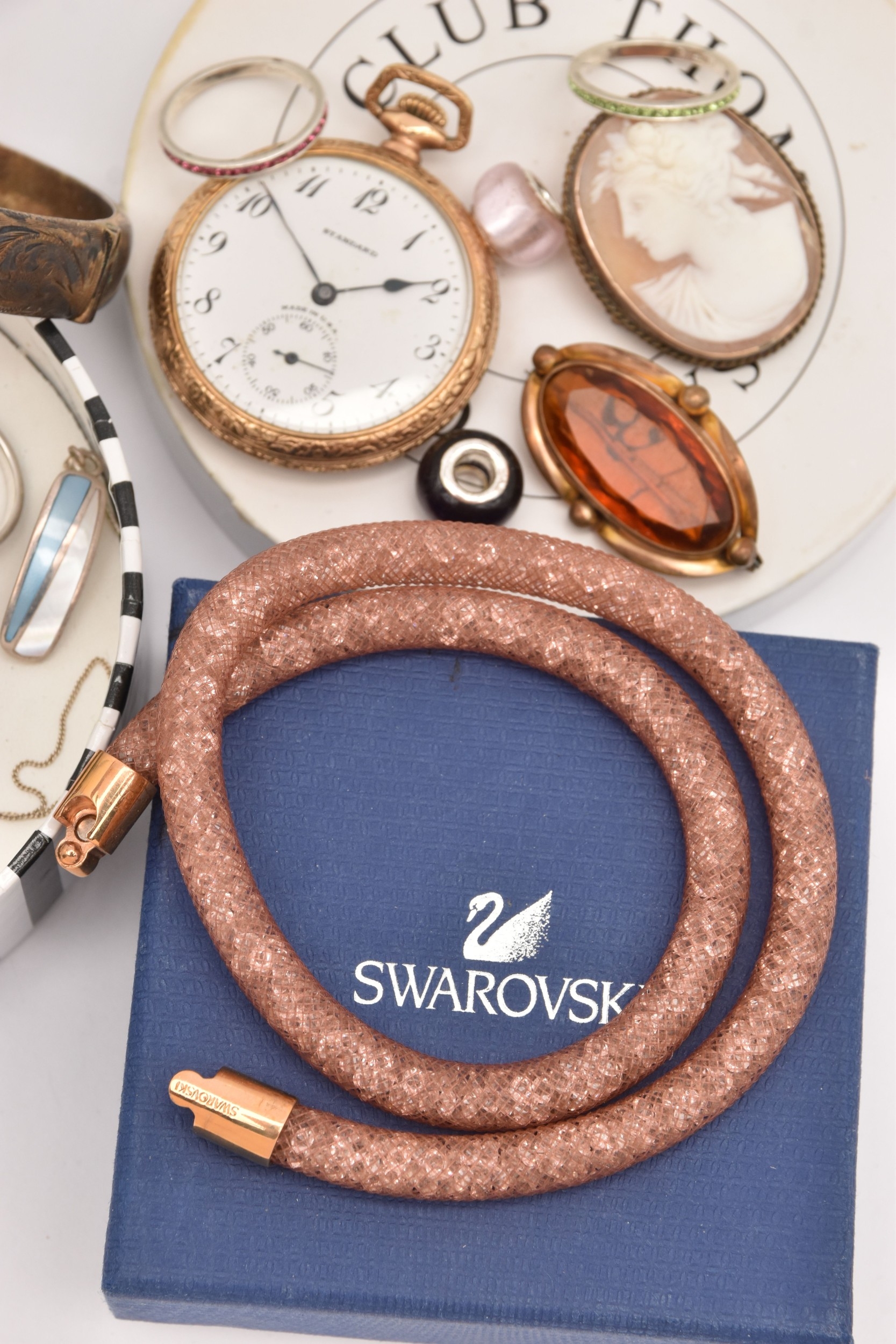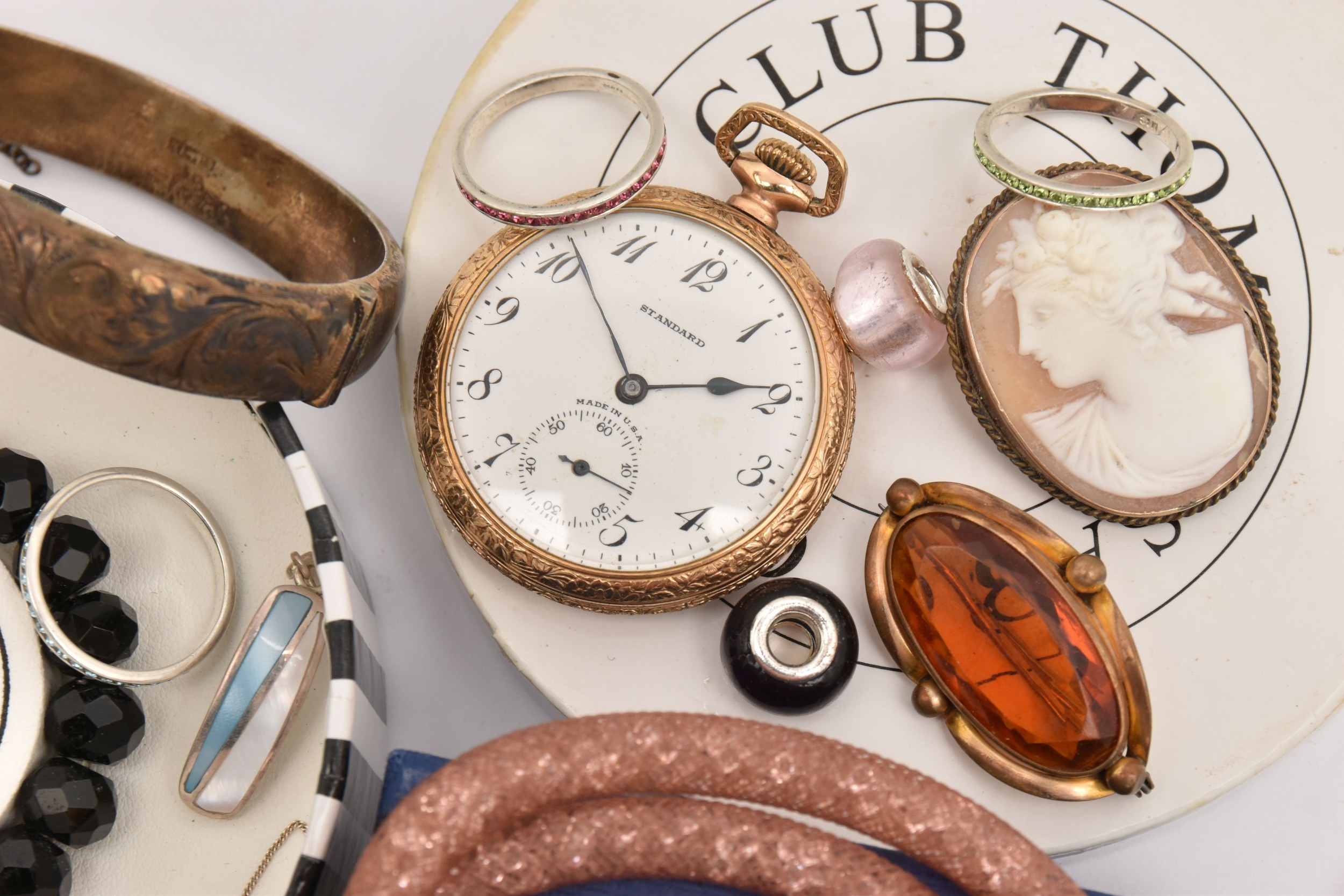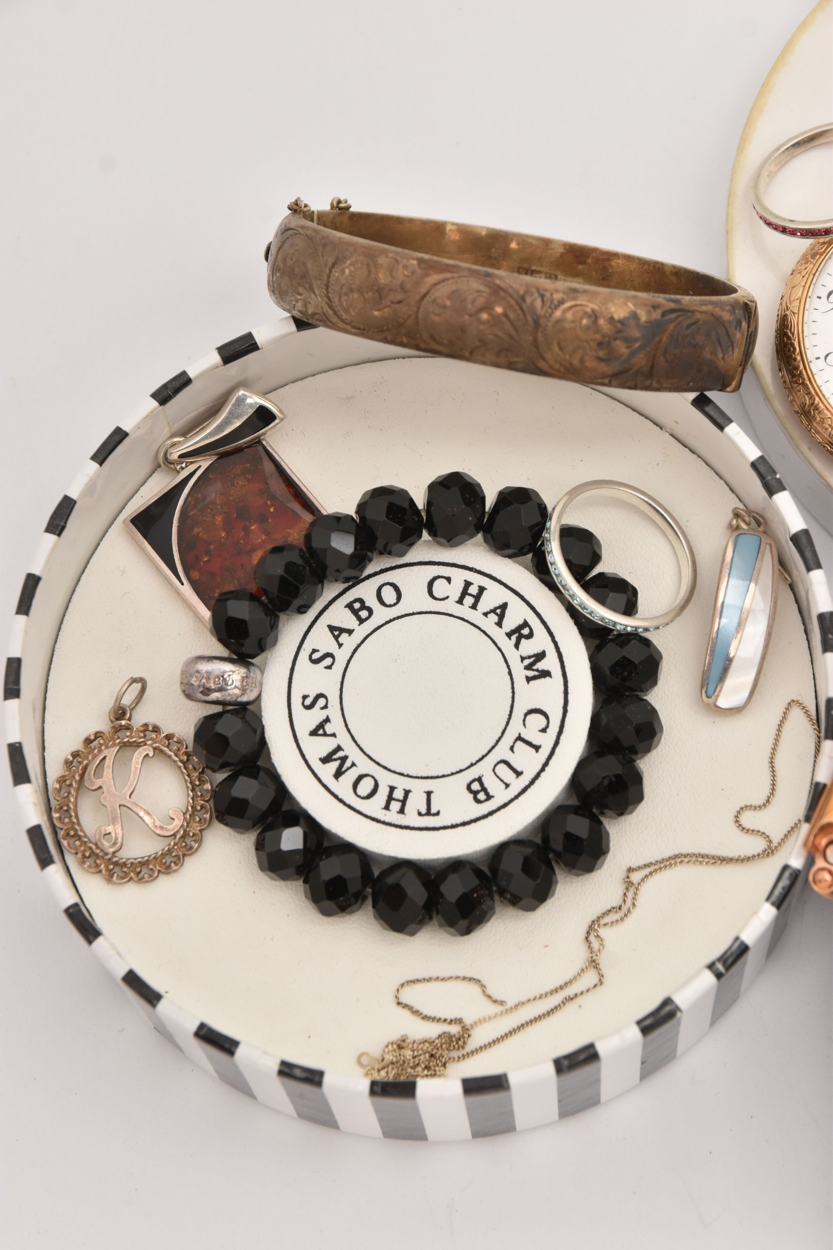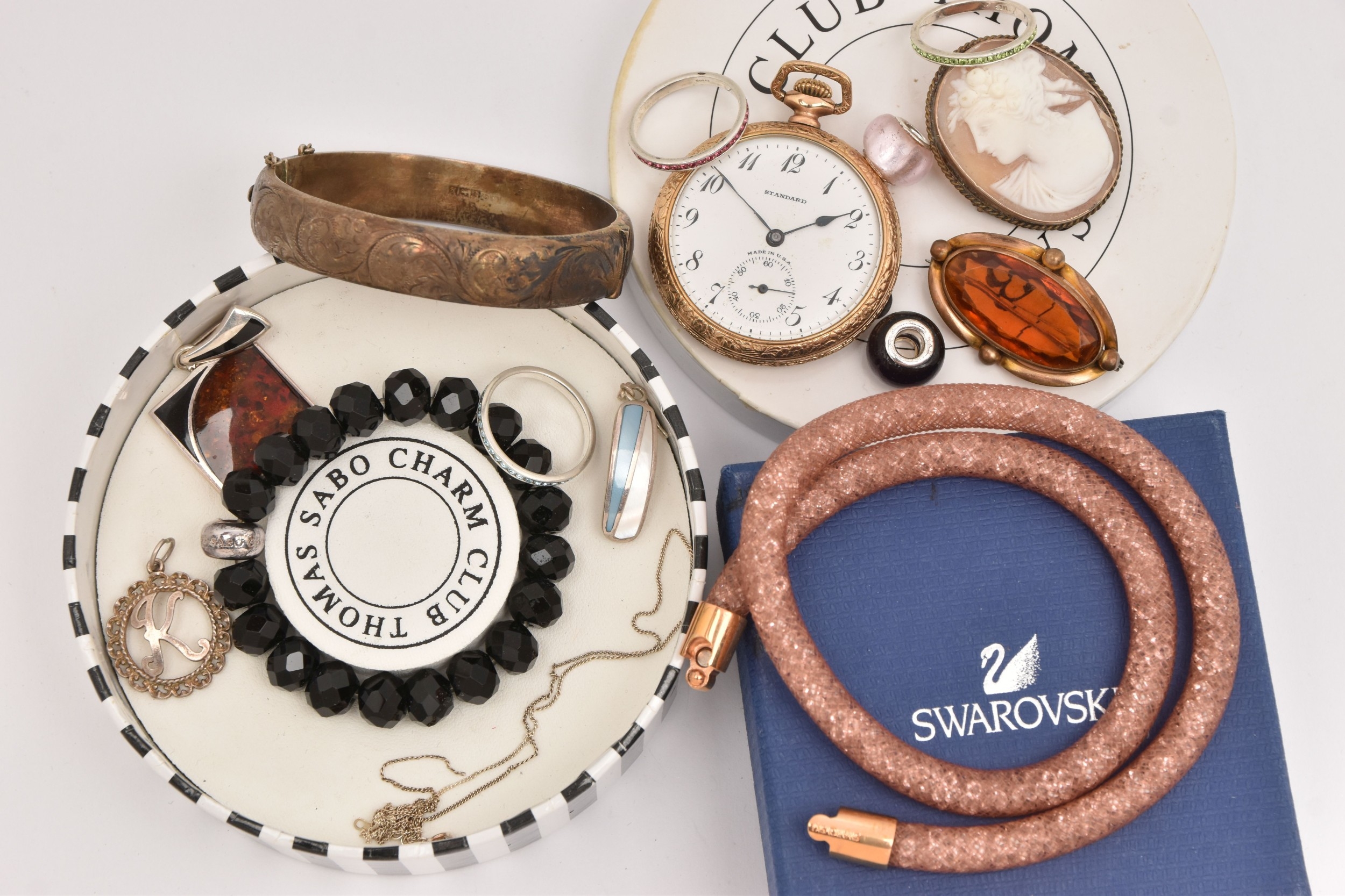 AN ASSORTMENT OF JEWELLERY, to include a 'Swarovski' necklace, a 'Thomas Sabo' charm bracelet, a rolled gold 'Standard' open face pocket watch, two brooches, a silver hinged bangle, hallmarked Birmingham, approximate gross weight 21.6 grams, together with a small selection of white metal jewellery, approximate gross weight 20 grams, (condition report: general moderate wear)