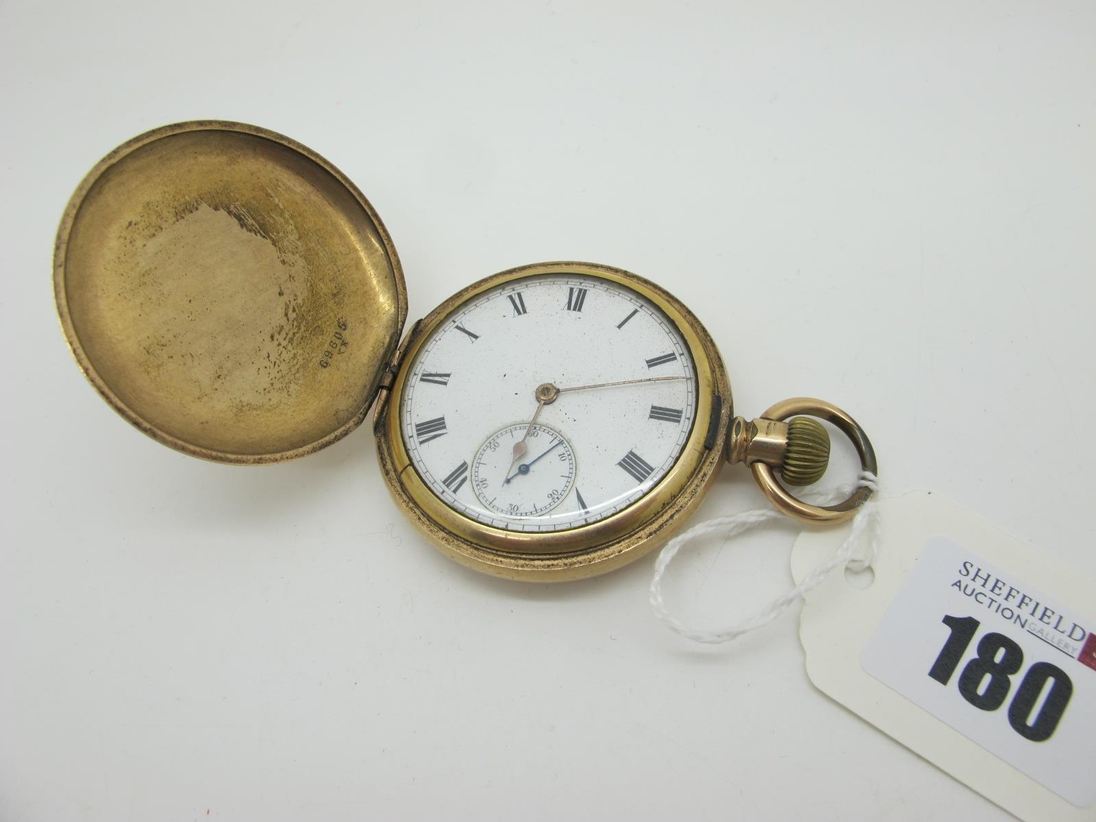 A Gold Plated Cased Hunter Pocketwatch, the unsigned circular white dial with Roman numerals and seconds subsidiary dial, within plain case.