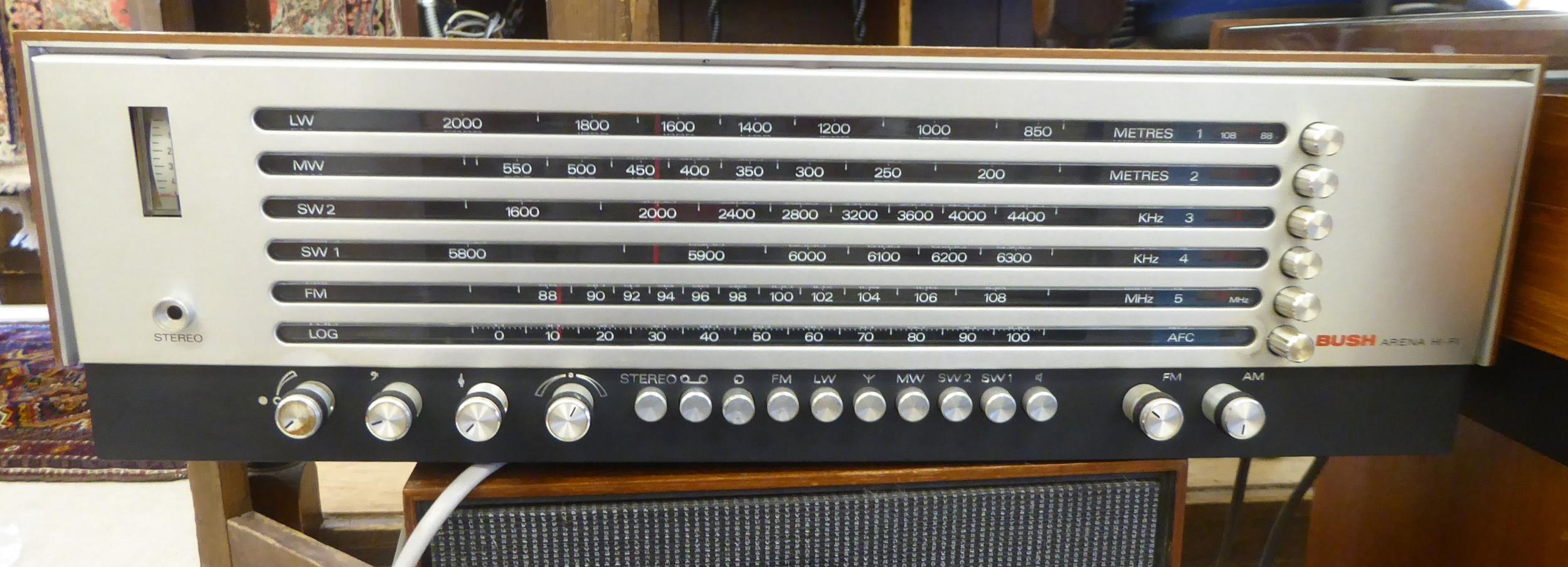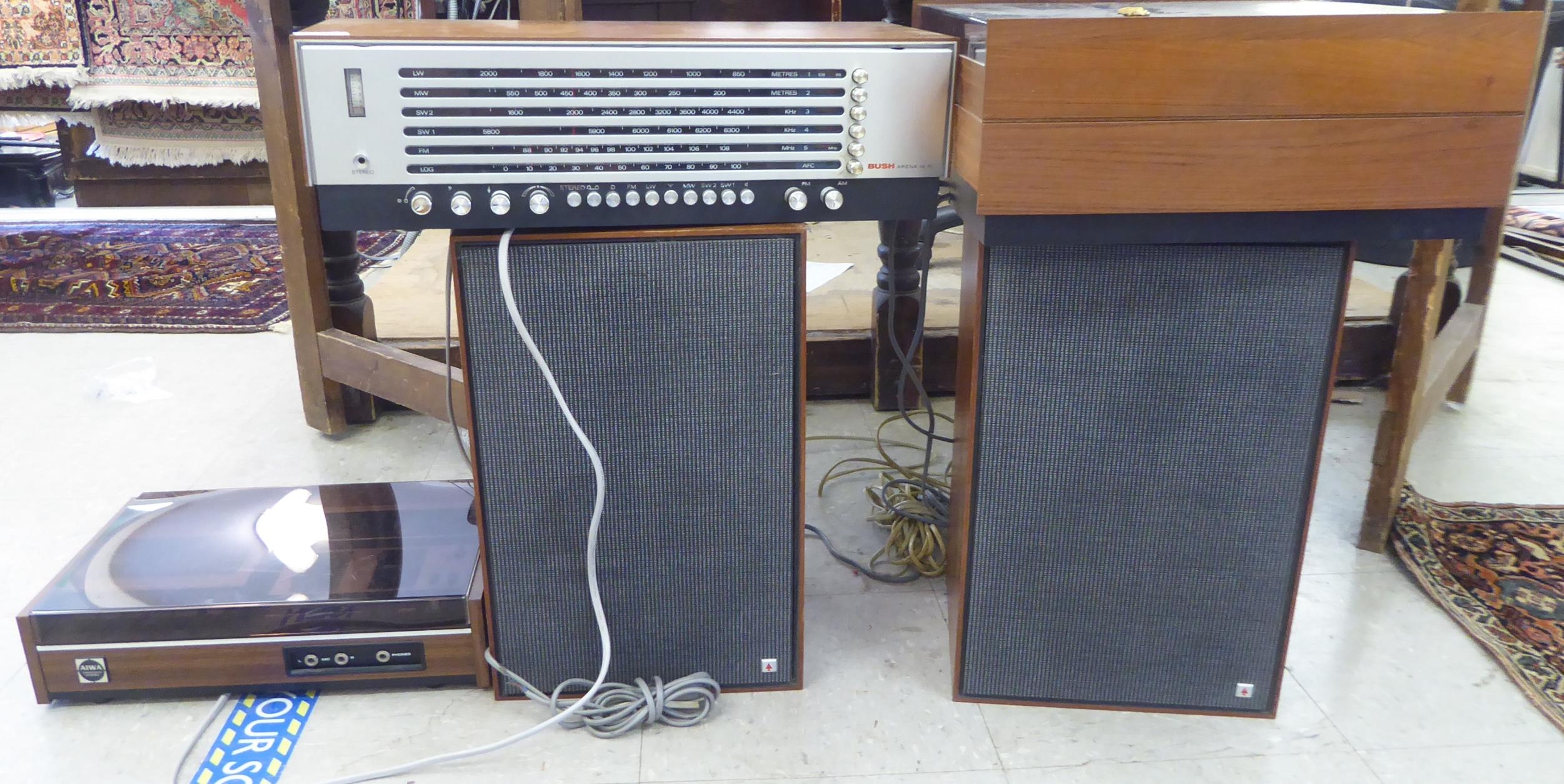 Stereo equipment, viz. a Bush Arena 3 waveband radio; an Alwa Creators stereo; a Garrard automatic turntable; and a pair of Rank Arena speakers