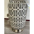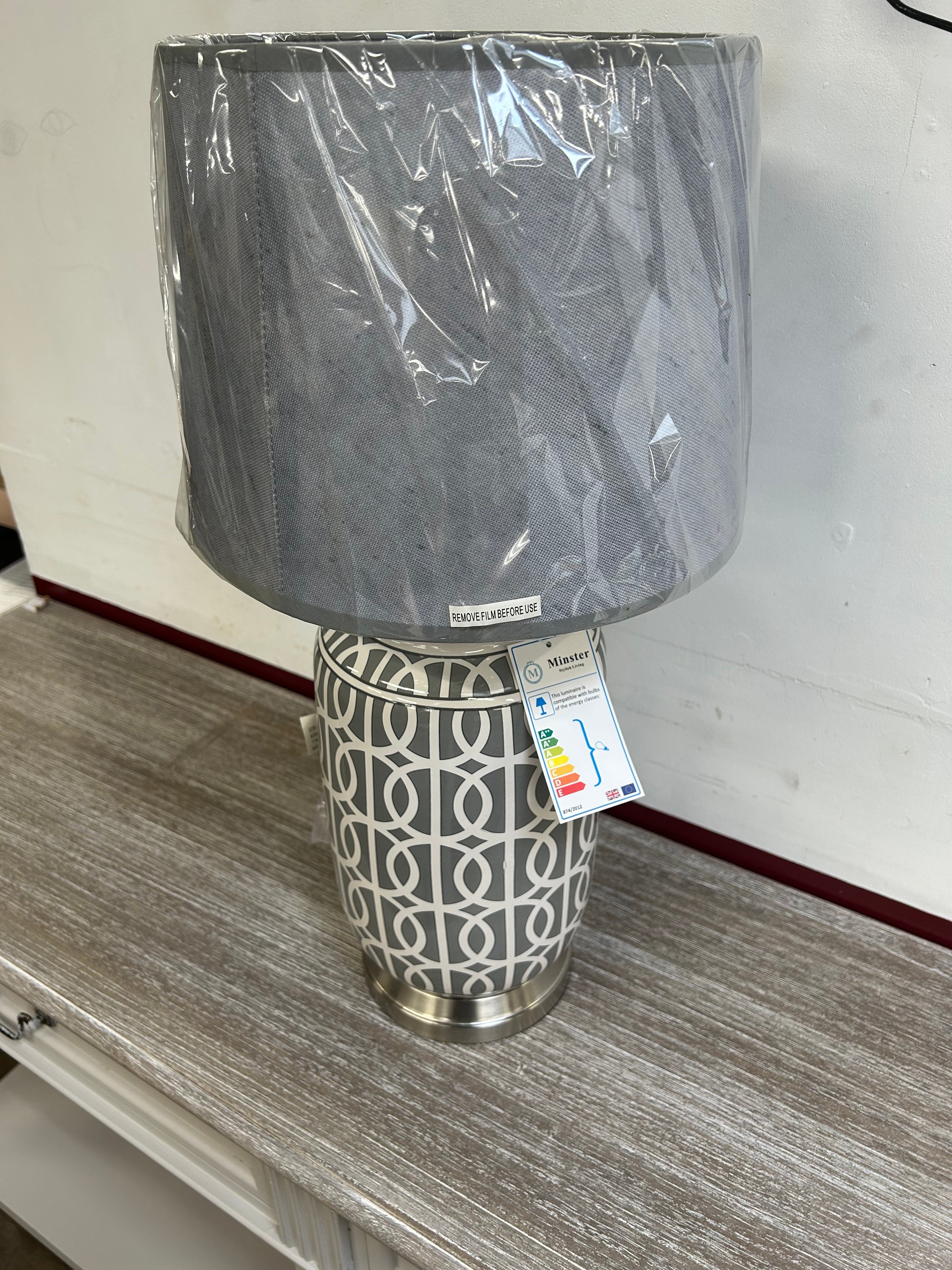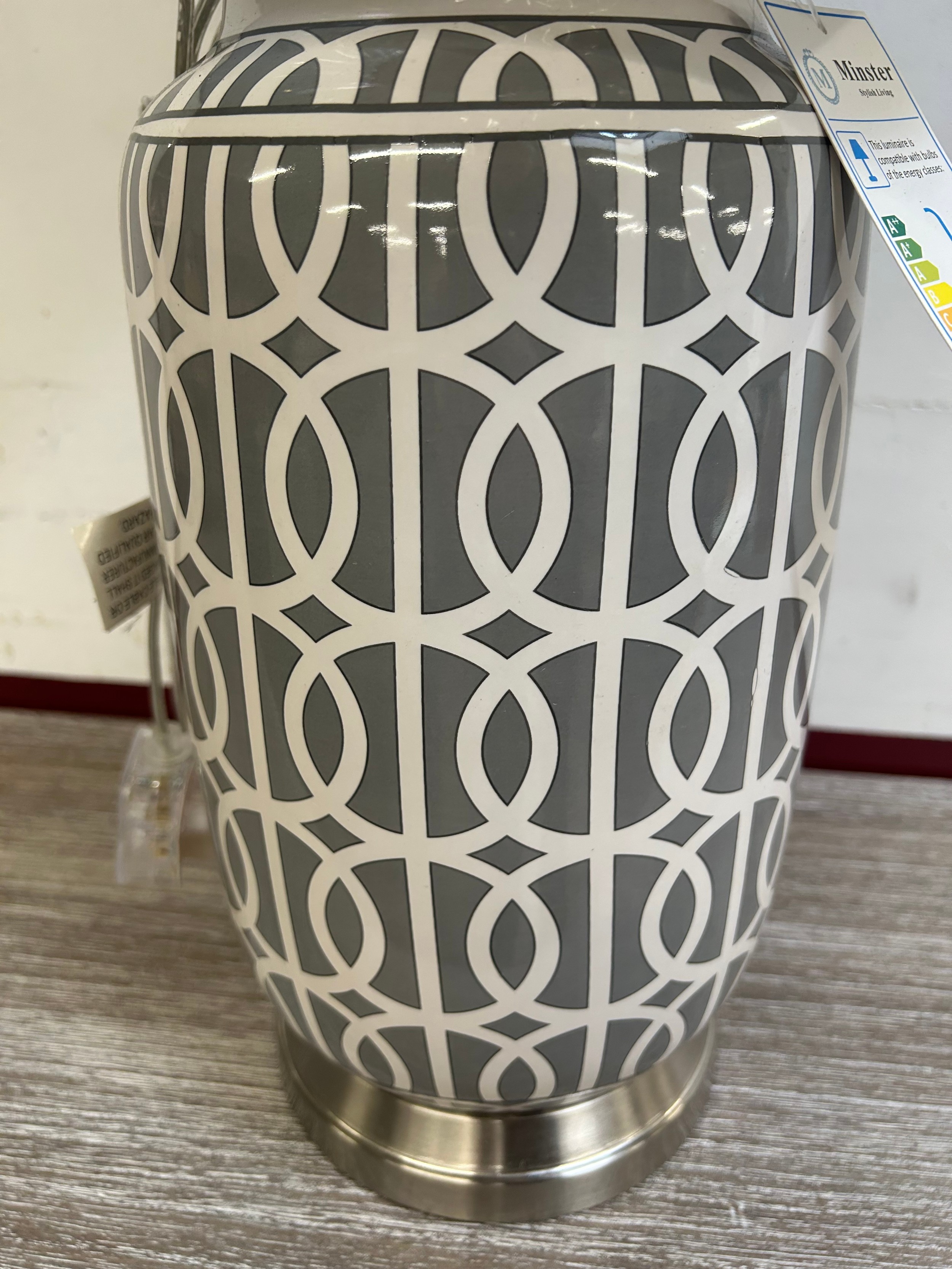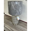 A grey patterned table lamp