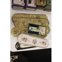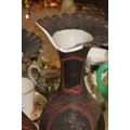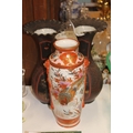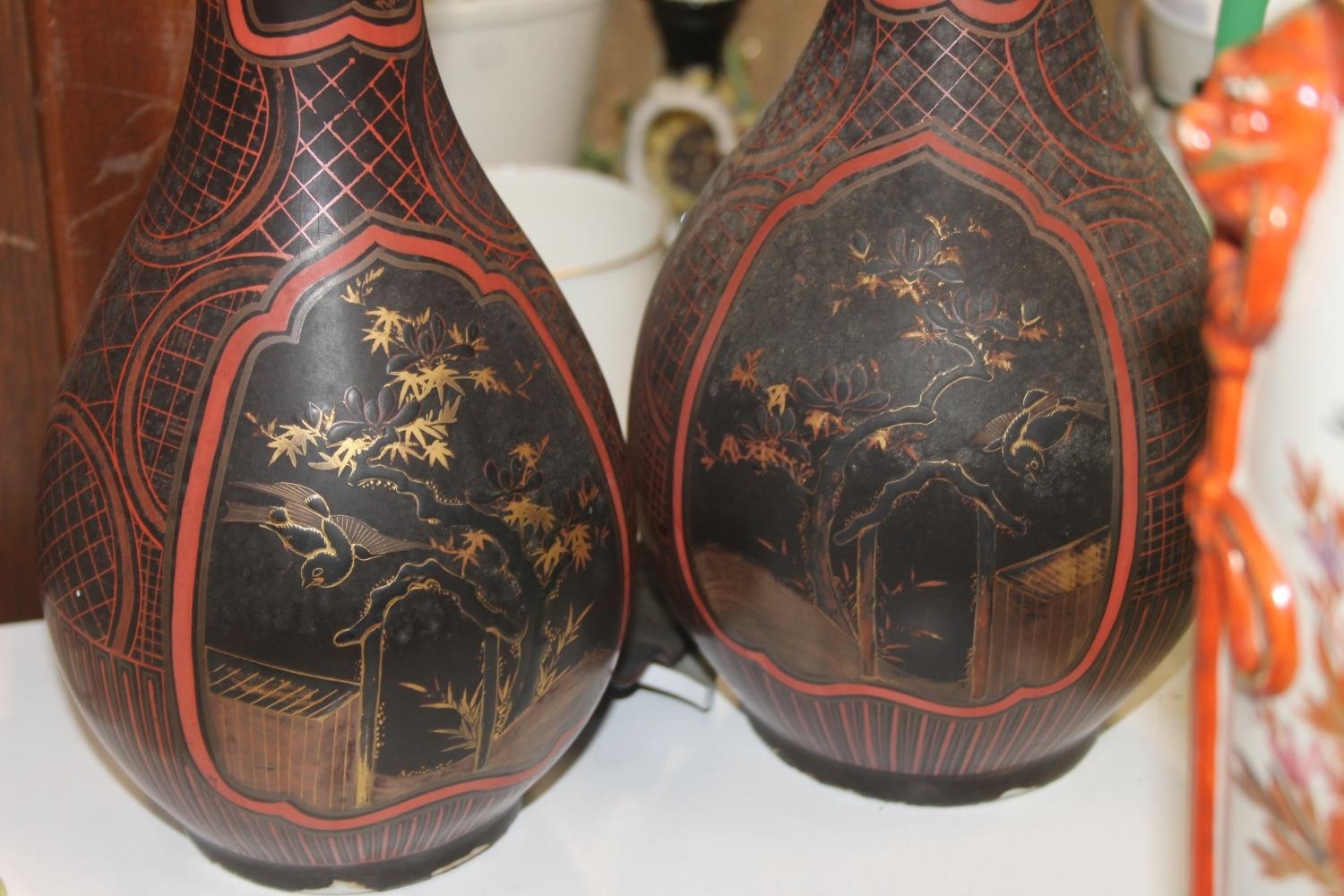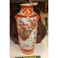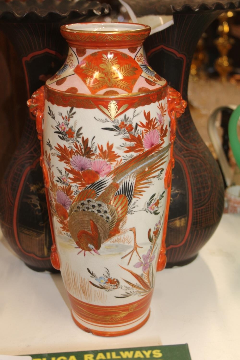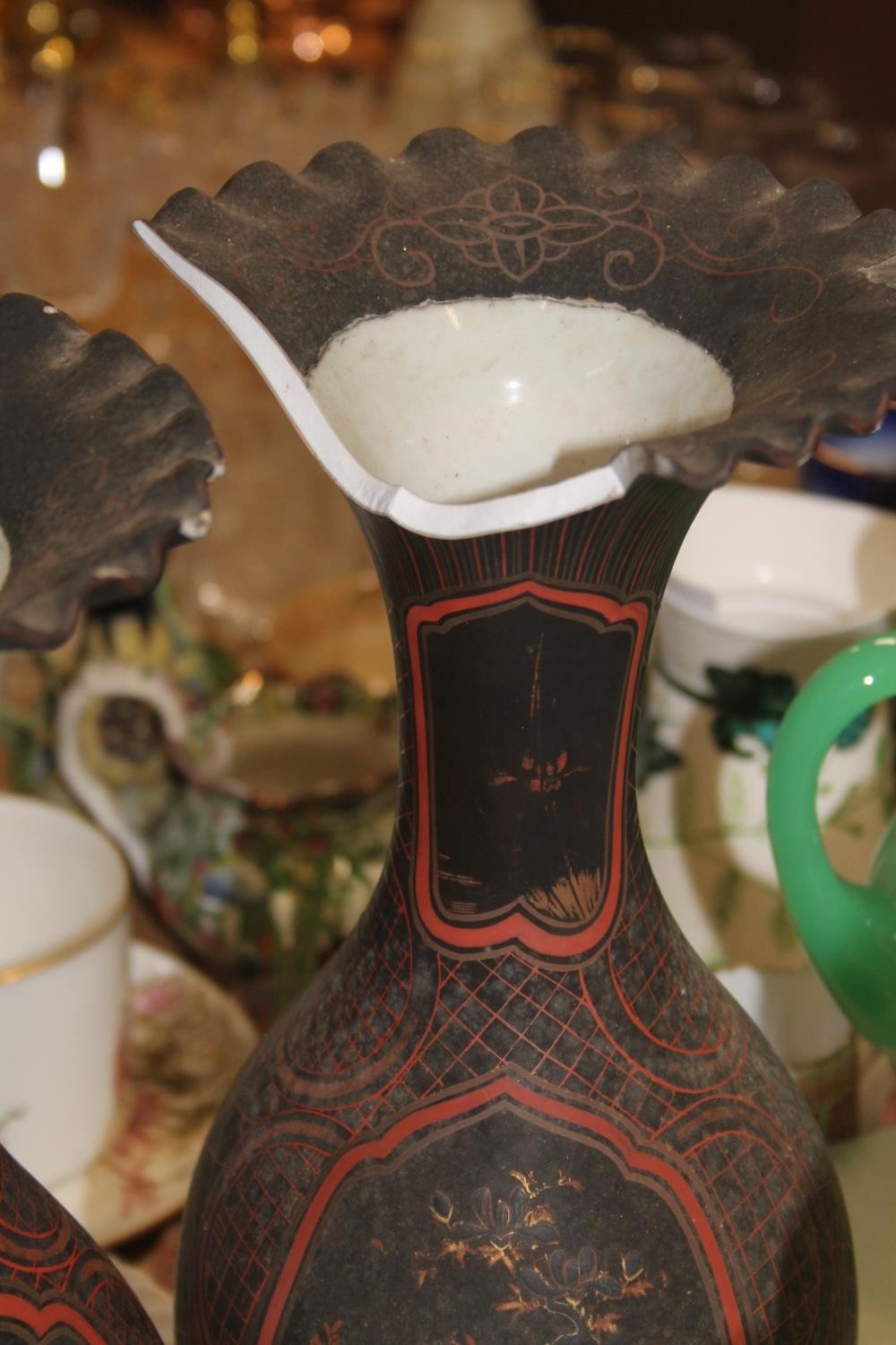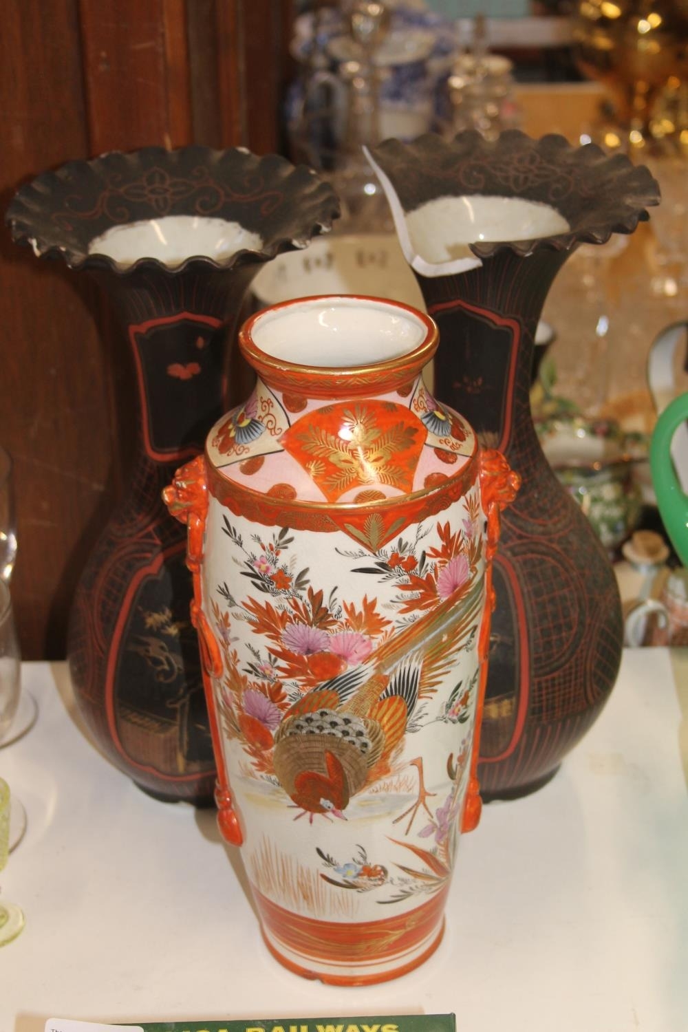 A pair of black ground oriental vases with wavy edge rims (a/f) and a kutani vase.