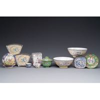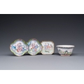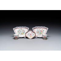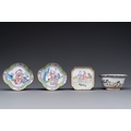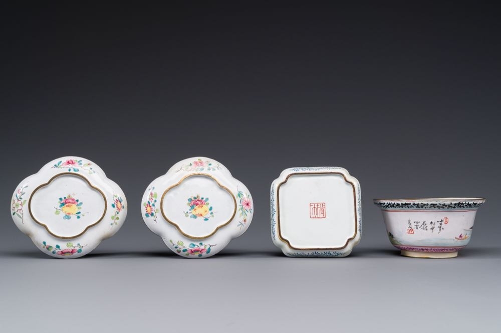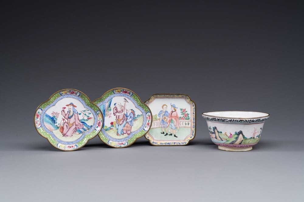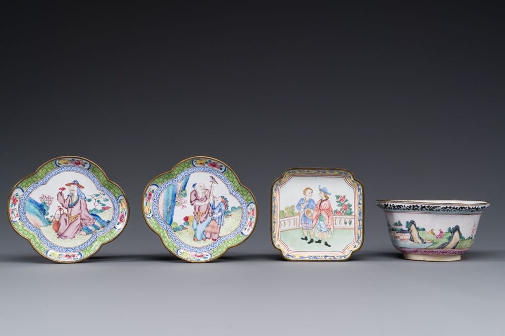 Three Chinese Canton enamel saucers and a bowl, Shangxin mark, Yongzheng/Qianlong