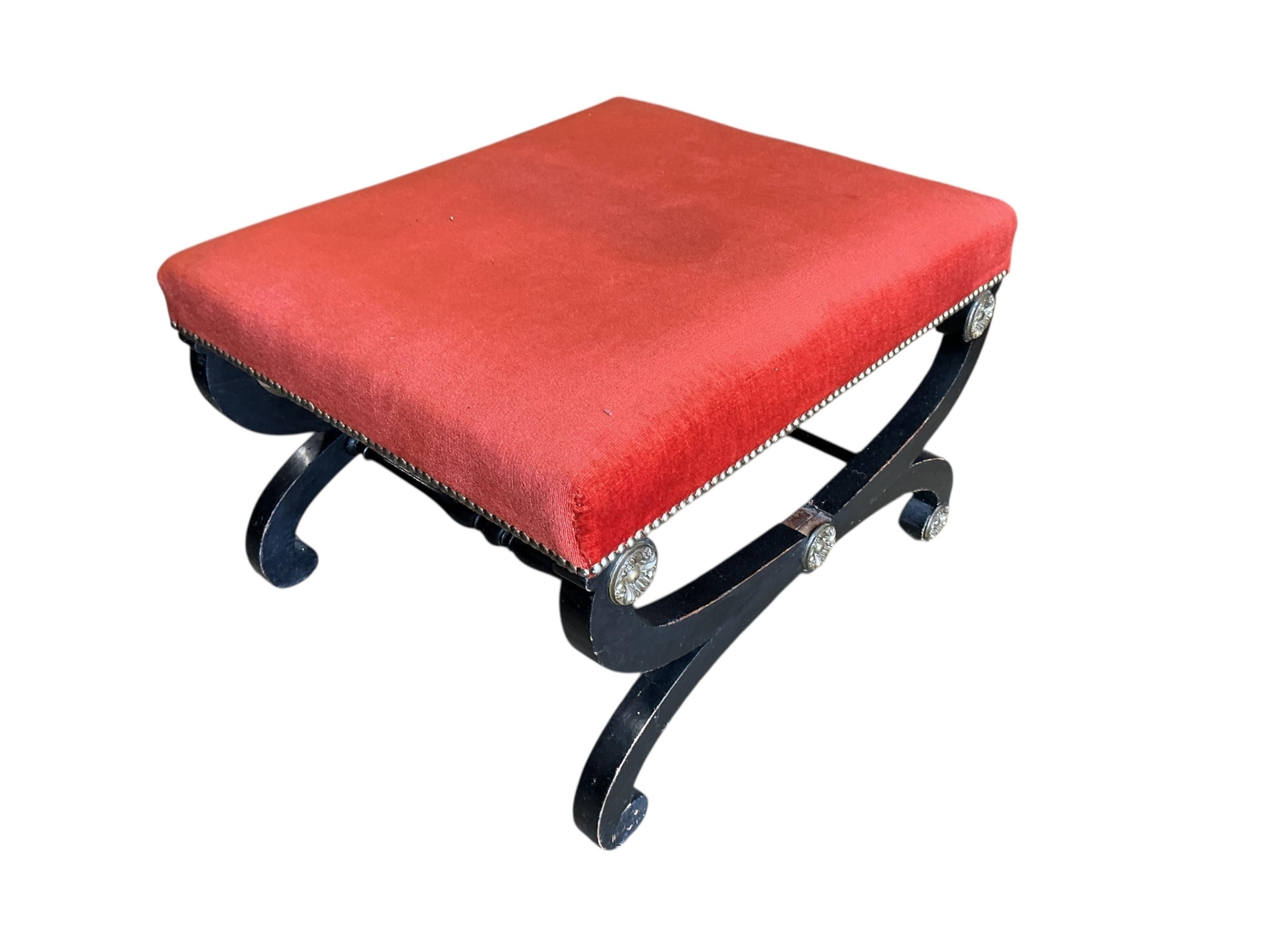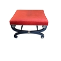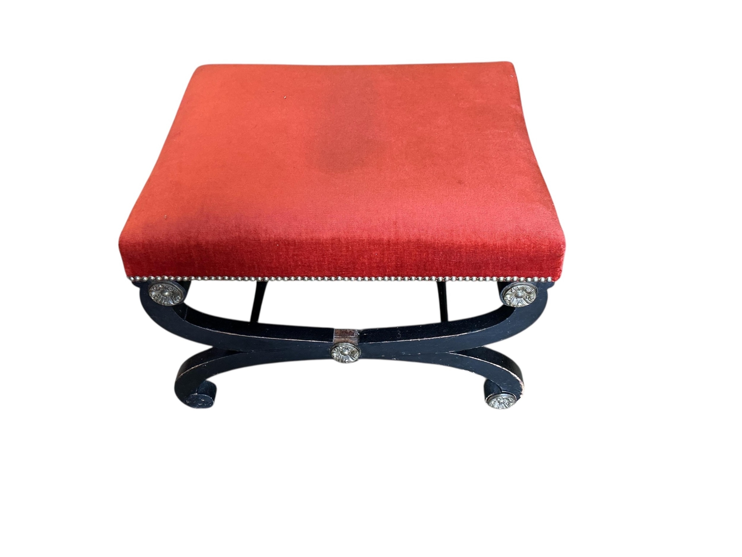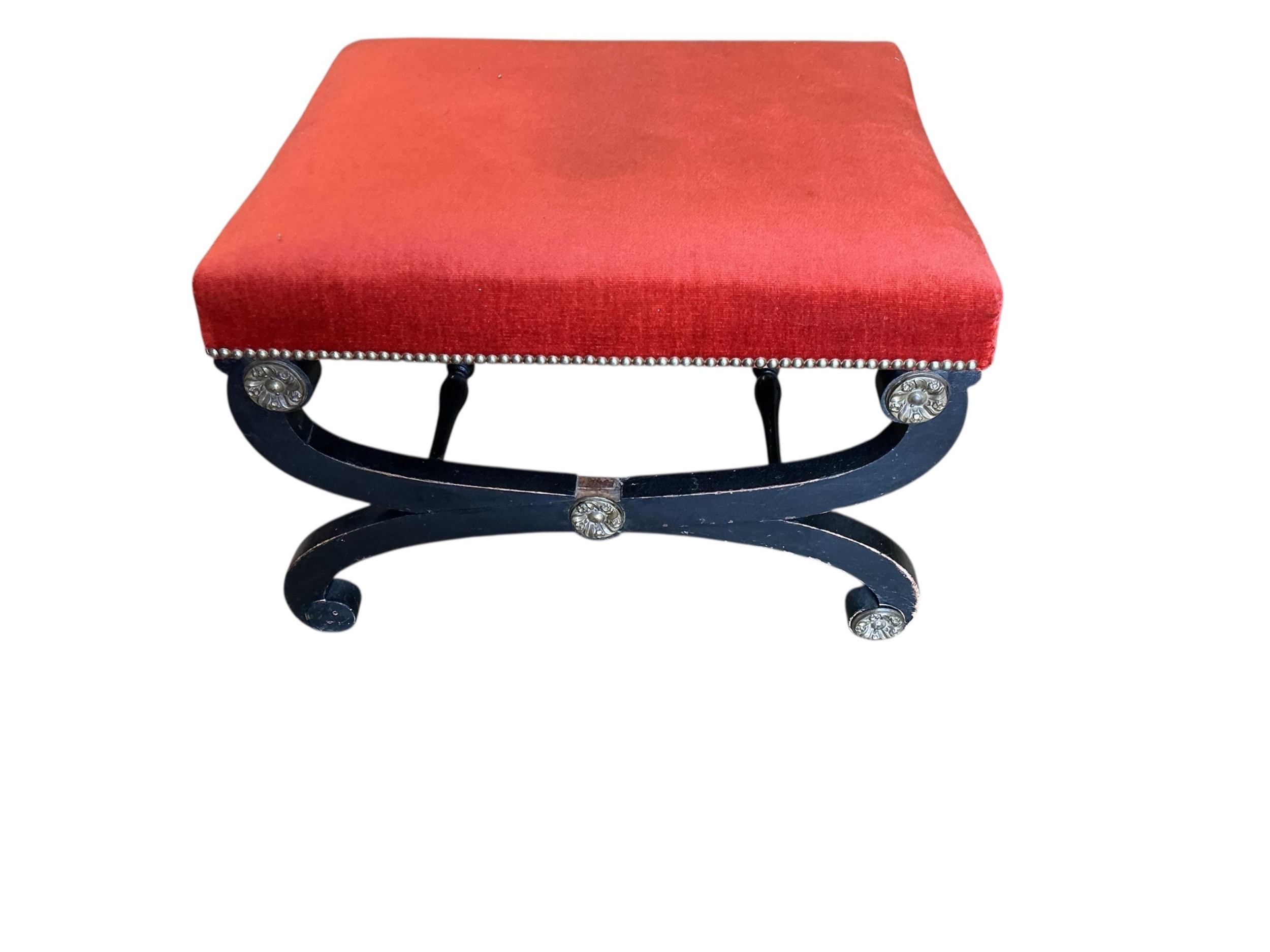 A Regency style gilt metal mounted upholstered ebonised stool, width 64cm, depth 55cm, height 41cm