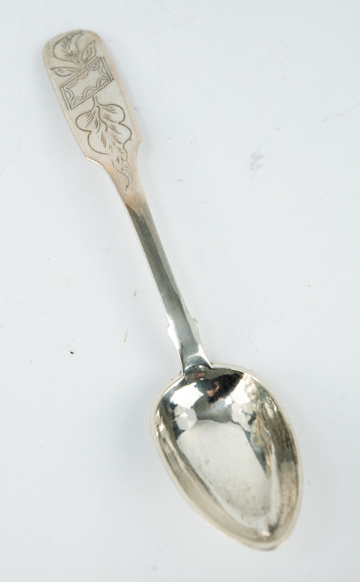 SET OF NINE FOREIGN SILVER COLOURED METAL FIDDLE PATTERN TEASPOONS, and TWO OTHERS, SIMILAR, with engraved handles, 6.32ozt, (11)