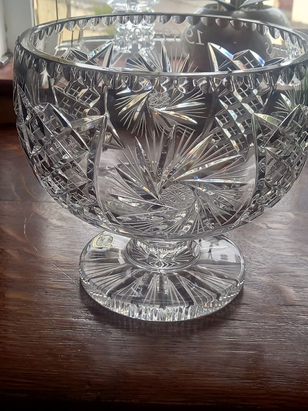 A VERY GOOD QUALITY BOHEMIAN CUT GLASS FOOTED BOWL, with great cut detail all over. Inscribed to one side. Congratulations from Anthony 1969-1994. Extremely heavy and in excellent condition. Sticker for maker still attached. Dimensions: 28 inches wide x 8 inches tall.