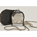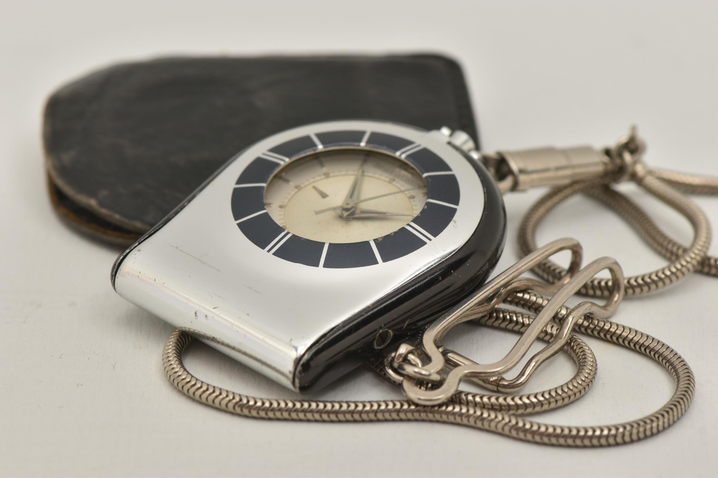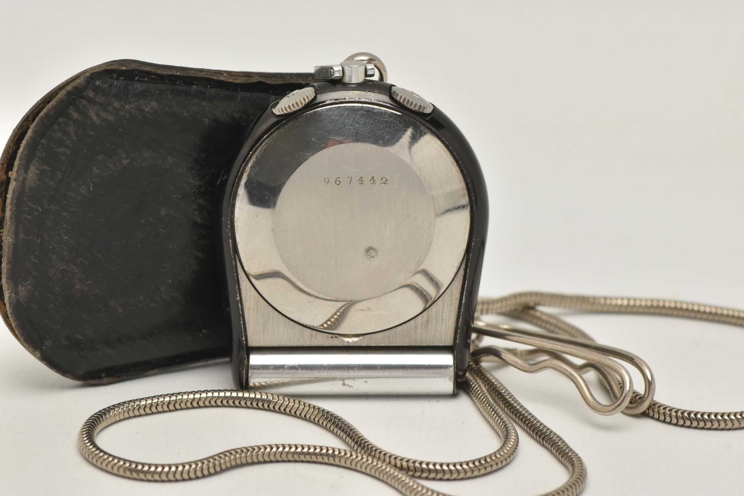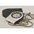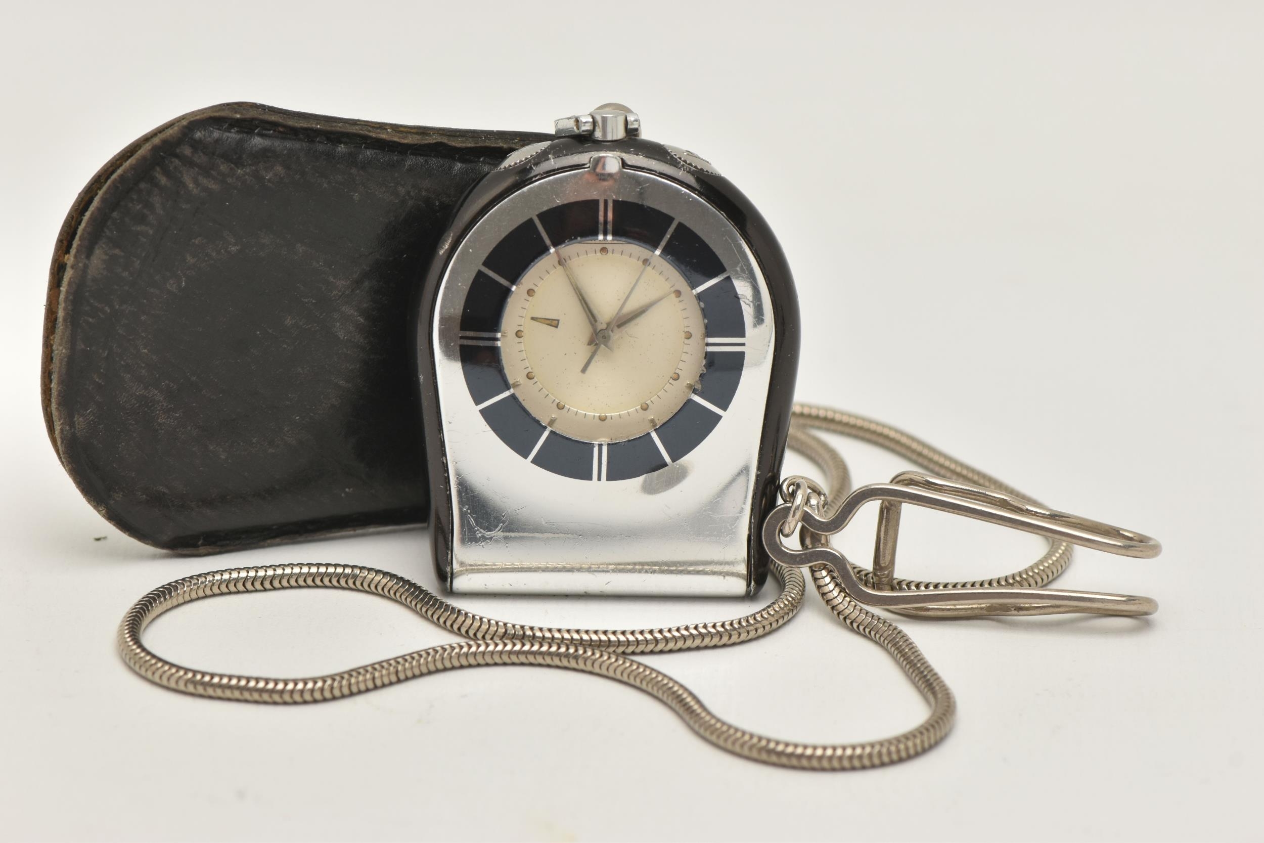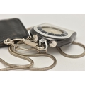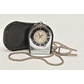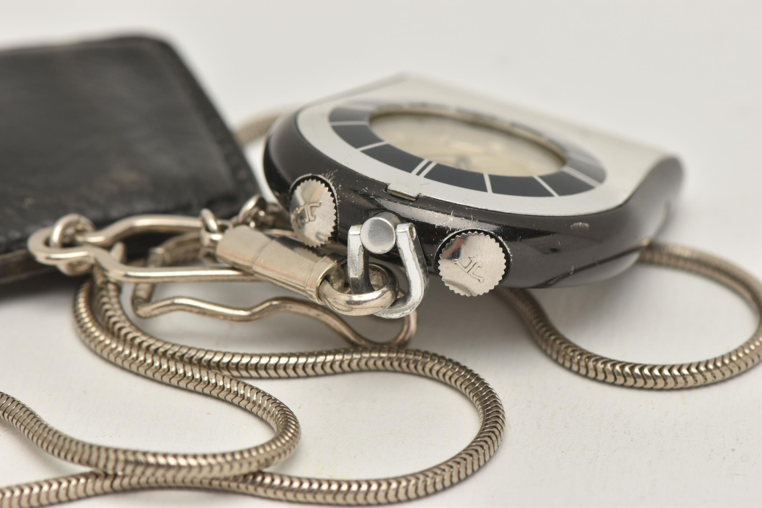 A 'JAEGAR-LE COULTRE' FOB WATCH WITH CHAIN, manual wind watch, round silver dial with baton markers, within a black and chrome case, two crowns, case back stamped 967442, together with a white metal snake chain and a small leather case (condition report: watch working at time of cataloguing although time keeping has not been tested, surface scratches, we cannot guarantee the working order of any watch)