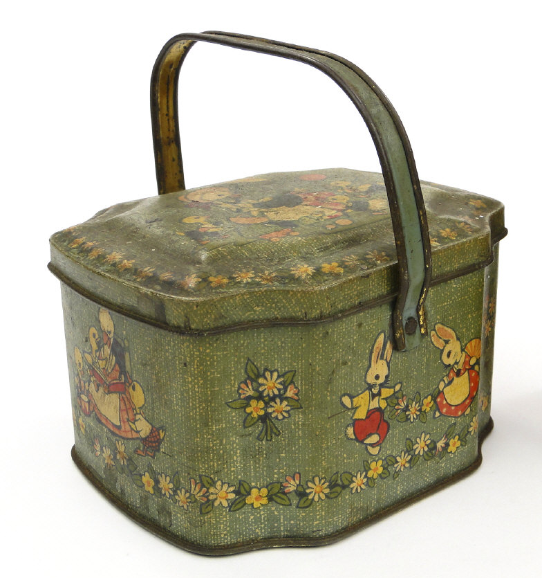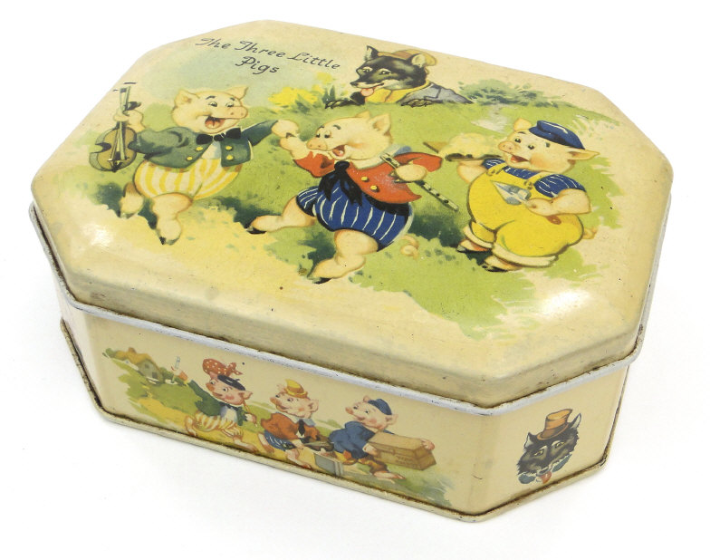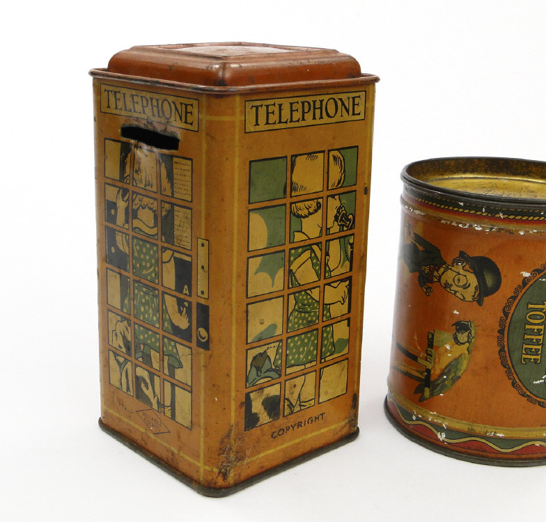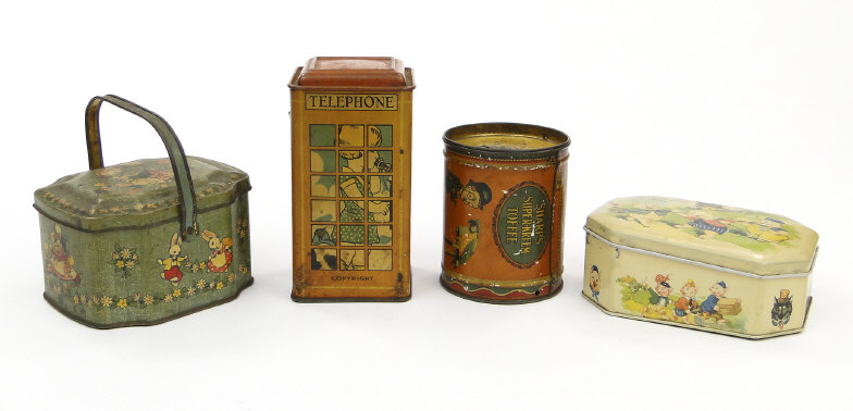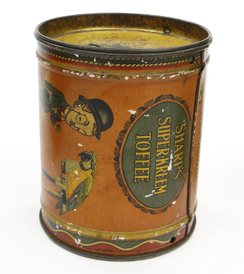 Four comical children's tins including a Sharpes Toffee money box of drum form, the largest 14cm high