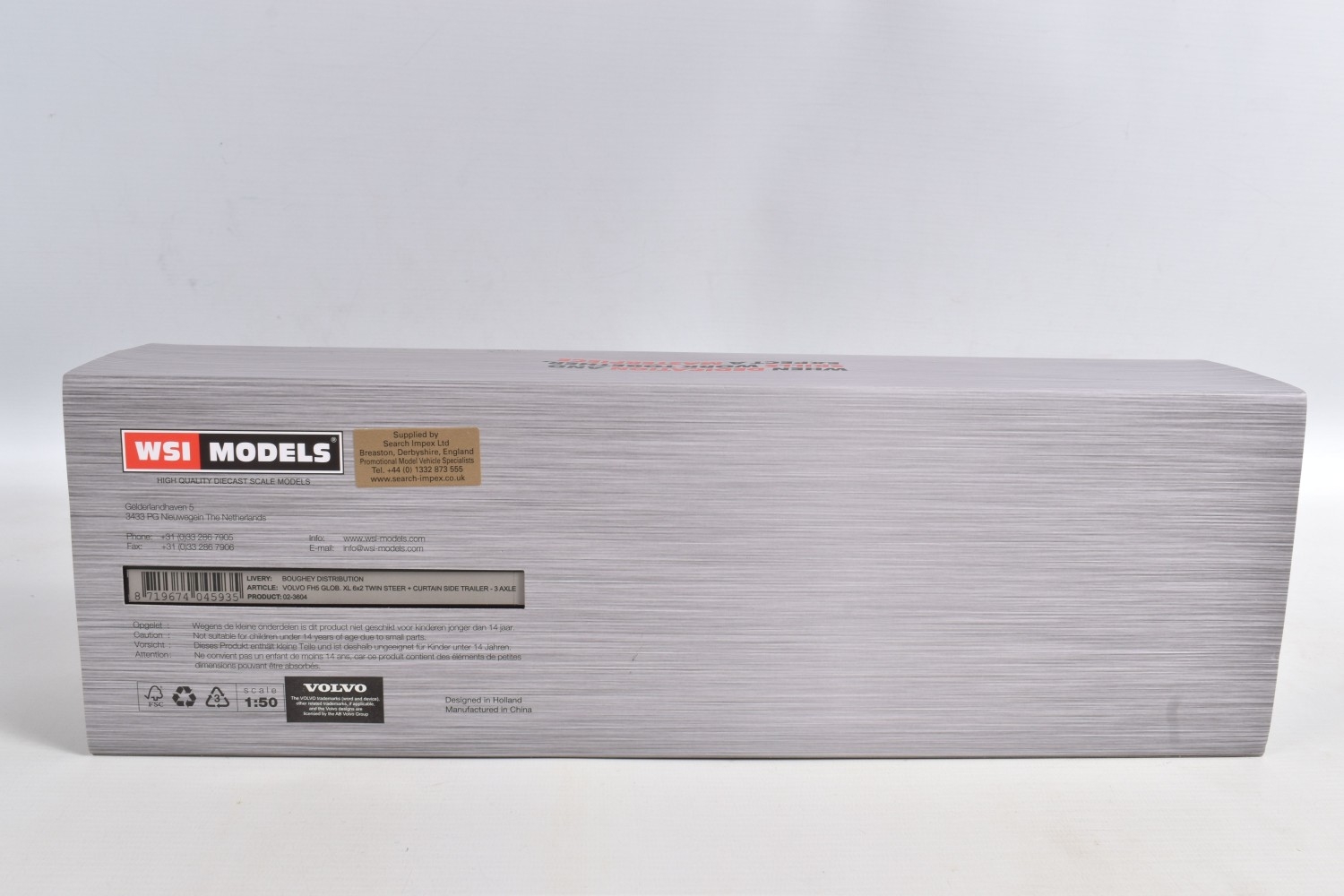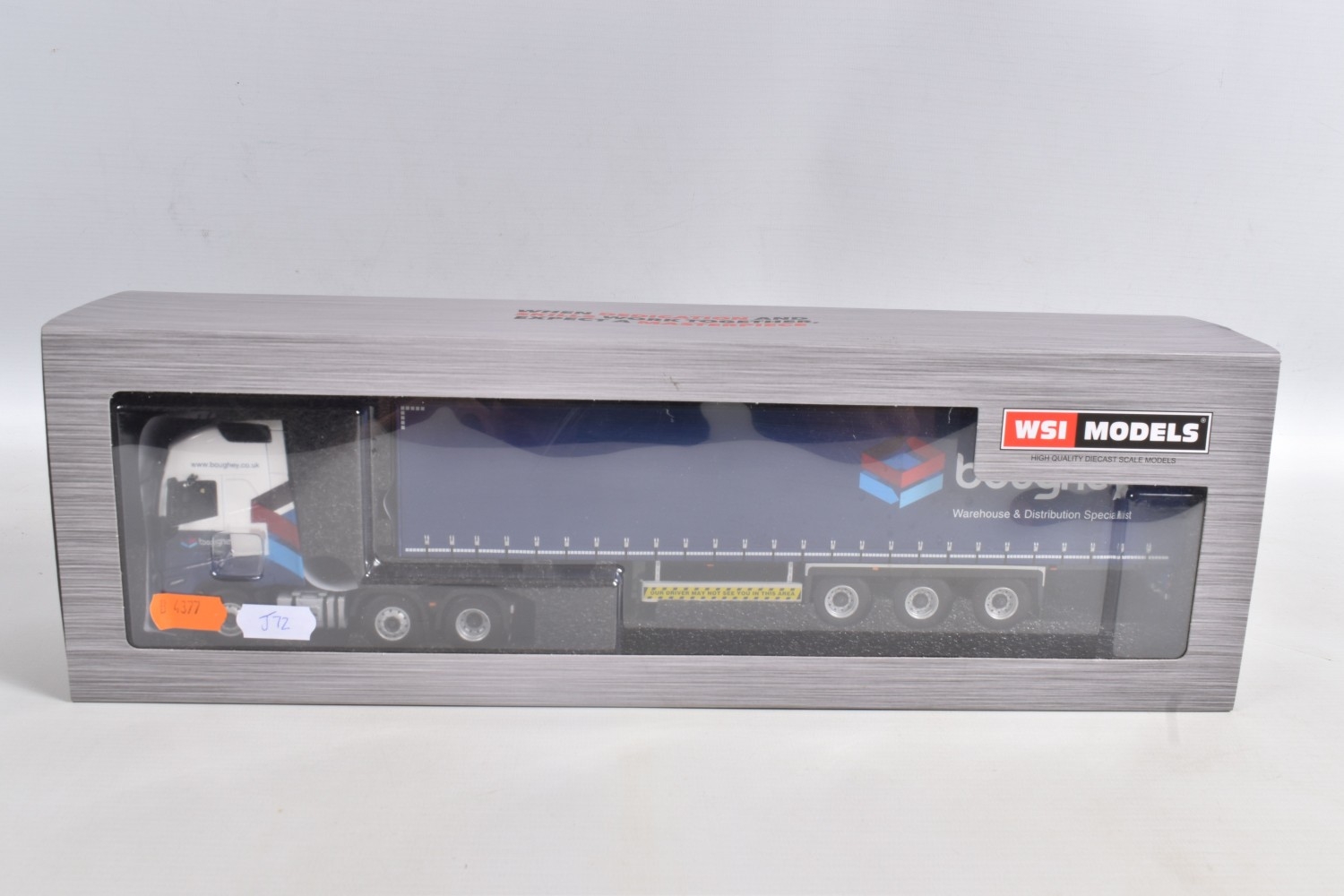A BOXED WSI MODELS VOLVO FH5 GLOB. XL 6x2 TWIN STEER + 3 AXLE CURTAINSIDE TRAILER - BOUGHEY DISTRIBUTION, No.02-3604, 1/50 scale, limited edition with Certificate of Authenticity No.218 of 230, appears largely complete and in very good condition, box complete but has some very minor damage, marking and wear