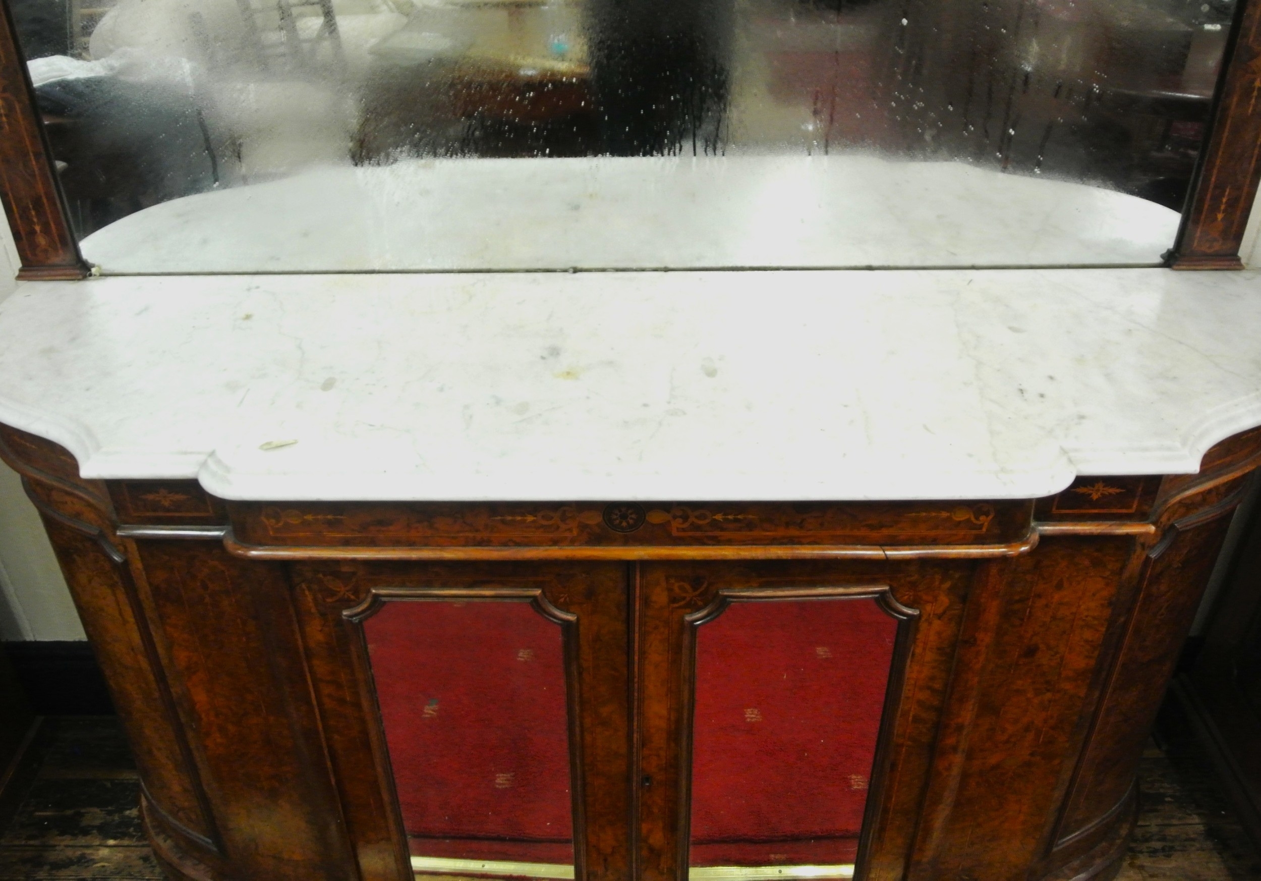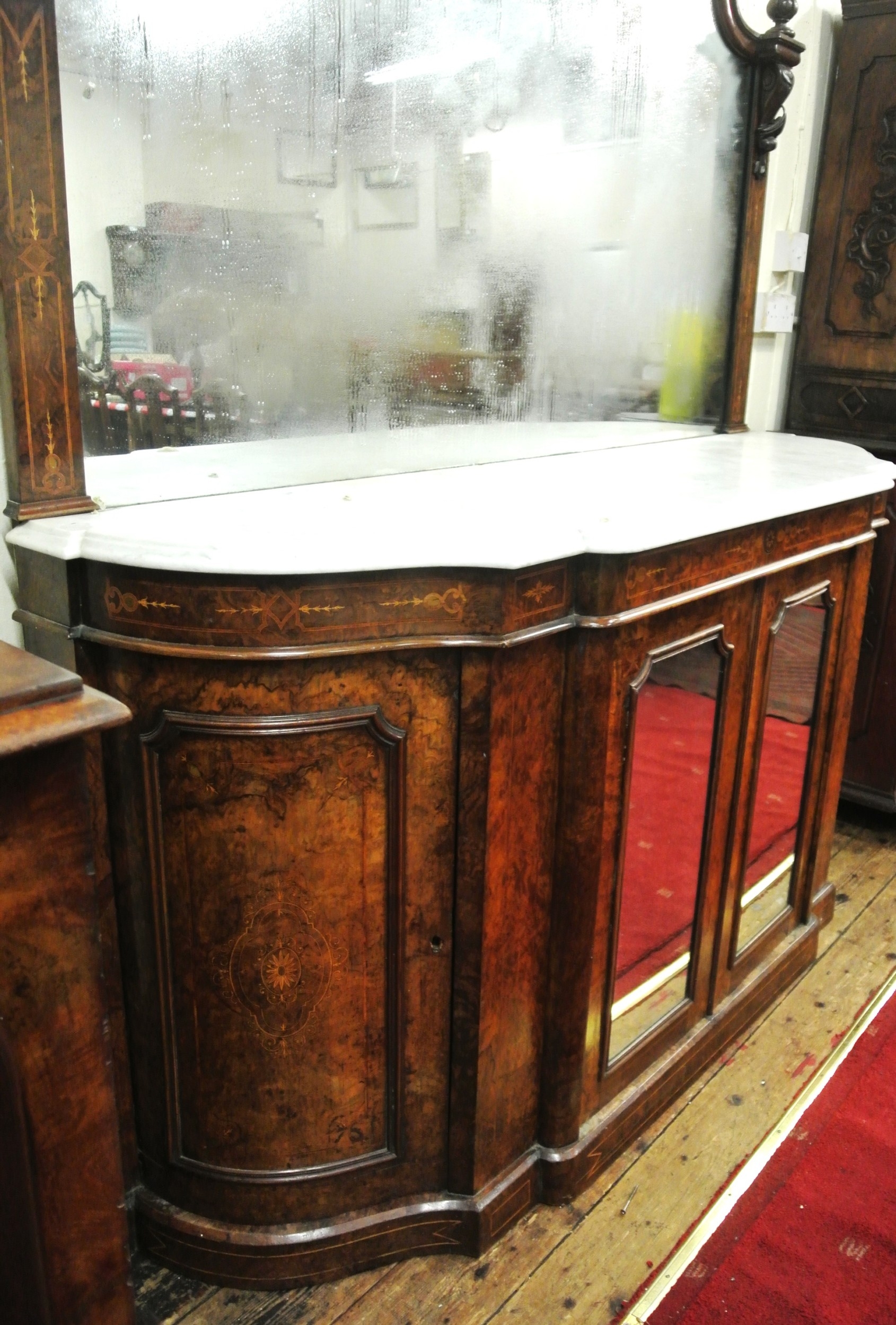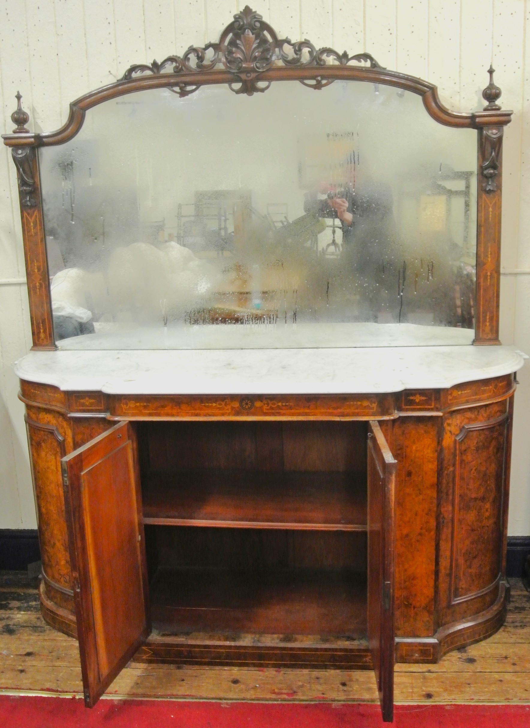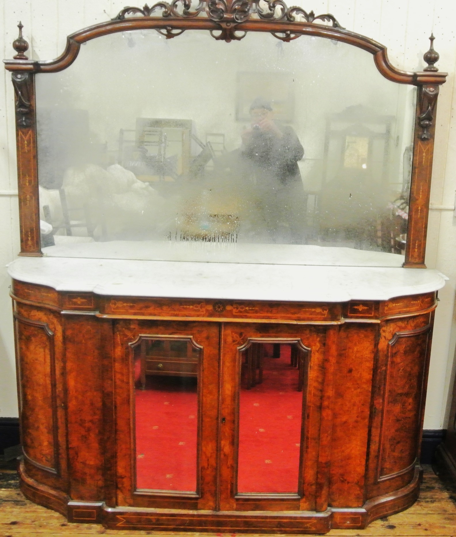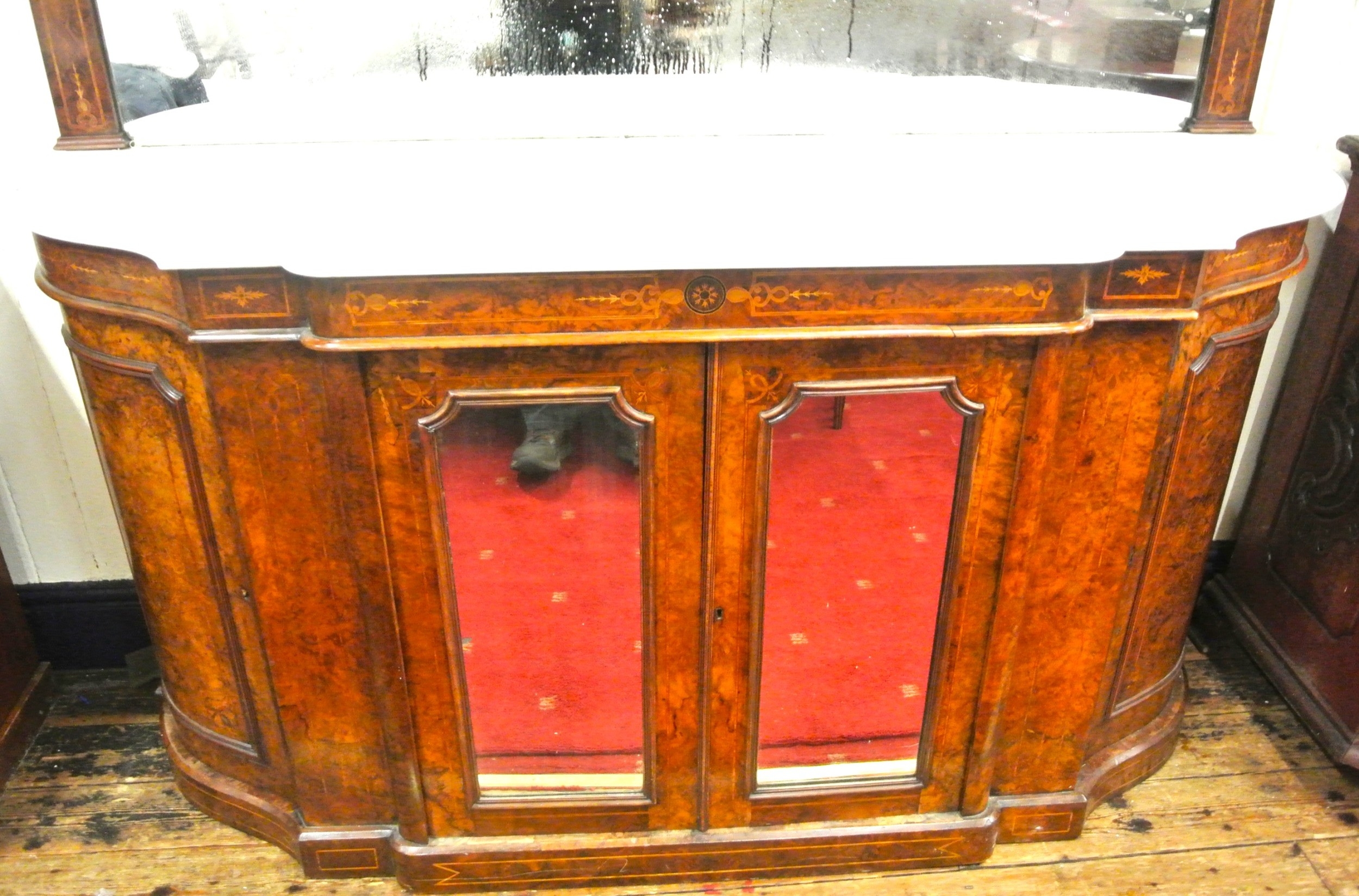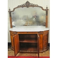Edwardian inlaid walnut chiffonier sideboard with ornate mirrored back, scroll carved pediment, shaped finials, shaped marble top, presses under with foliate inlaid and mirrored doors, on plinth