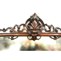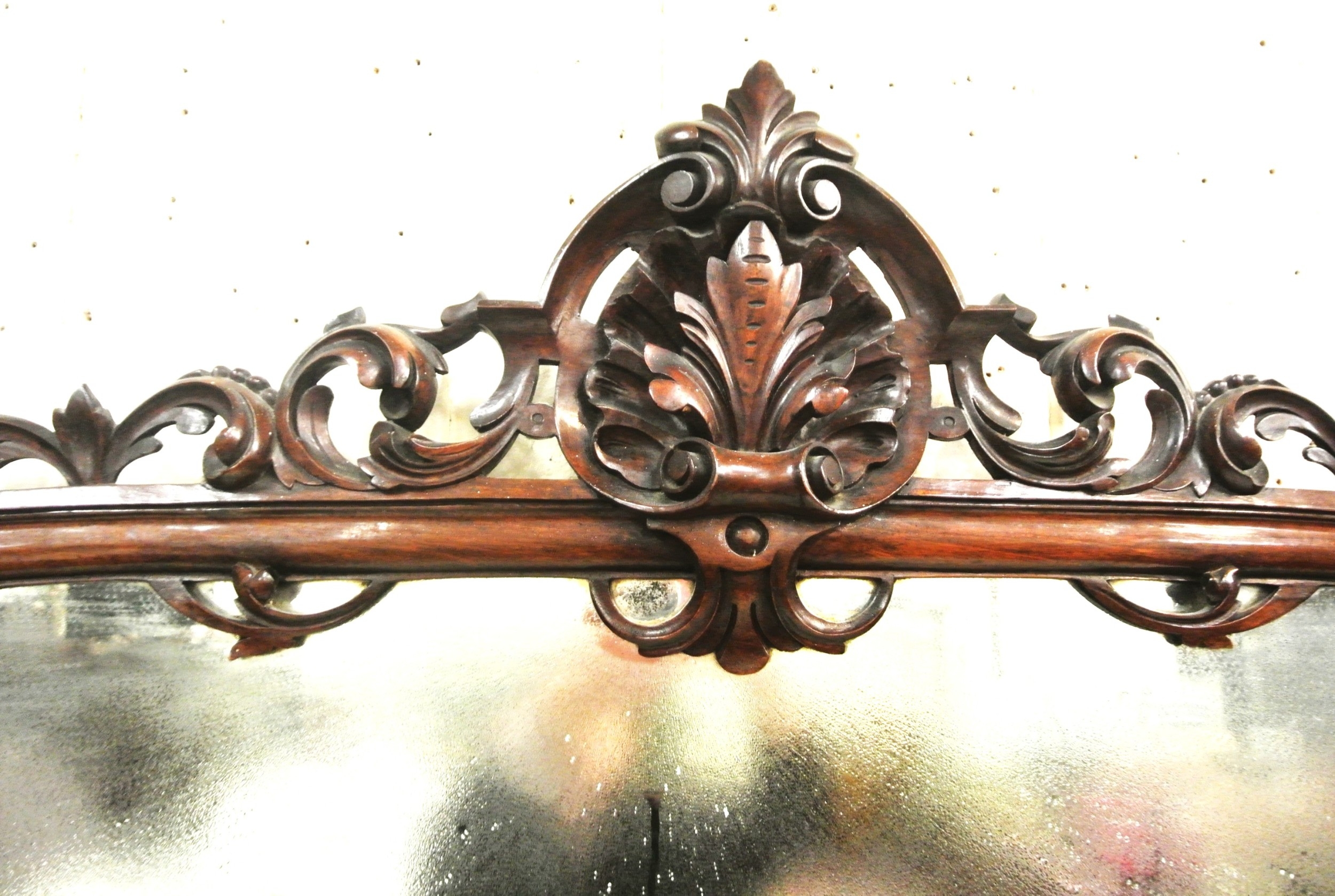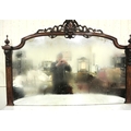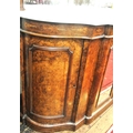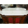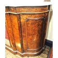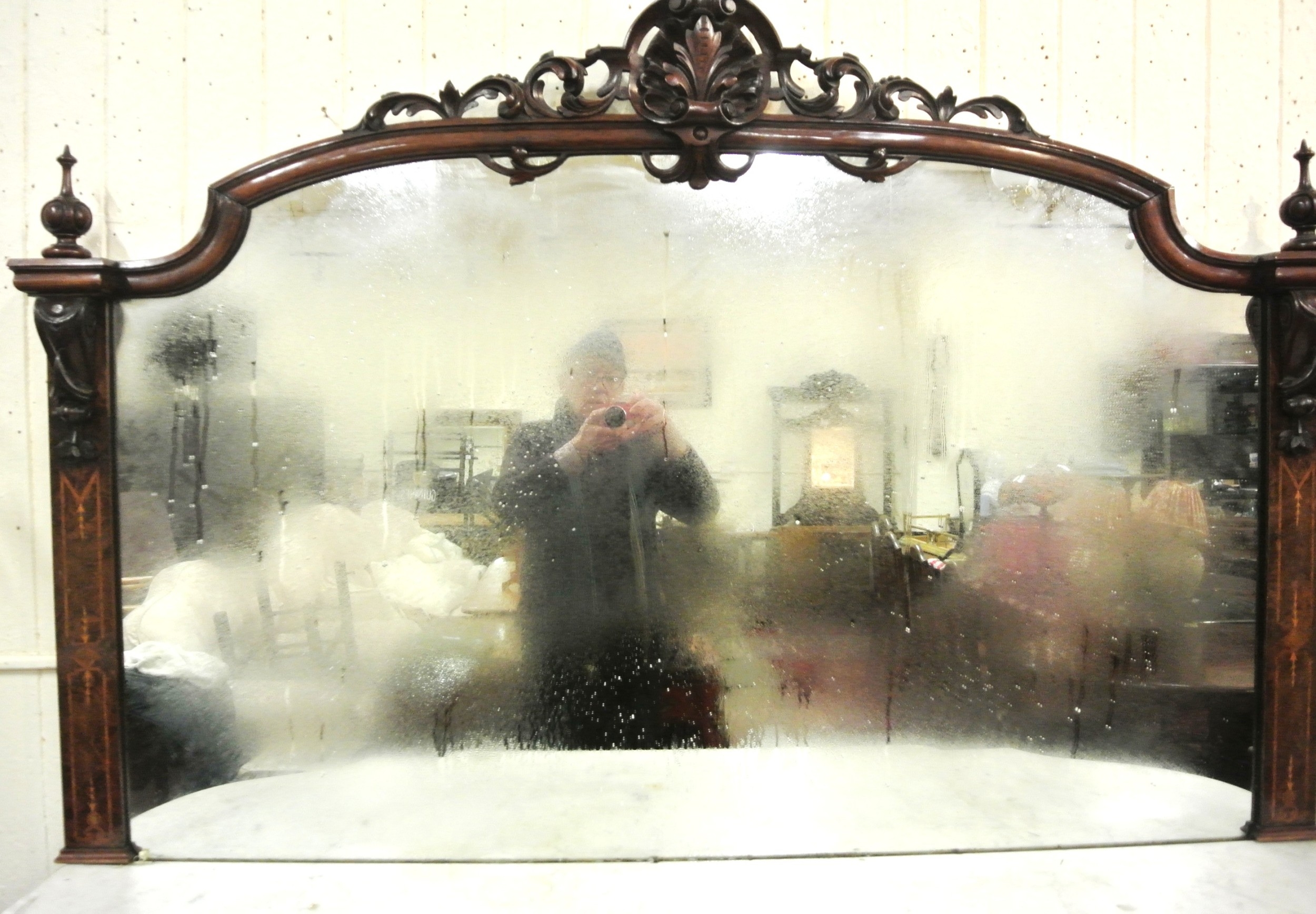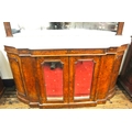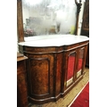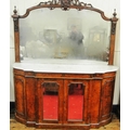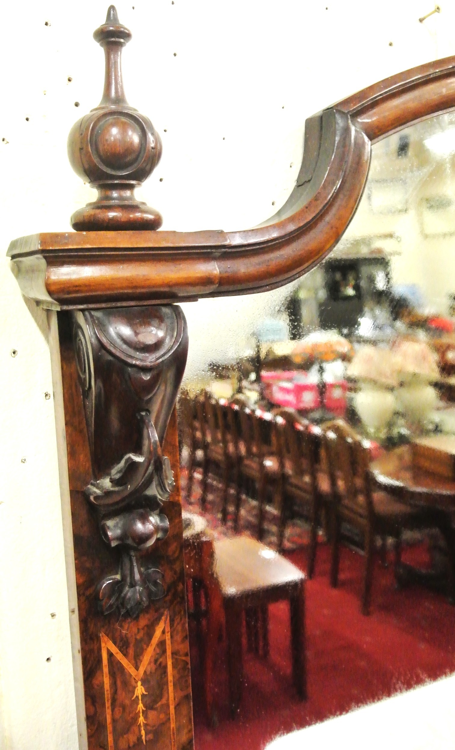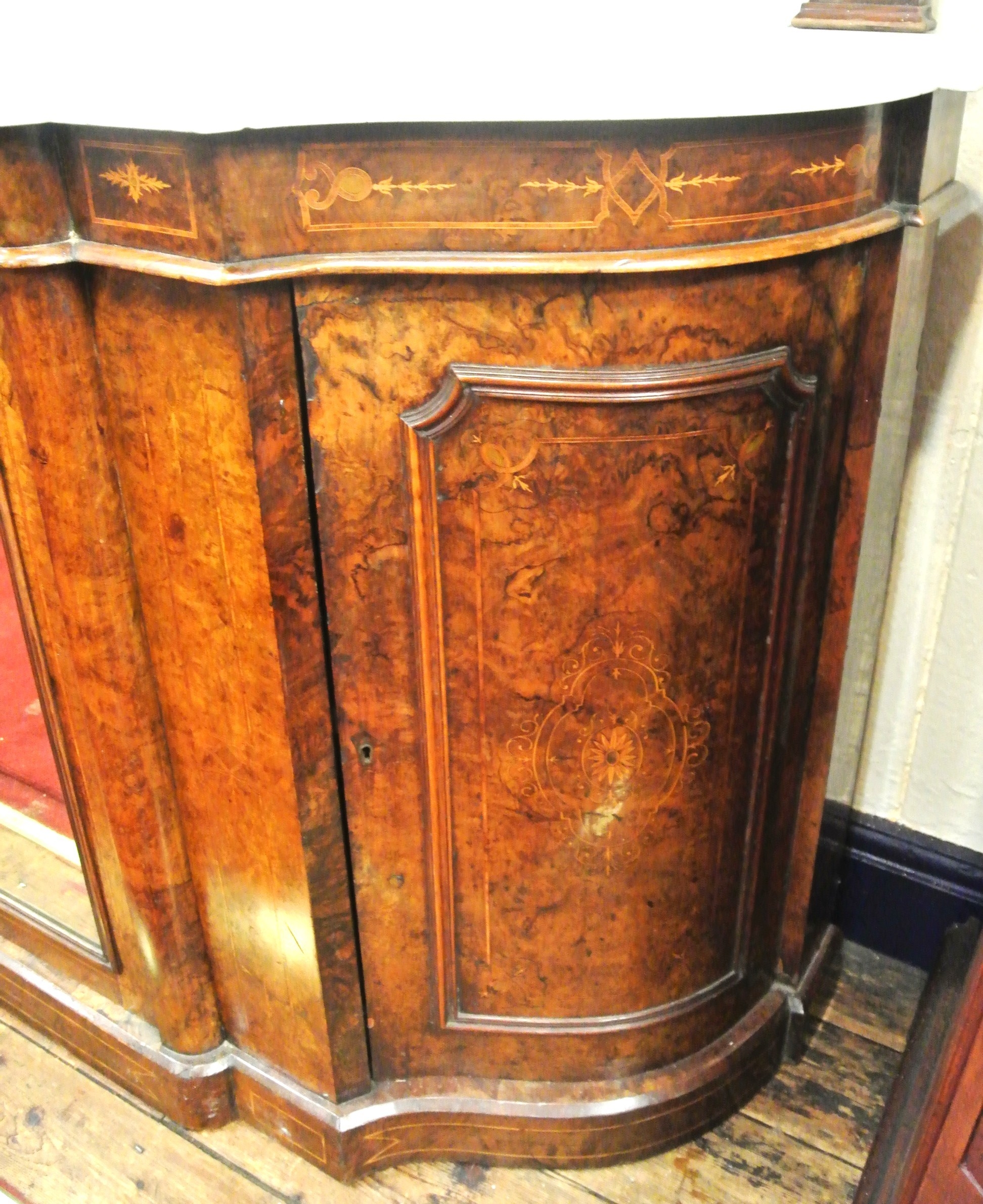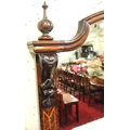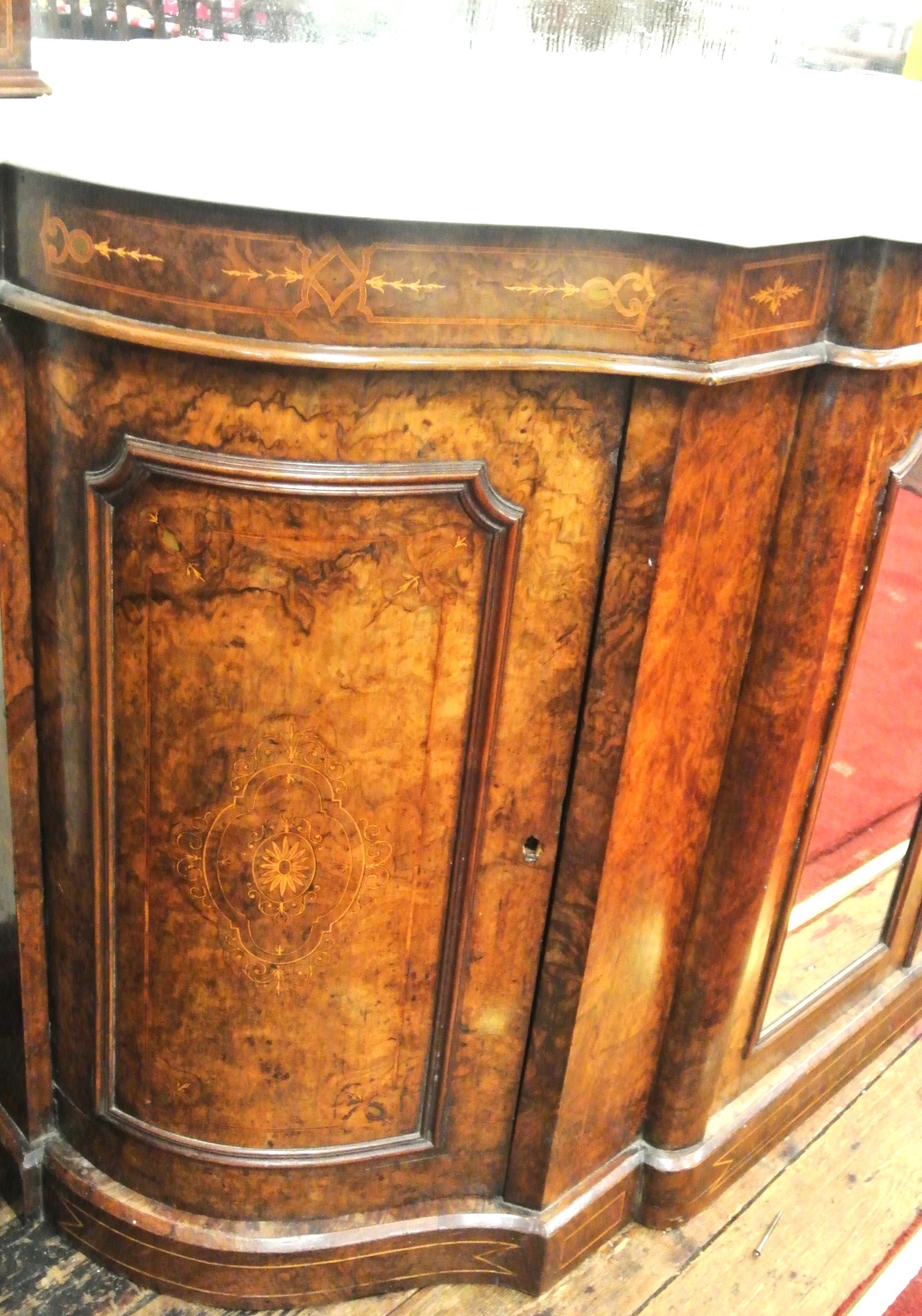 Edwardian inlaid walnut chiffonier sideboard with ornate mirrored back, scroll carved pediment, shaped finials, shaped marble top, presses under with foliate inlaid and mirrored doors, on plinth