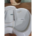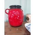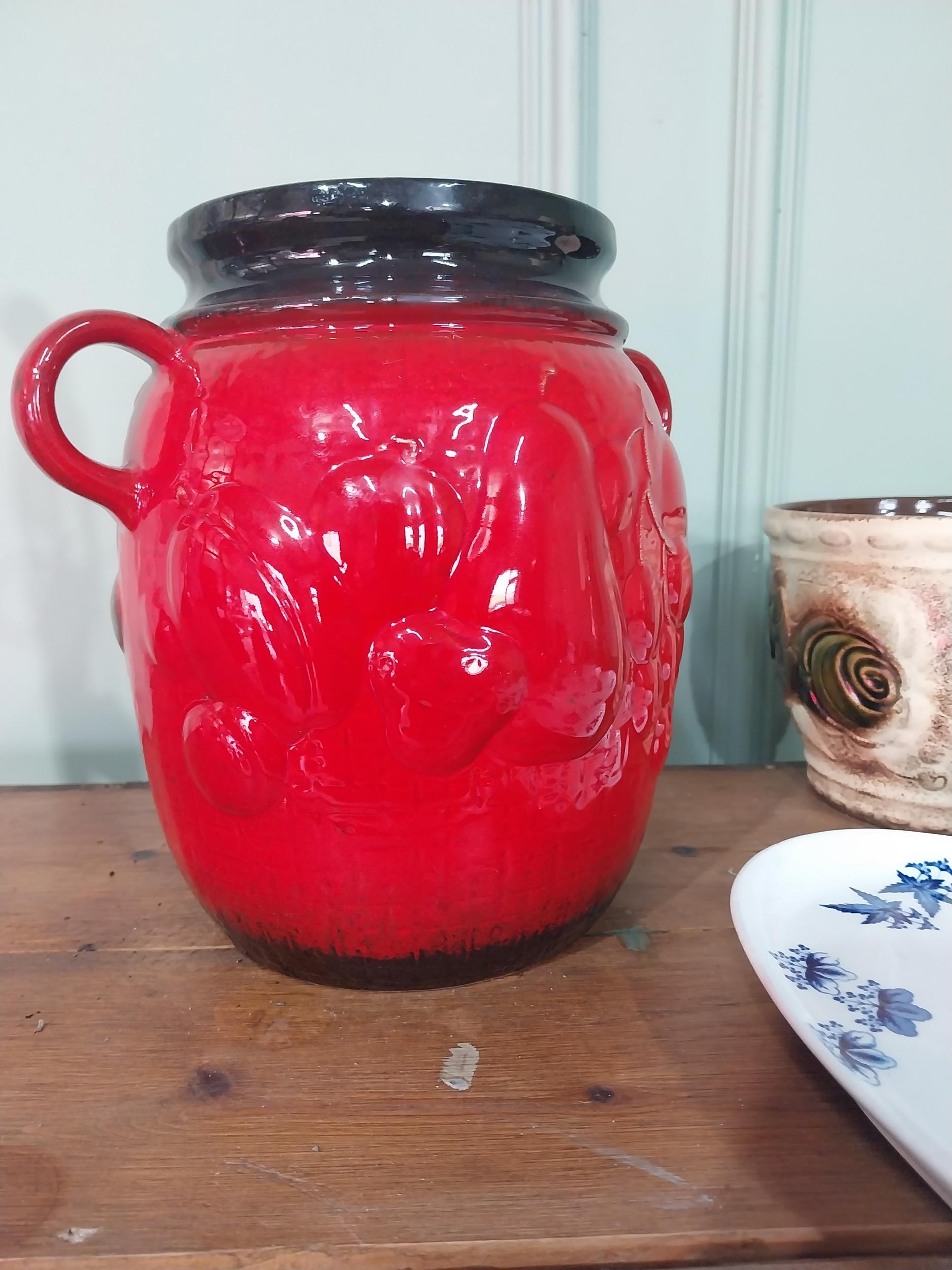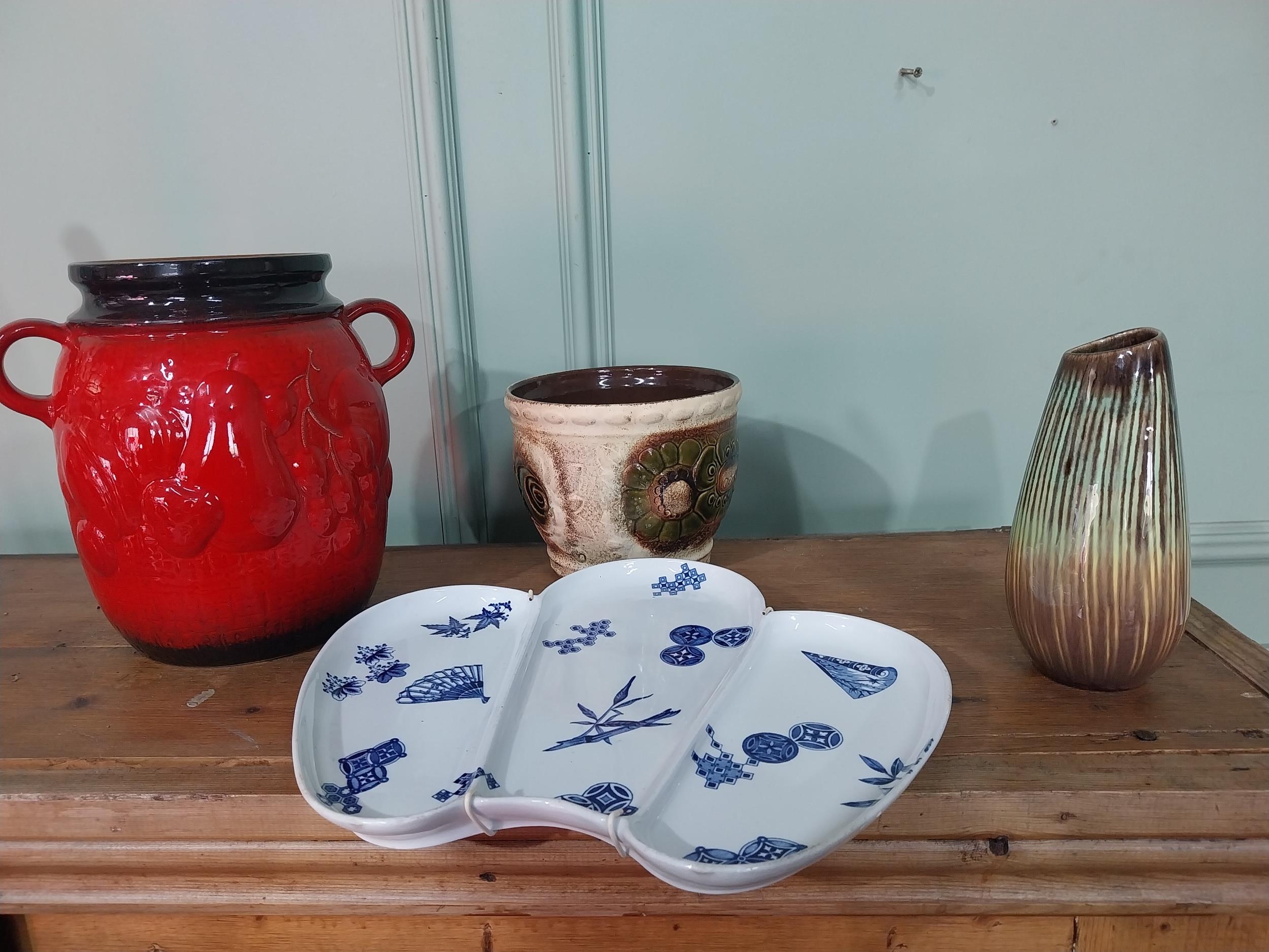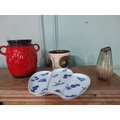 Three pieces of Mid Century German pottery vases and Aesthetic Movement ceramic fan plate.
