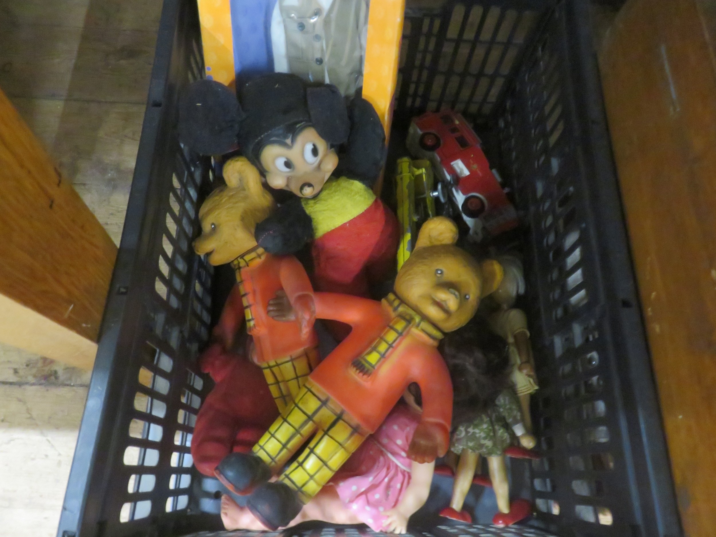 Box of Dinky Vehicles, Rupert the Bear, Mickey Mouse Soft Toys etc