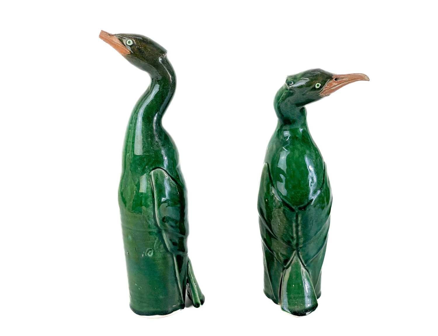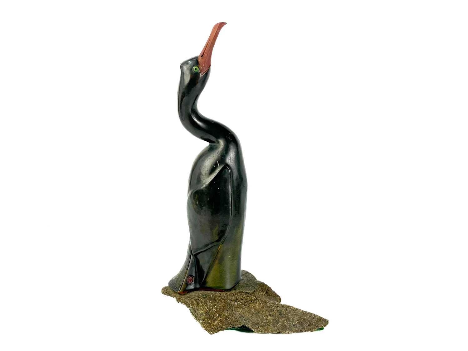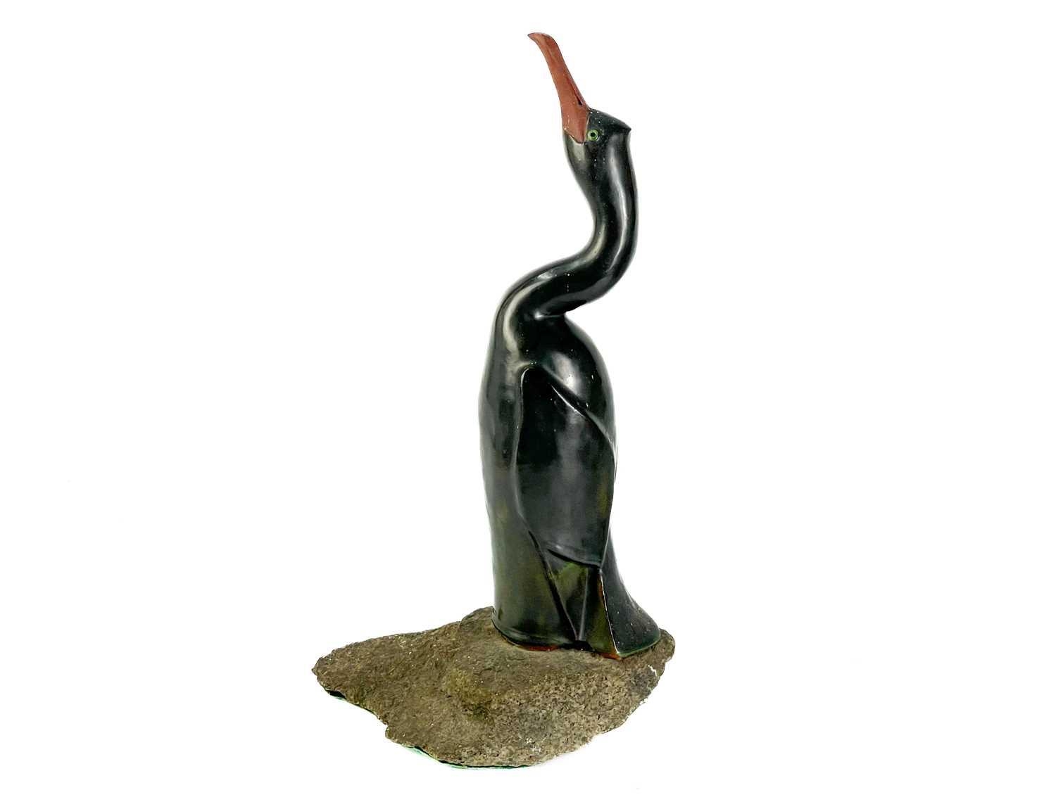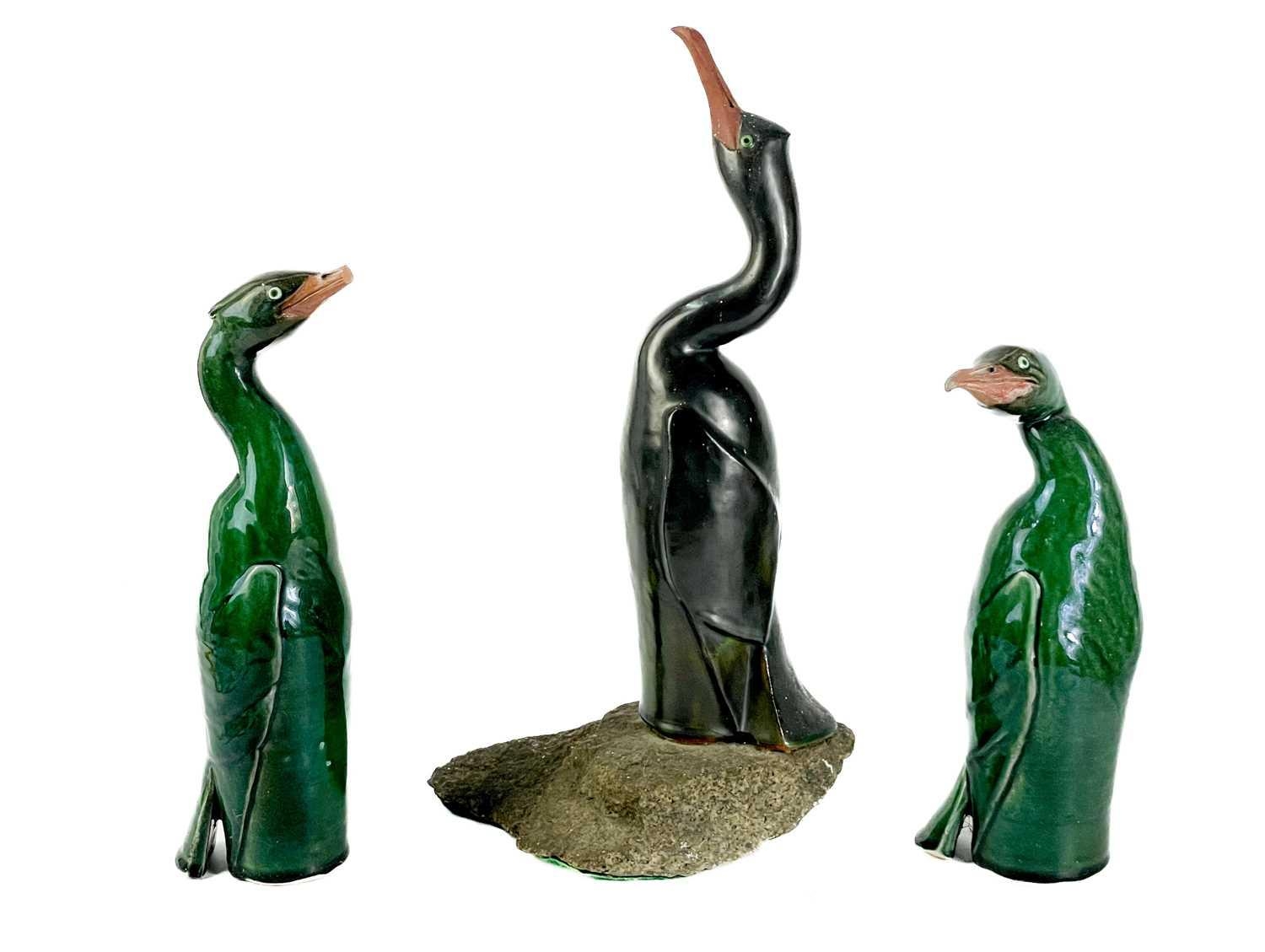 Humfrey Wakefield - A pottery cormorant on stone stand. With HW seal mark. Height 39cm. Together with two other teal coloured pottery birds by the same hand, each with printed mark to base (3). Beak off of one of the green pottery birds, the larger bird has a chip repair to the base. Image of affected area on line.