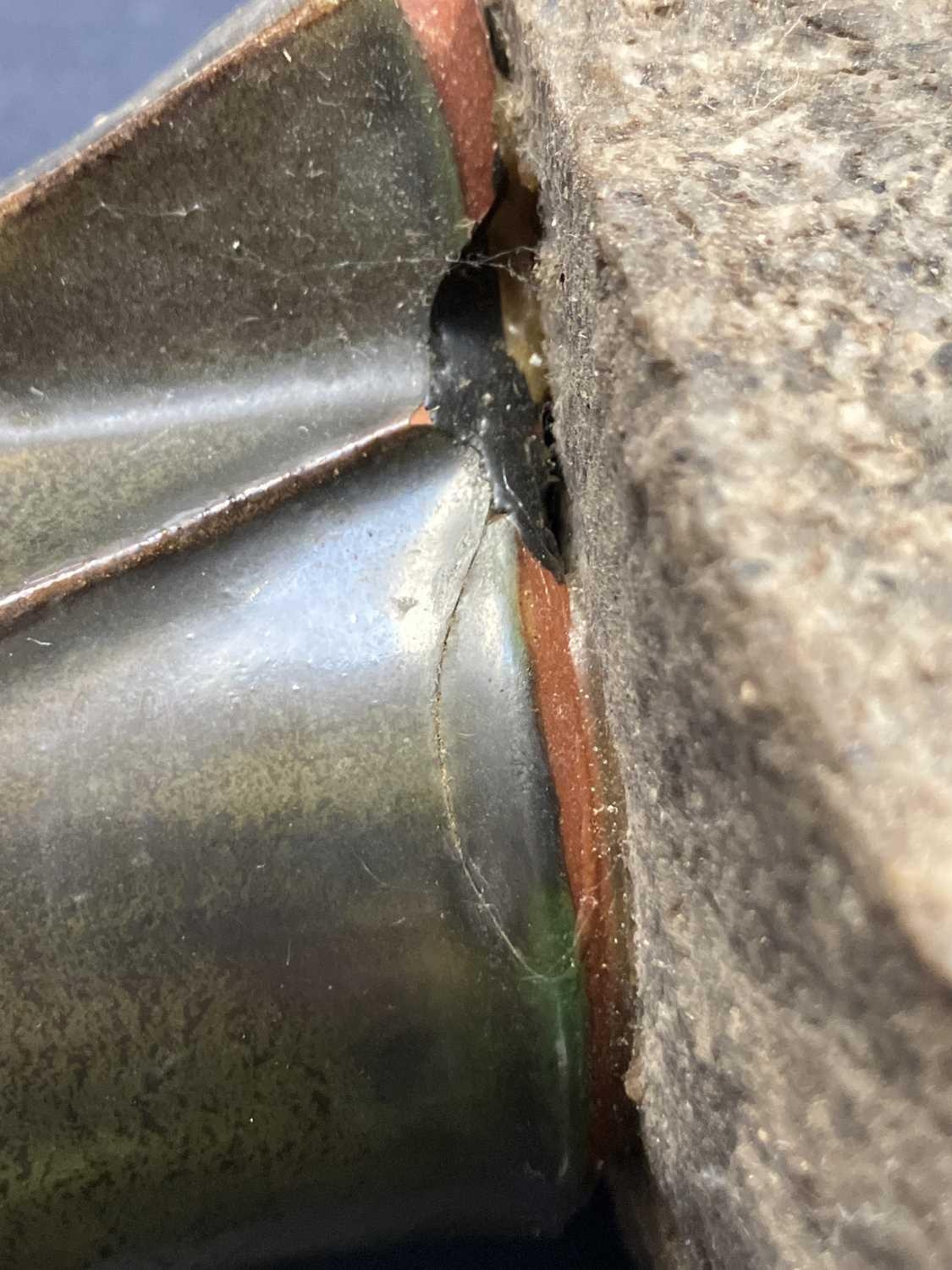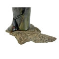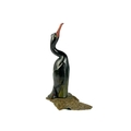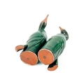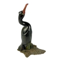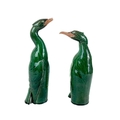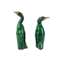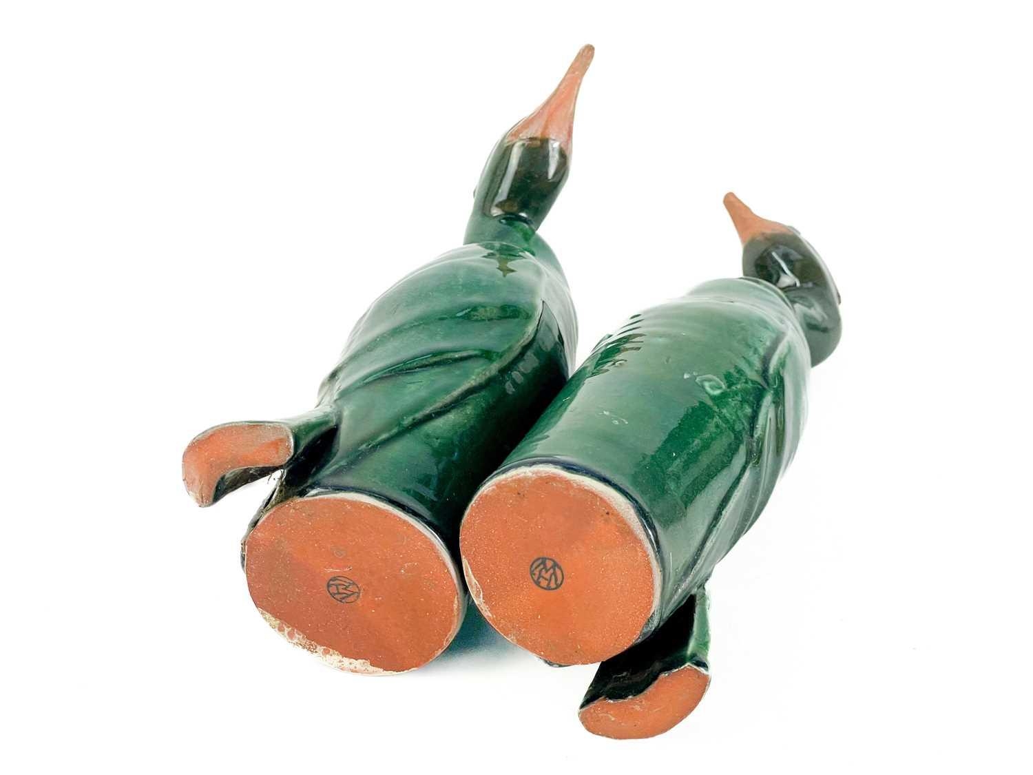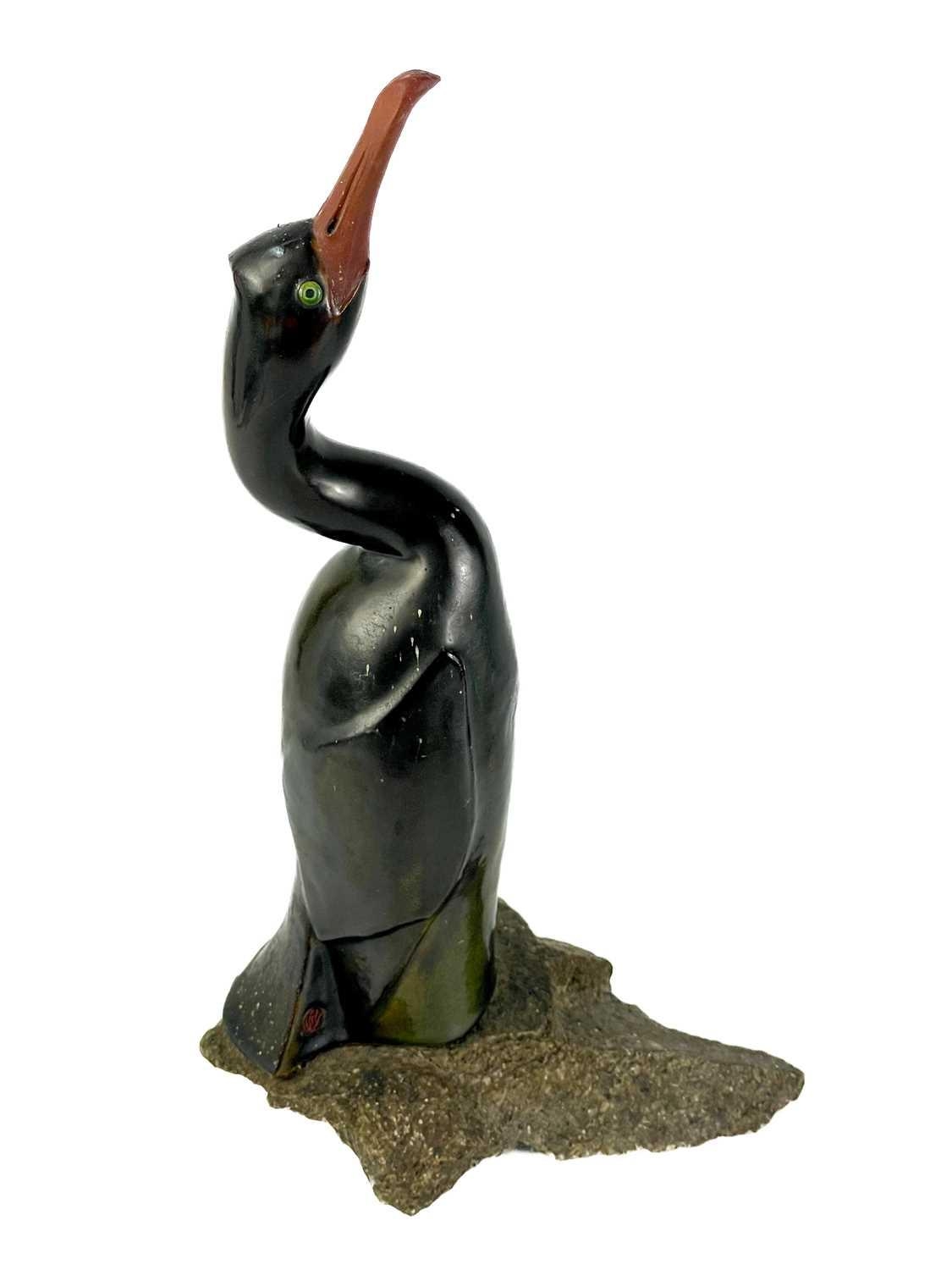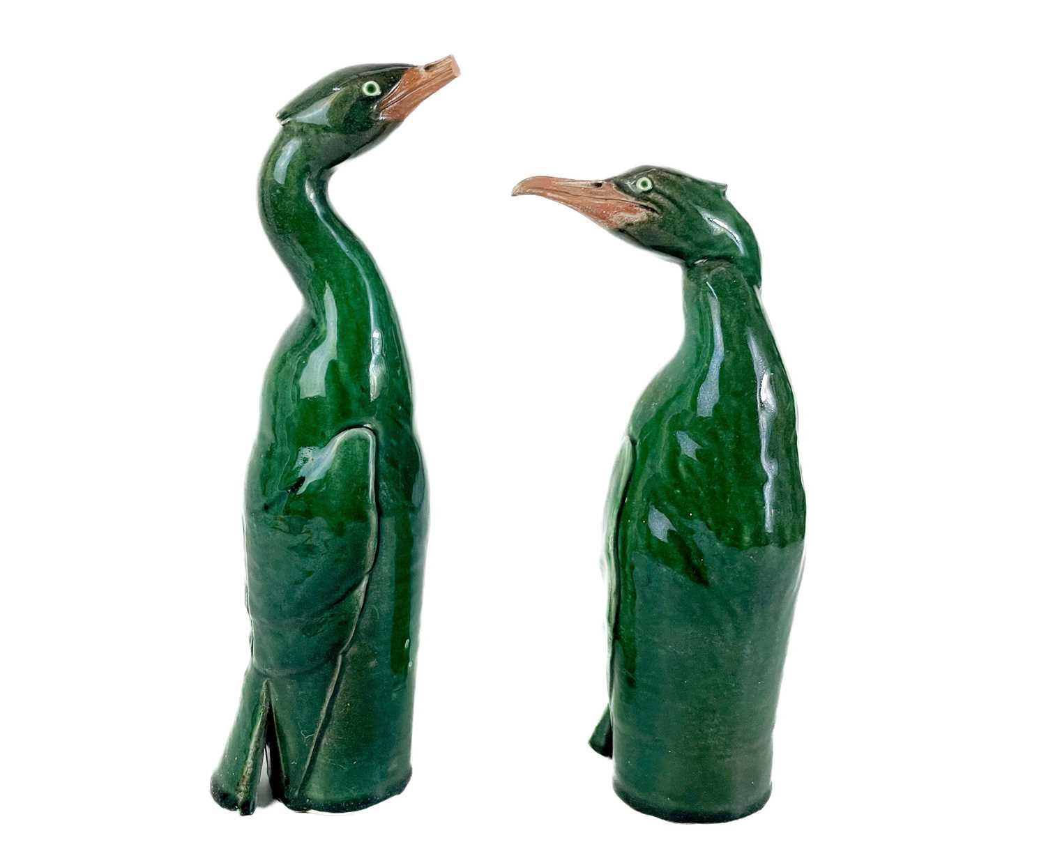 Humfrey Wakefield - A pottery cormorant on stone stand. With HW seal mark. Height 39cm. Together with two other teal coloured pottery birds by the same hand, each with printed mark to base (3). Beak off of one of the green pottery birds, the larger bird has a chip repair to the base. Image of affected area on line.