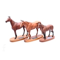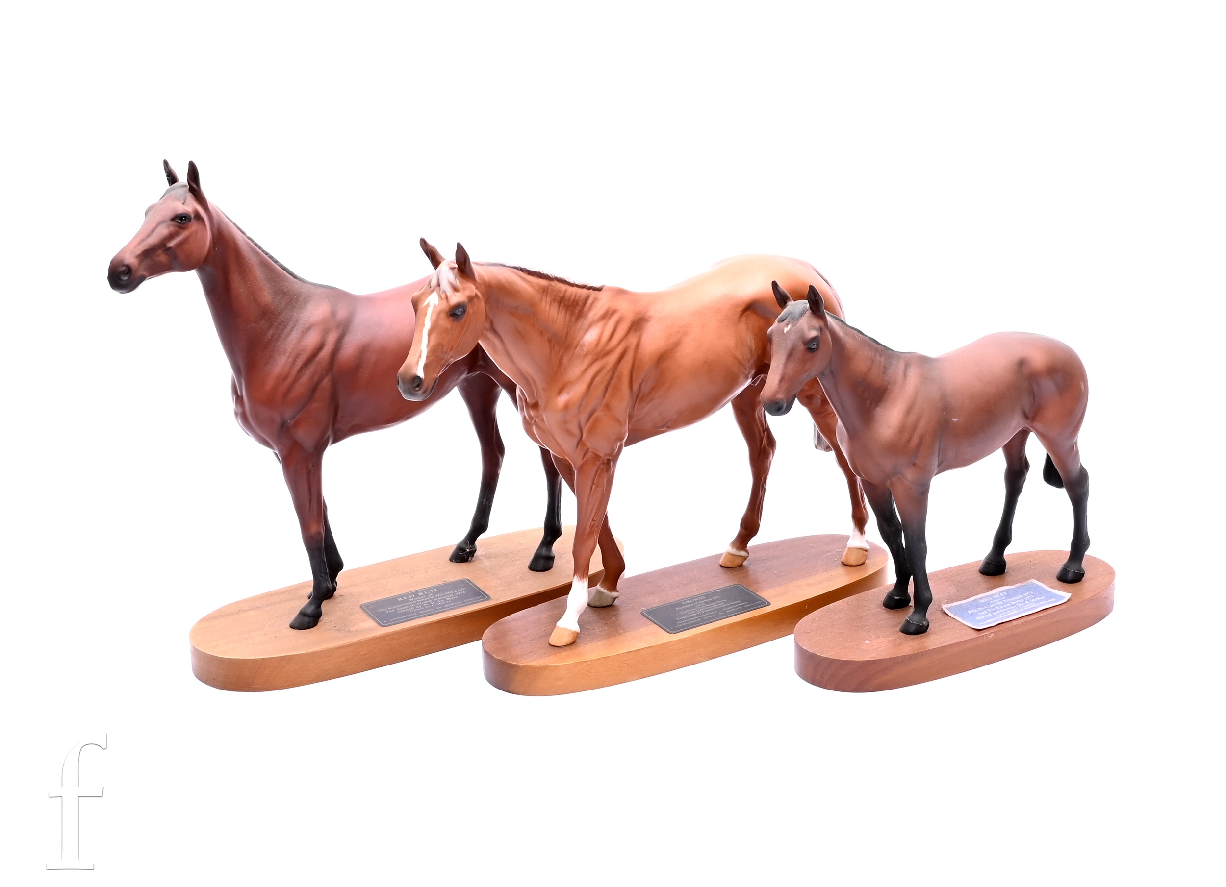 A Beswick Conoisseur Collection figure 'Red Rum, modelled standing on oval wooden base, with label, height 32cm, together with 'Grundy' and 'Mill Reef'. (3)