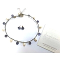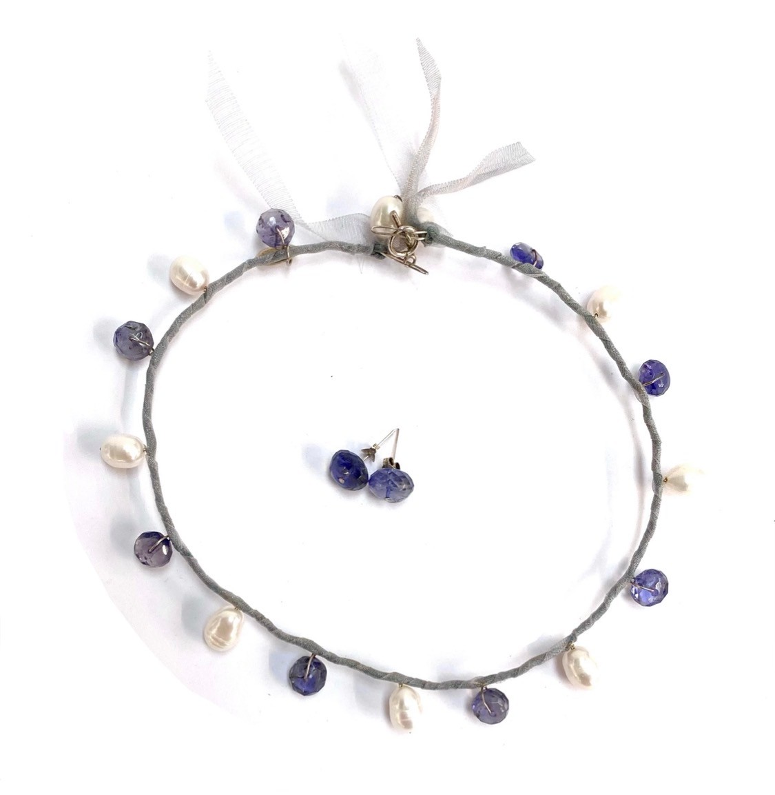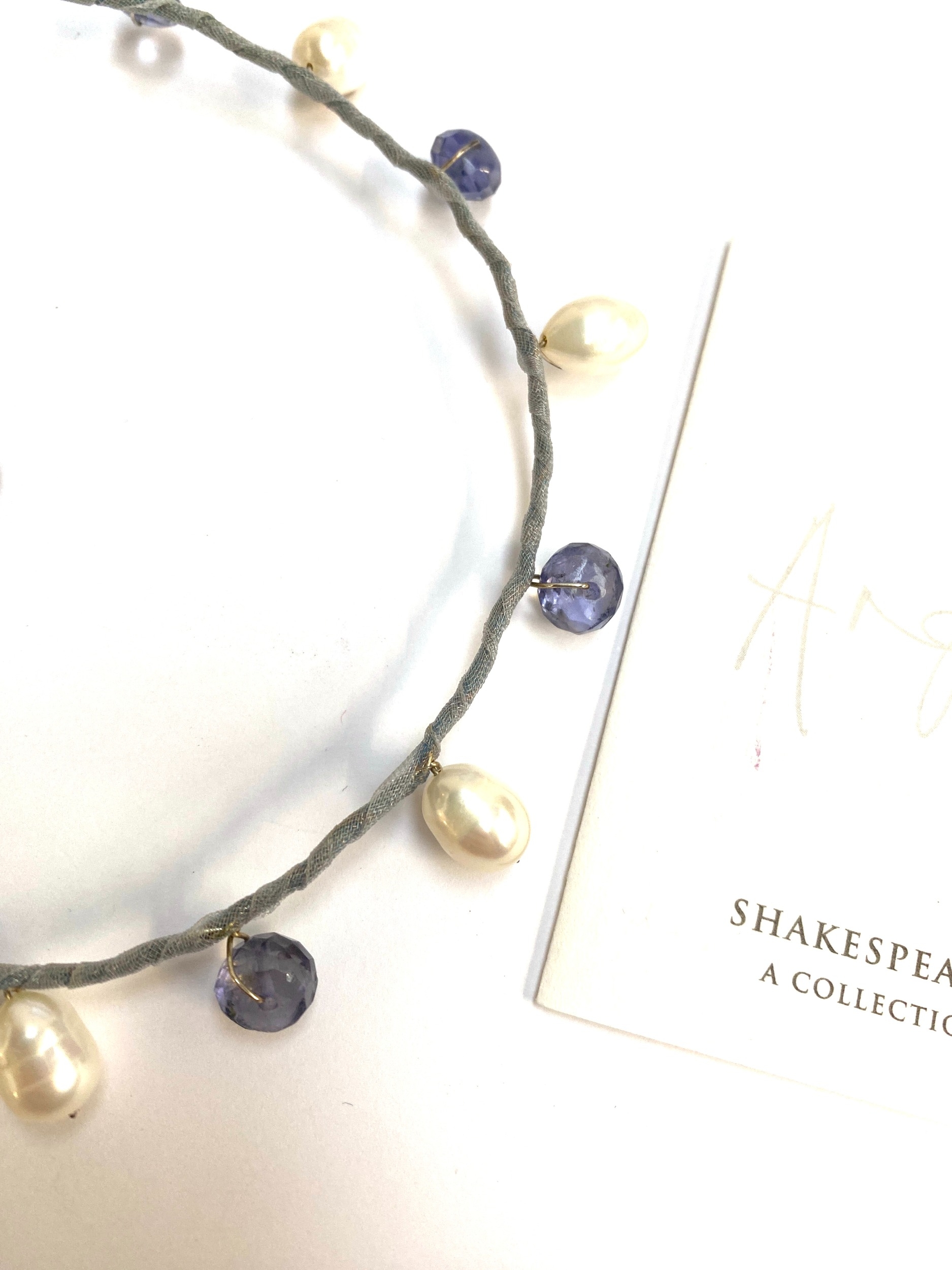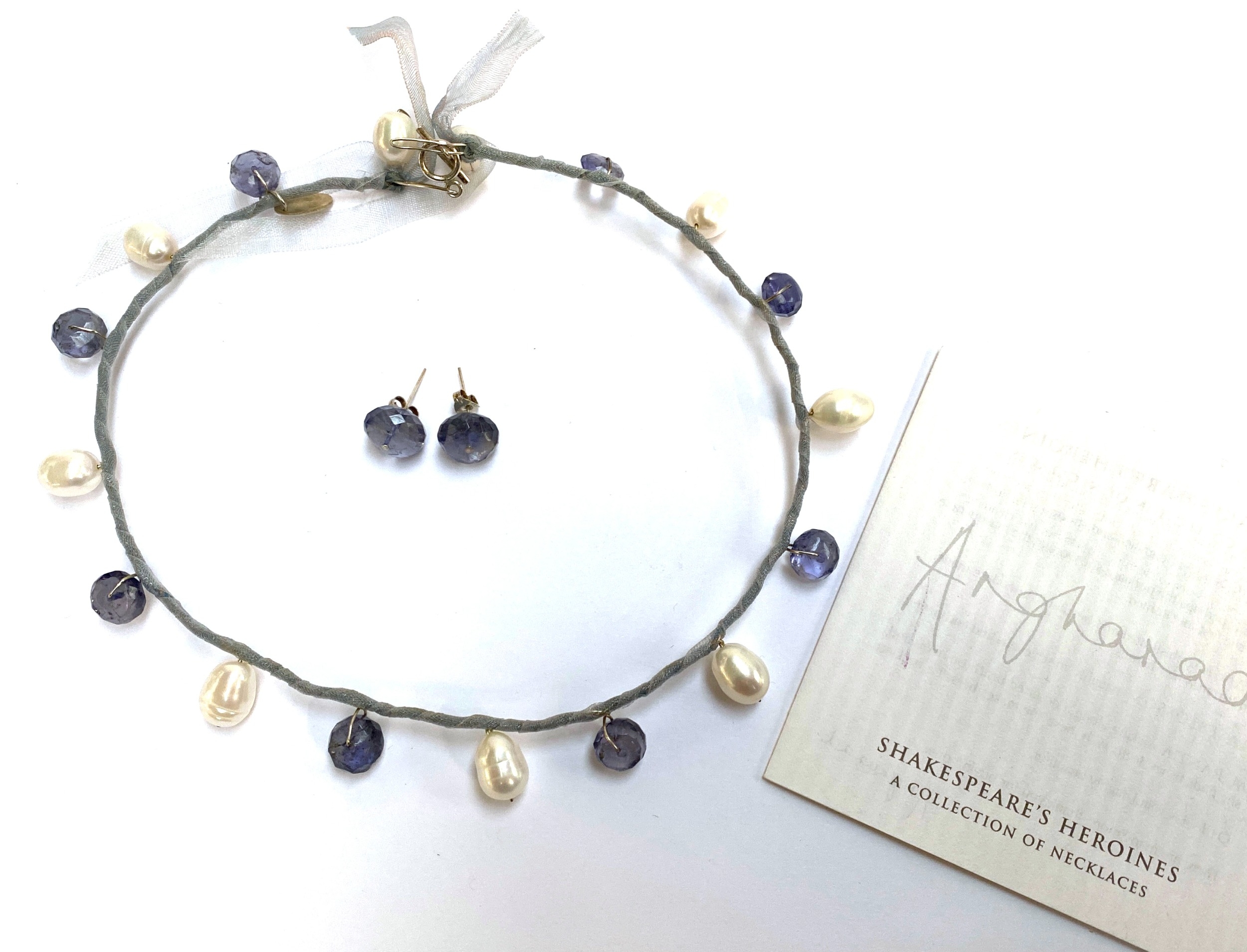Designed by Angharad Rees for her 'Shakespeare's Heroines Collection': a silver, freshwater pearl and iolite bead choker style necklace and matching stud earrings, the pearls 12mmL, marked to tab, 34cmL