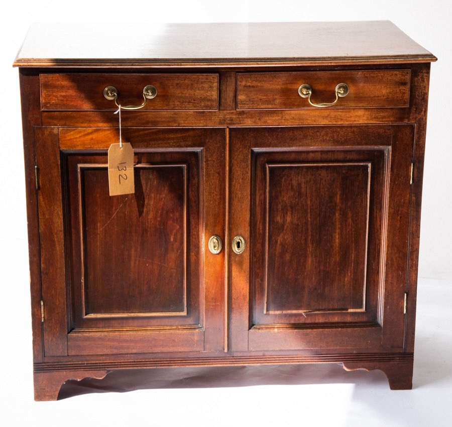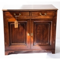 EARLY NINETEENTH CENTURY MAHOGANY SIDE CABINET, the oblong top above a pair of frieze drawers, fitted with swan neck brass handles, and pair of panelled cupboard doors, and raised on bracket feet, 33” (83.8cm) high, 37” x 18 ¾” (94cm x 47.6cm)