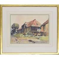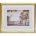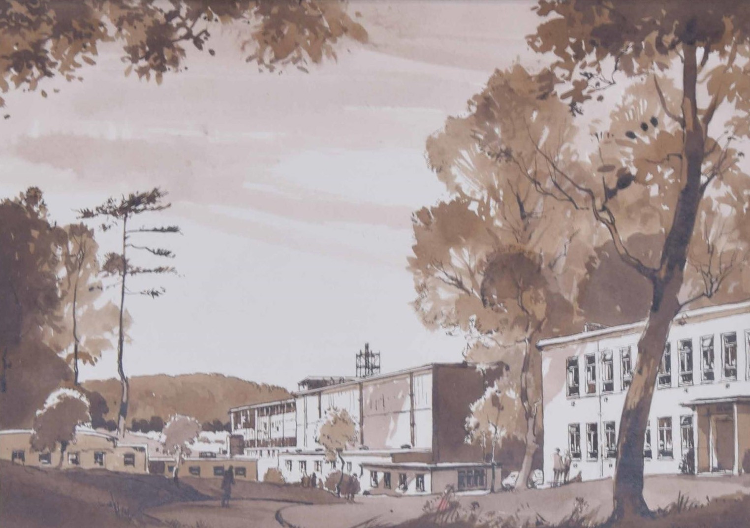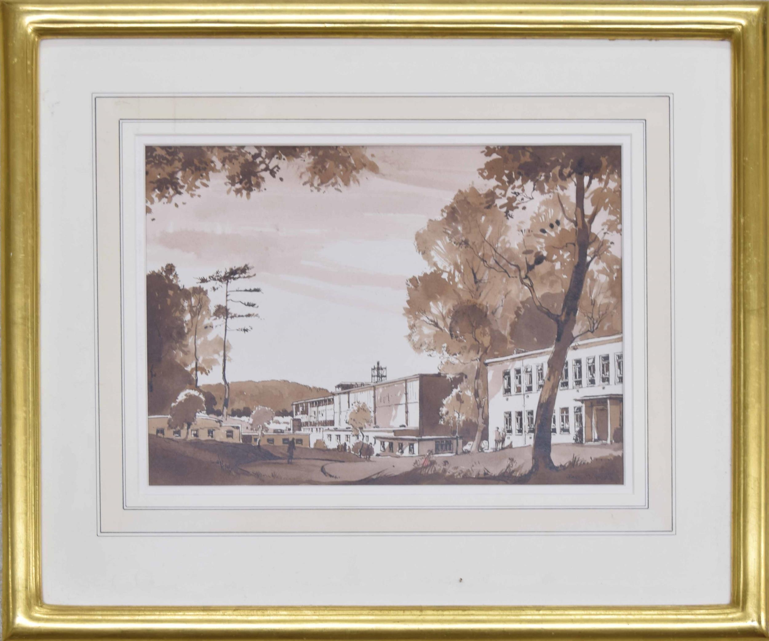 Jack Merriott RI., ROI., RSMA., RWS., (1901-1968) - Figures beside buildings, an architectural subject with trees in the foreground, signed, pen, ink and sepia wash, 9.75" x 13.25"