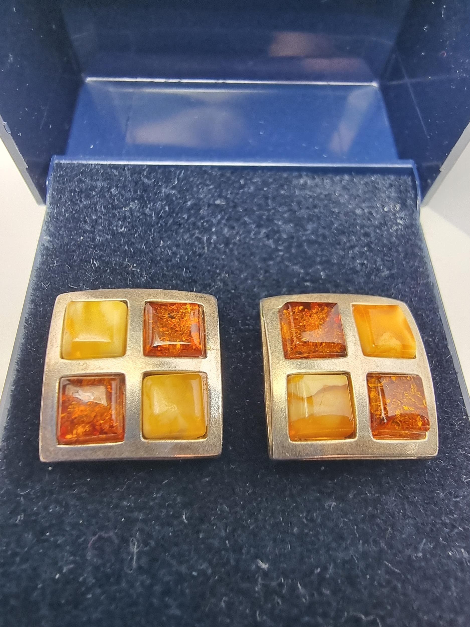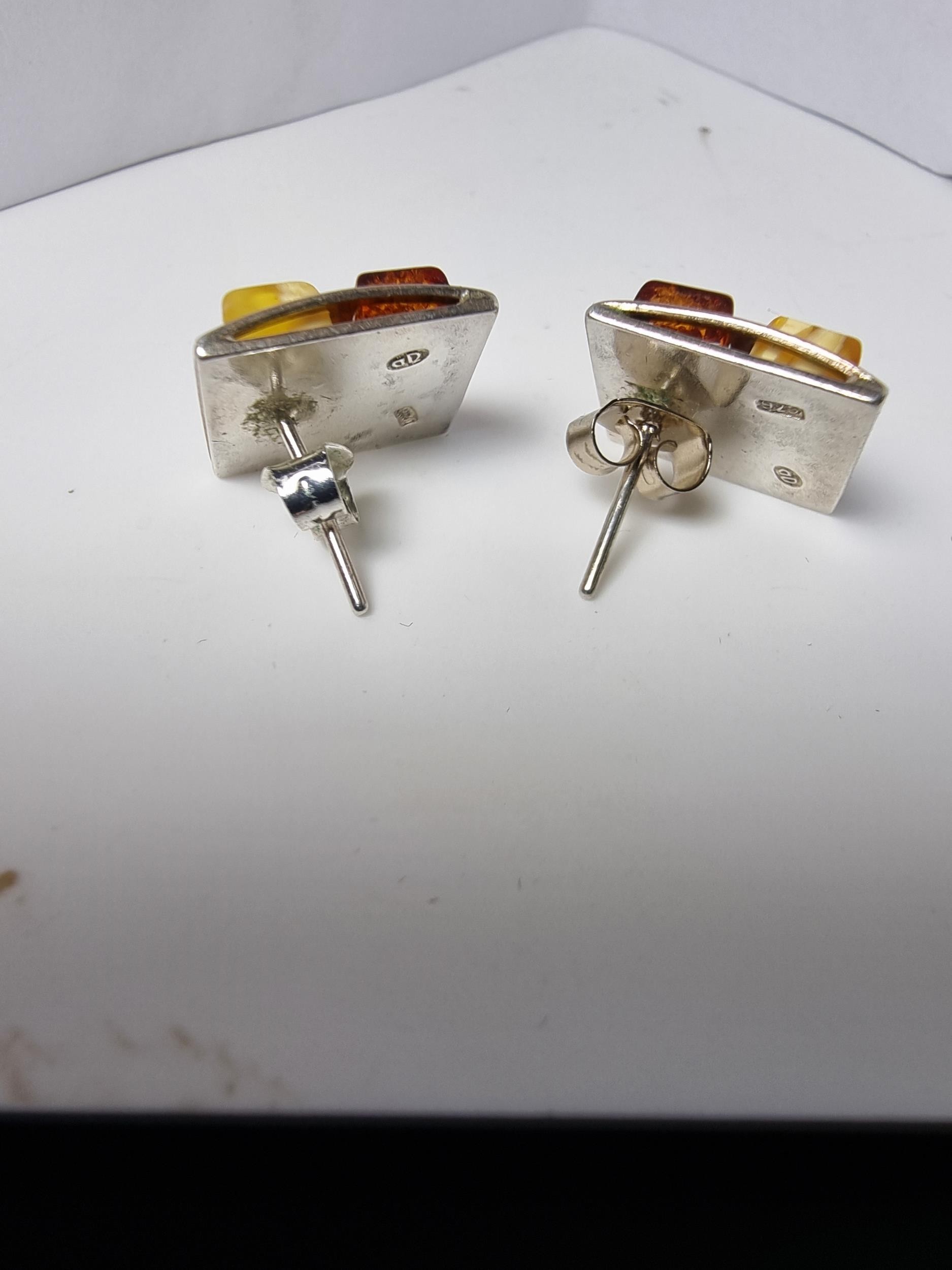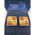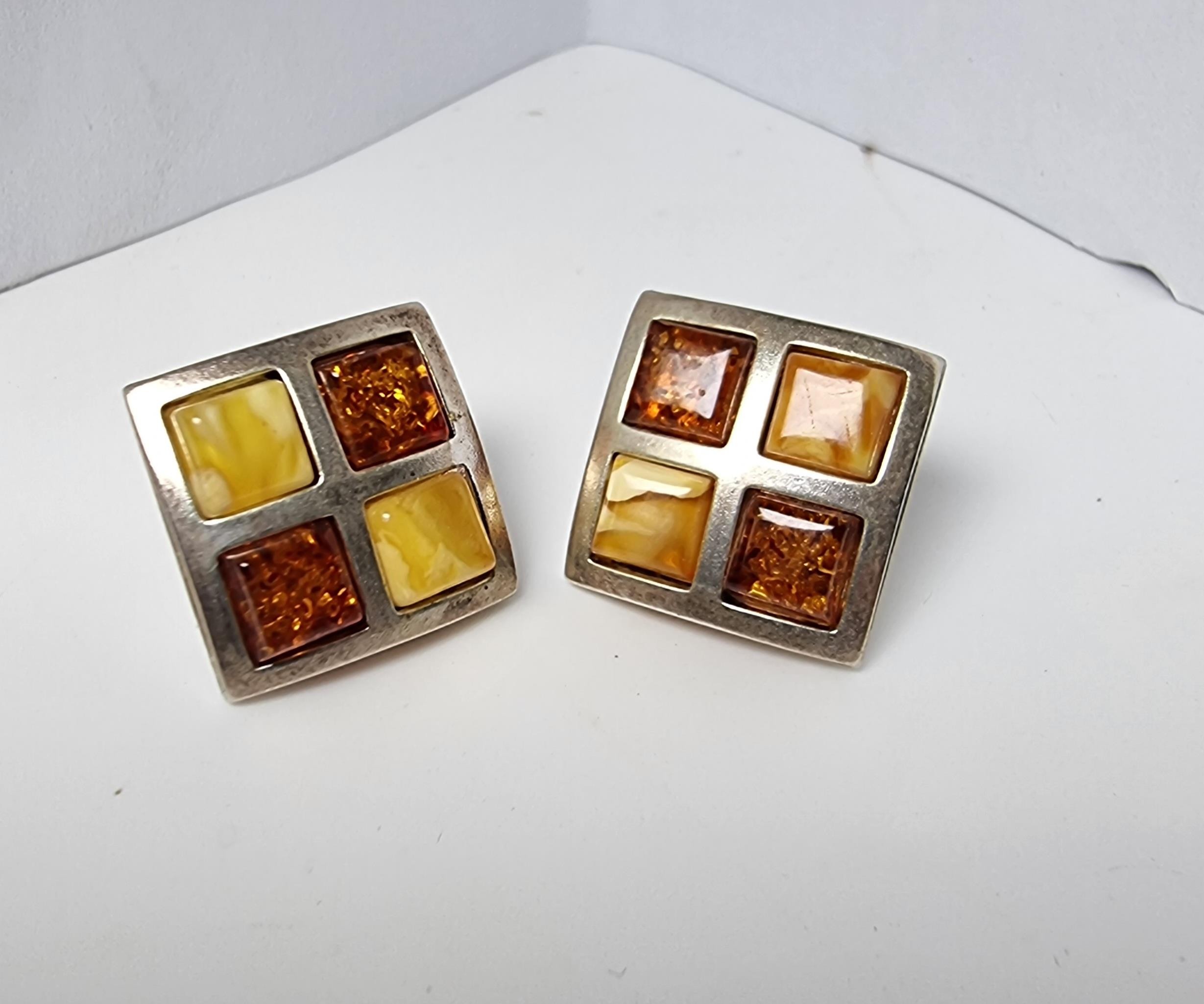 Stunning hallmarked 925 silver square earrings beautifully inset with Butterscotch amber and Baltic amber in a square chequered design. Both in good condition complete with butterfly backs.